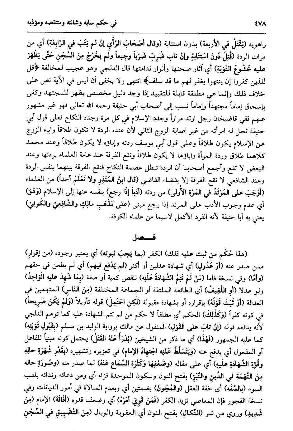 الكفر (بما يجب ثبوته) أي يعتبر وجوده (من إقرار) ممن صدر عنه (أو عدول) أي شهادة عدلين أو أكثر (لم يدفع فيهم) أي لم يطعن في حقهم (وأمّا) وفي نسخة فأما (من لم تتمّ الشّهادة عليه) لنقص كمية أو صفة (بما شهد عليه الواحد) ولو عدلا (أو اللّفيف) أي الطائفة الملتفة أو الجماعة المختلفة (من النّاس) المتهمين في العدالة (أو ثبت قوله) بإقراره أو بشهادة مقبولة (لكن احتمل) قوله تأويلا (ولم يكن صريحا) في كونه كفرا (وكذلك) الحكم أي مطلقا لا حكم من لم تتم الشهادة عليه كما توهم الدلجي لأنه يدفعه قوله (إن تاب على القول) المنقول عن مالك برواية الوليد بن مسلم (بقبول توبته) كما عليه الجمهور (فهذا) أي ما ذكر من الشيخين (يدرأ عنه القتل) يحتمل كونه مبنيا للفاعل أو المفعول أي يدفع عنه (ويتسلّط عليه اجتهاد الإمام) في تعزيره وتشهيره (بقدر شهرة حاله وقوّة الشّهادة عليه) أي على مقاله (وضعفها وكثرة السّماع عنه) لما صدر منه (وصورة حاله من التّهمة في الدّين والنّبز) بفتح النون وسكون الموحدة فزاء أي ومن دعائه وندائه بلقب السوء (بالسّفه) أي خفة العقل (والمجون) بضمتين أي وبعدم المبالاة في أمور الديانات وفي نسخة الفجور فإن المعاصي تزيد الكفر (فمن قوي أمره) أي وضعف قدره (أذاقه) الإمام (من شديد) وروي من شر (النّكال) بفتح النون أي العقوبة والوبال (من التّضييق في السّجن