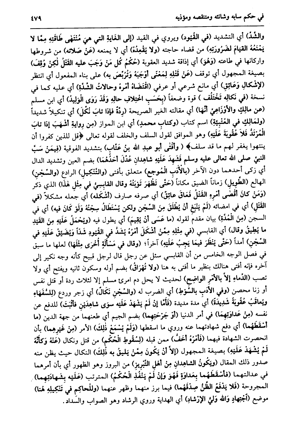 والشّدّ) أي التشديد (في القيود) ويروي في القيد (إلى الغاية التي هي منتهى طاقته ممّا لا يمنعه القيام لضرورته) من قضاء حاجته (ولا يقعده) أي لا يمنعه (عن صلاته) من شروطها واركانها في طاعته (وهو) أي إذاقة شديد العقوبة (حُكْمُ كُلِّ مَنْ وَجَبَ عَلَيْهِ الْقَتْلُ لَكِنْ وقف) بصيغة المجهول أي توقف (عن قتله لمعنى أوجبه وتربّص به) على بناء المفعول أي انتظر (لإشكال وعائق) أي مانع شرعي أو عرفي (اقتضاه أمره وحالات الشّدّة) أي عليه كما في نسخة (في نكاله تختلف) قوة وضعفا (بحسب اختلاف حاله وقد روى الوليد) أي ابن مسلم (عن مالك والأوزاعيّ أنّها) أي مقالته الغير الصريحة (ردّة فإذا تاب نكّل) أي تنكيلا شديدا (ولمالك في العتبيّة) اسم كتاب (وكتاب محمد) أي ابن المواز (مِنْ رِوَايَةِ أَشْهَبَ إِذَا تَابَ الْمُرْتَدُّ فَلَا عقوبة عليه) وهو الموافق لقول السلف والخلف لقوله تَعَالَى قُلْ لِلَّذِينَ كَفَرُوا إِنْ يَنْتَهُوا يُغْفَرْ لَهُمْ ما قَدْ سَلَفَ (وأفتى أبو عبد الله بن عتّاب) بتشديد الفوقية (فيمن سبّ النبيّ صلى الله تعالى عَلَيْهِ وَسَلَّمَ فَشَهِدَ عَلَيْهِ شَاهِدَانِ عُدِّلَ أَحَدُهُمَا) بضم العين وتشديد الدال أي زكى أحدهما دون الآخر (بالأدب الموجع) متعلق بأفتى (والتّنكيل) الرادع (والسّجن) الهالع (الطّويل) زمانا الضيق مكانا (حَتَّى تَظْهَرَ تَوْبَتُهُ وَقَالَ الْقَابِسِيُّ فِي مِثْلِ هذا) الذي ذكر (وَمَنْ كَانَ أَقْصَى أَمْرِهِ الْقَتْلَ فَعَاقَ عَائِقٌ) أي صرفه صارف (أشكله) أي جعله مشكلا (في القتل) أي في امضائه (لم ينبغ أن يطلق من السّجن ولكن يستطال سجنه ولو كان فيه) أي في السجن (من المدّة) بيان مقدم لقوله (ما عسى أن يقيم) أي يطول فيه (وَيُحْمَلَ عَلَيْهِ مِنَ الْقَيْدِ مَا يُطِيقُ وَقَالَ) أي القابسي (فِي مِثْلِهِ مِمَّنْ أَشْكَلَ أَمْرُهُ يُشَدُّ فِي القيود شدّا ويضيّق عليه في السّجن) أمدا (حتّى ينظر فيما يجب عليه) آخرا؛ (وقال في مسألة أخرى مثلها) لعلها ما سبق في فصل الوجه الخامس من أن القابسي سئل عَنْ رَجُلٍ قَالَ لِرَجُلٍ قَبِيحٍ كَأَنَّهُ وَجْهُ نكير إلى آخره فإنه أفتى هنالك بنظير ما أفتى به هنا (ولا تهراق) بضم أوله وسكون ثانيه ويفتح أي ولا تصب (الدّماء إلّا بالأمر الواضح) لحديث لا يحل دم امرئ مسلم إلا لثلاث ردة أو قتل نفس أو زنا محصن (وفي الأدب بالسّوط) أي الضرب له (والسّجن نكال) أي زجر وردع (للسّفهاء ويعاقب عقوبة شديدة) أي مدة مديدة (فَأَمَّا إِنْ لَمْ يَشْهَدْ عَلَيْهِ سِوَى شَاهِدَيْنِ فأثبت) للدفع عن نفسه (من عداوتهما) في أمر الدنيا (أو جرحتهما) بضم الجيم أي طعنهما من جهة الدين (ما أسقطهما) أي دفع شهادتهما عنه وروي ما اسقطها (ولم يسمع ذلك) الأمر (من غيرهما) بأن انحصرت الشهادة فيهما (فأمره أخفّ) ممن قبله (لسقوط الحكم) من قتل ونكال (عنه وكأنّه لم يشهد عليه) بصيغة المجهول (إلّا أن يكون ممّن يليق به ذلك) النكال حيث يظن منه صدور ذلك المقال (ويكون الشاهدان من أهل التّبريز) من البروز وهو الظهور أي بأن أمرهما في عدالتهما (فَأَسْقَطَهُمَا بِعَدَاوَةٍ فَهُوَ وَإِنْ لَمْ يَنْفُذِ الْحُكْمُ) المترتب (عليه بشهادتهما) المجروحة (فلا يدفع الظّنّ صدقهما) فيما برز منهما وظهر عنهما (وللحاكم في تنكيله هنا) موضع (اجتهاد والله وليّ الإرشاد) أي الهداية وروي الرشاد وهو الصواب والسداد.