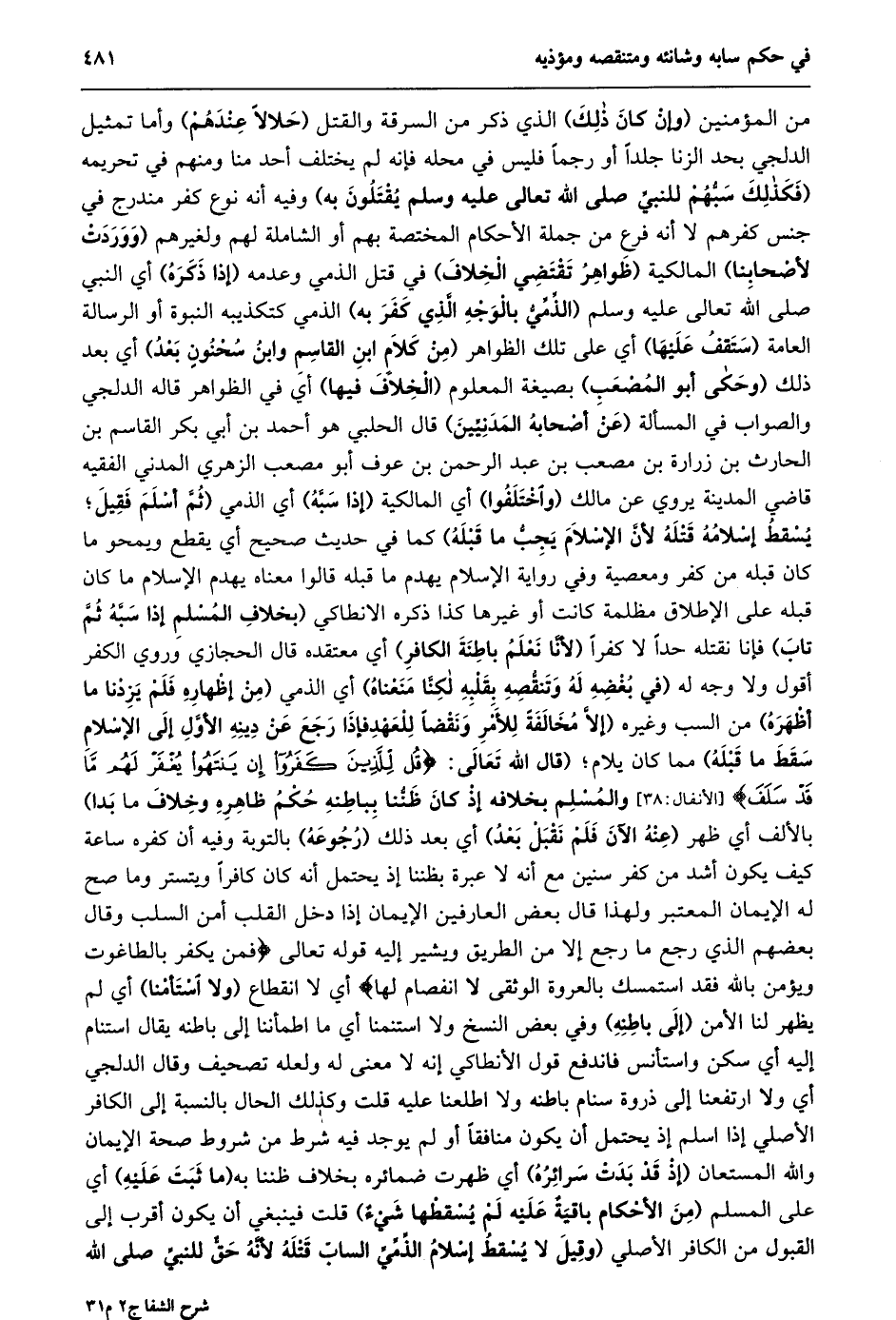 من المؤمنين (وإن كان ذلك) الذي ذكر من السرقة والقتل (حلالا عندهم) وأما تمثيل الدلجي بحد الزنا جلدا أو رجما فليس في محله فإنه لم يختلف أحد منا ومنهم في تحريمه (فكذلك سبّهم للنبيّ صلى الله تعالى عليه وسلم يقتلون به) وفيه أنه نوع كفر مندرج في جنس كفرهم لا أنه فرع من جملة الأحكام المختصة بهم أو الشاملة لهم ولغيرهم (ووردت لأصحابنا) المالكية (ظواهر تقتضي الخلاف) في قتل الذمي وعدمه (إذا ذكره) أي النبي صلى الله تعالى عليه وسلم (الذّمّيّ بالوجه الّذي كفر به) الذمي كتكذيبه النبوة أو الرسالة العامة (ستقف عليها) أي على تلك الظواهر (مِنْ كَلَامِ ابْنِ الْقَاسِمِ وَابْنِ سُحْنُونٍ بَعْدُ) أي بعد ذلك (وحكى أبو المصعب) بصيغة المعلوم (الخلاف فيها) أي في الظواهر قاله الدلجي والصواب في المسألة (عن أصحابه المدنيّين) قال الحلبي هو أحمد بن أبي بكر القاسم بن الحارث بن زرارة بن مصعب بن عبد الرحمن بن عوف أبو مصعب الزهري المدني الفقيه قاضي المدينة يروي عن مالك (واختلفوا) أي المالكية (إذا سبّه) أي الذمي (ثُمَّ أَسْلَمَ فَقِيلَ؛ يُسْقِطُ إِسْلَامُهُ قَتْلَهُ لِأَنَّ الإسلام يجبّ ما قبله) كما في حديث صحيح أي يقطع ويمحو ما كان قبله من كفر ومعصية وفي رواية الإسلام يهدم ما قبله قالوا معناه يهدم الإسلام ما كان قبله على الإطلاق مظلمة كانت أو غيرها كذا ذكره الانطاكي (بخلاف المسلم إذا سبّه ثمّ تاب) فإنا نقتله حدا لا كفرا (لأنّا نعلم باطنة الكافر) أي معتقده قال الحجازي وروي الكفر أقول ولا وجه له (في بعضه له وتنقّصه بقلبه لكنّا منعناه) أي الذمي (من إظهاره فلم يزدنا ما أظهره) من السب وغيره (إِلَّا مُخَالَفَةً لِلْأَمْرِ وَنَقْضًا لِلْعَهْدِ فَإِذَا رَجَعَ عَنْ دِينِهِ الْأَوَّلِ إِلَى الْإِسْلَامِ سَقَطَ مَا قبله) مما كان يلام؛ (قَالَ اللَّهُ تَعَالَى: قُلْ لِلَّذِينَ كَفَرُوا إِنْ يَنْتَهُوا يُغْفَرْ لَهُمْ مَا قَدْ سَلَفَ [الْأَنْفَالِ: 38] وَالْمُسْلِمُ بِخِلَافِهِ إِذْ كَانَ ظَنُّنَا بِبَاطِنِهِ حُكْمَ ظاهره وخلاف ما بدا) بالألف أي ظهر (عنه الآن فلم نقبل بعد) أي بعد ذلك (رجوعه) بالتوبة وفيه أن كفره ساعة كيف يكون أشد من كفر سنين مع أنه لا عبرة بظننا إذ يحتمل أنه كان كافرا ويتستر وما صح له الإيمان المعتبر ولهذا قال بعض العارفين الإيمان إذا دخل القلب أمن السلب وقال بعضهم الذي رجع ما رجع إلا من الطريق ويشير إليه قوله تعالى فَمَنْ يَكْفُرْ بِالطَّاغُوتِ وَيُؤْمِنْ بِاللَّهِ فَقَدِ اسْتَمْسَكَ بِالْعُرْوَةِ الْوُثْقى لَا انْفِصامَ لَها أي لا انقطاع (ولا استأمنا) أي لم يظهر لنا الأمن (إلى باطنه) وفي بعض النسخ ولا استنمنا أي ما اطمأننا إلى باطنه يقال استنام إليه أي سكن واستأنس فاندفع قول الأنطاكي إنه لا معنى له ولعله تصحيف وقال الدلجي أي ولا ارتفعنا إلى ذروة سنام باطنه ولا اطلعنا عليه قلت وكذلك الحال بالنسبة إلى الكافر الأصلي إذا اسلم إذ يحتمل أن يكون منافقا أو لم يوجد فيه شرط من شروط صحة الإيمان والله المستعان (إذ قد بدت سرائره) أي ظهرت ضمائره بخلاف ظننا به (ما ثبت عليه) أي على المسلم (من الأحكام باقية عليه لم يسقطها شيء) قلت فينبغي أن يكون أقرب إلى القبول من الكافر الأصلي (وَقِيلَ لَا يُسْقِطُ إِسْلَامُ الذِّمِّيِّ السَّابِّ قَتْلَهُ لأنّه حقّ للنبيّ صلى الله