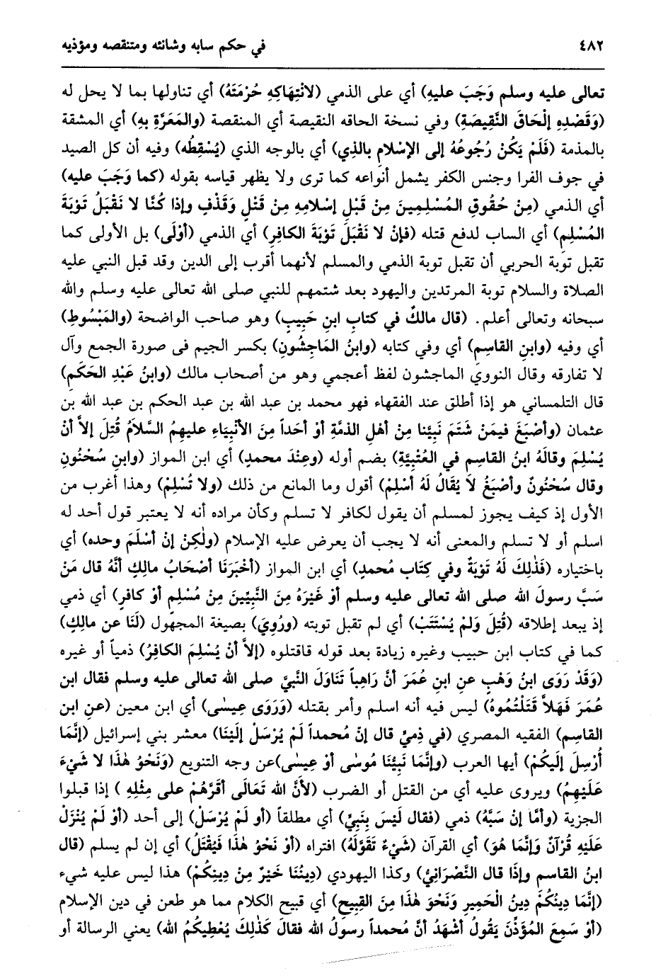 تعالى عليه وسلم وجب عليه) أي على الذمي (لانتهاكه حرمته) أي تناولها بما لا يحل له (وقصده إلحاق النّقيصة) وفي نسخة الحاقه النقيصة أي المنقصة (والمعرّة به) أي المشقة بالمذمة (فلم يكن رجوعه إلى الإسلام بالذي) أي بالوجه الذي (يسقطه) وفيه أن كل الصيد في جوف الفرا وجنس الكفر يشمل أنواعه كما ترى ولا يظهر قياسه بقوله (كما وجب عليه) أي الذمي (مِنْ حُقُوقِ الْمُسْلِمِينَ مِنْ قَبْلِ إِسْلَامِهِ مِنْ قَتْلٍ وَقَذْفٍ وَإِذَا كُنَّا لَا نَقْبَلُ تَوْبَةَ المسلم) أي الساب لدفع قتله (فإن لا نقبل توبة الكافر) أي الذمي (أولى) بل الأولى كما تقبل توبة الحربي أن تقبل توبة الذمي والمسلم لأنهما أقرب إلى الدين وقد قبل النبي عليه الصلاة والسلام توبة المرتدين واليهود بعد شتمهم للنبي صلى الله تعالى عليه وسلم والله سبحانه وتعالى أعلم. (قال مالك في كتاب ابن حبيب) وهو صاحب الواضحة (والمبسوط) أي وفيه (وابن القاسم) أي وفي كتابه (وابن الماجشون) بكسر الجيم فى صورة الجمع وآل لا تفارقه وقال النووي الماجشون لفظ أعجمي وهو من أصحاب مالك (وابن عبد الحكم) قال التلمساني هو إذا أطلق عند الفقهاء فهو محمد بن عبد الله بن عبد الحكم بن عبد الله بن عثمان (وَأَصْبَغَ فِيمَنْ شَتَمَ نَبِيَّنَا مِنْ أَهْلِ الذِّمَّةِ أَوْ أَحَدًا مِنَ الْأَنْبِيَاءِ عَلَيْهِمُ السَّلَامُ قُتِلَ إِلَّا أَنْ يُسْلِمَ وَقَالَهُ ابْنُ الْقَاسِمِ فِي العتبيّة) بضم أوله (وعند محمد) أي ابن المواز (وَابْنِ سُحْنُونٍ وَقَالَ سُحْنُونٌ وَأَصْبَغُ لَا يُقَالُ له أسلم) أقول وما المانع من ذلك (ولا تسلم) وهذا أغرب من الأول إذ كيف يجوز لمسلم أن يقول لكافر لا تسلم وكأن مراده أنه لا يعتبر قول أحد له اسلم أو لا تسلم والمعنى أنه لا يجب أن يعرض عليه الإسلام (ولكن إن أسلم وحده) أي باختياره (فذلك له توبة وفي كتاب محمد) أي ابن المواز (أَخْبَرَنَا أَصْحَابُ مَالِكٍ أَنَّهُ قَالَ مَنْ سَبَّ رسول الله صلى الله تعالى عَلَيْهِ وَسَلَّمَ أَوْ غَيْرَهُ مِنَ النَّبِيِّينَ مِنْ مسلم أو كافر) أي ذمي إذ يبعد إطلاقه (قتل ولم يستتب) أي لم تقبل توبته (وروي) بصيغة المجهول (لنا عن مالك) كما في كتاب ابن حبيب وغيره زيادة بعد قوله قاقتلوه (إلّا أن يسلم الكافر) ذميا أو غيره (وَقَدْ رَوَى ابْنُ وَهْبٍ عَنِ ابْنِ عُمَرَ أنّ راهبا تناول النّبيّ صلى الله تعالى عَلَيْهِ وَسَلَّمَ فَقَالَ ابْنُ عُمَرَ فَهَلَّا قَتَلْتُمُوهُ) ليس فيه أنه اسلم وأمر بقتله (وروى عيسى) أي ابن معين (عن ابن القاسم) الفقيه المصري (فِي ذَمِّيٍّ قَالَ إِنَّ مُحَمَّدًا لَمْ يُرْسَلْ إلينا) معشر بني إسرائيل (إنّما أرسل إليكم) أيها العرب (وإنّما نبيّنا موسى أو عيسى) عن وجه التنويع (ونحو هذا لا شيء عليهم) ويروى عليه أي من القتل أو الضرب (لأنّ الله تعالى أقرّهم على مثله) إذا قبلوا الجزية (وأمّا إن سبّه) ذمي (فقال ليس بنبيّ) أي مطلقا (أو لم يرسل) إلى أحد (أَوْ لَمْ يَنْزِلْ عَلَيْهِ قُرْآنٌ وَإِنَّمَا هُوَ) أي القرآن (شيء تقوّله) افتراه (أو نحو هذا فيقتل) أي إن لم يسلم (قال ابن القاسم وإذا قال النّصرانيّ) وكذا اليهودي (ديننا خير من دينكم) هذا ليس عليه شيء (إنّما دِينُكُمْ دِينُ الْحَمِيرِ وَنَحْوُ هَذَا مِنَ الْقَبِيحِ) أي قبيح الكلام مما هو طعن في دين الإسلام (أَوْ سَمِعَ الْمُؤَذِّنَ يَقُولُ أَشْهَدُ أَنَّ مُحَمَّدًا رسول الله فقال كذلك يعطيكم الله) يعني الرسالة أو