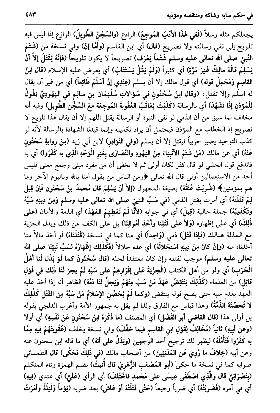 يجعلكم مثله رسلا (ففي هذا الأدب الموجع) الرادع (والسّجن الطّويل) الوازع إذا ليس فيه تلويح إلى نفي رسالته ولا تصريح (قال) أي ابن القاسم (وأمّا إن) وفي نسخة من (شتم النّبيّ صلى الله تعالى عليه وسلم شتما يعرف) تصريحا لا يكون تلويحا (فَإِنَّهُ يُقْتَلُ إِلَّا أَنْ يُسْلِمَ قَالَهُ مَالِكٌ غير مرّة) أي كثيرا (ولم يقل يستتاب) أي يعرض عليه الإسلام (قال ابن القاسم ومحمل قوله) أي قول مالك إلا أن يسلم (عندي إن أسلم طائعا) أي من غير أن يقال له اسلم وإلا تقتل، (وَقَالَ ابْنُ سُحْنُونٍ فِي سُؤَالَاتِ سُلَيْمَانَ بْنِ سَالِمٍ فِي الْيَهُودِيِّ يَقُولُ لِلْمُؤَذِّنِ إِذَا تَشَهَّدَ) أي بالرسالة (كَذَبْتَ يُعَاقَبُ الْعُقُوبَةَ الْمُوجِعَةَ مَعَ السِّجْنِ الطَّوِيلِ) وفيه أنه مخالف لما سبق من أن الذمي لو نفى النبوة أو الرسالة يقتل اللهم إلا أن يقال هذا تلويح لا تصريح إذ الخطاب مع المؤذن فيحتمل أن يراد تكذيبه وإنما قيدنا الشهادة بالرسالة لأنه لو كذب التوحيد يصير حربيا فيقتل إلا أن يسلم (وفي النّوادر) لابن أبي زيد (من رواية سحنون عنه) أي عن مالك (مَنْ شَتَمَ الْأَنْبِيَاءَ مِنَ الْيَهُودِ وَالنَّصَارَى بِغَيْرِ الوجه الّذي به كفروا) أي به فاندفع قول الحلبي لو قال كفر لكان أولى ثم لا يخفى أن من مفرد مبنى وجمع معنى فليس أحد من الاستعمالين أولى قال الله تعالى وَمِنَ النَّاسِ مَنْ يَقُولُ آمَنَّا بِاللَّهِ وَبِالْيَوْمِ الْآخِرِ وَما هُمْ بِمُؤْمِنِينَ (ضربت عنقه) بصيغة المجهول (إِلَّا أَنْ يُسْلِمَ قَالَ مُحَمَّدُ بْنُ سُحْنُونٍ فإن قيل لم قتلته) أي أمرت بقتل الذمي (في سبّ النبيّ صلى الله تعالى عليه وسلم ومن دينه سبّه وتكذيبه) جملة حالية (قيل) أي في جوابه (لأنّا لم نعطهم العهد) أي الذمة والأمان (على ذلك) أي على إظهاره (ولا على قتلنا وأخذ أموالنا) بل على الكف عن ذلك وبذل الجزية مع المذلة هنالك (فإذا قتل) ذمي (واحدا) أي منا كما في نسخة (قتلناه) أو أخذ مالا منا أخذناه منه (وإن كان من دينه استحلاله) أي عده حلالا (فكذلك إظهاره لسبّ نبيّنا صلى الله تعالى عليه وسلم) موجب لقتله وإن كان معتقدا لحله (قَالَ سُحْنُونٌ كَمَا لَوْ بَذَلَ لَنَا أَهْلُ الحرب) أي ولو من أهل الكتاب (الْجِزْيَةَ عَلَى إِقْرَارِهِمْ عَلَى سَبِّهِ لَمْ يَجُزْ لنا ذلك في قول قائل) من العلماء (كَذَلِكَ يَنْتَقِضُ عَهْدُ مَنْ سَبَّ مِنْهُمْ وَيَحِلُّ لنا دمه) الظاهر أنه إذا أخذ عليه العهد بعدم سبه حتى يصح قوله ينتقض (وكما لَمْ يُحْصِنِ الْإِسْلَامُ مَنْ سَبَّهُ مِنَ الْقَتْلِ كذلك لا تحصّنه الذّمّة) وهذا قياس مع الفارق ولذا لم يقل به جمهور الأمة وأغرب الدلجي بقوله بل أولى هذا (قال القاضي أبو الفضل) أي المنصف (ما ذكره ابن سحنون عن نفسه) أي أولا (وعن أبيه) ثانيا (مخالف لقول ابن القاسم فيما خفّف) وفي نسخة يخفف (عقوبتهم فيه ممّا به كفروا فتأمّله) ليظهر لك ترجيح أحد الوجهين (ويدلّ على أنه) أي ما قاله ابن سحنون عنه وعن أبيه (خلاف ما روي عن المدنيّين) من أصحاب مالك (في ذلك فحكى) قال التلمساني صوابه كما في نسخة ما حكى (أبو المصعب الزّهريّ قال أتيت) بضم الهمزة وتاء المتكلم (بِنَصْرَانِيٍّ قَالَ وَالَّذِي اصْطَفَى عِيسَى عَلَى مُحَمَّدٍ فاختلف) أي الرأي (عليّ) أي عندي (فيه) أي في أمره (فضربته) أي ضربا وجيعا (حتّى قتلته أو عاش) بعد ضربه (يوما وليلة وأمرت