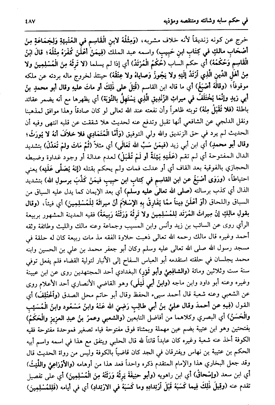خرج عن كونه زنديقا لأنه خلاف مشربه، (وَمِثْلُهُ لِابْنِ الْقَاسِمِ فِي الْعُتْبِيَّةِ وَلِجَمَاعَةٍ مِنْ أصحاب مالك في كتاب ابن حبيب) واسمه عبد الملك (فِيمَنْ أَعْلَنَ كُفْرَهُ مِثْلُهُ؛ قَالَ ابْنُ الْقَاسِمِ وحكمه) أي حكم الساب (حكم المرتدّ) أي إذا لم يسلما (لا ترثه مِنَ الْمُسْلِمِينَ وَلَا مِنْ أَهْلِ الدِّينِ الَّذِي ارتدّ إليه ولا يجوز وصاياه ولا عتقه) حينئذ لخروج ماله بردته عن ملكه موقوفا؛ (وقاله أصبغ) أي ما قاله ابن القاسم (قُتِلَ عَلَى ذَلِكَ أَوْ مَاتَ عَلَيْهِ وَقَالَ أَبُو مُحَمَّدِ بْنُ أَبِي زَيْدٍ وَإِنَّمَا يُخْتَلَفُ في ميراث الزّنديق الّذي يستهلّ بالتّوبة) أي يظهرها مع أنه يضمر عقائد باطلة (فلا تقبل منه) توبته ظاهرا وأن نفعته عند الله تعالى لو كان صادقا وهذا موافق لمذهبنا ونقل الدلجي عن الشافعي أنها تقبل وتدفع عنه لحديث هلا شققت عن قبله انتهى وفيه أن الحديث لم يرد في حق الزنديق والله ولي التوفيق (وأمّا الْمُتَمَادِي فَلَا خِلَافَ أَنَّهُ لَا يُورَثُ؛ وَقَالَ أبو محمد) أي ابن أبي زيد (فيمن سبّ الله تعالى) أي مثلا (ثمّ مات ولم تعدّل) بتشديد الدال المفتوحة أي لم تقم (عليه بيّنة أو لم تقبل) لعدم عدالة أو وجود غداوة وضبطه الحجازي بالفوقية بعد القاف أي أو عدلت فمات ولم يحكم بقتله (إنه يصلّى عليه) يعني احتياطا، (وَرَوَى أَصْبَغُ عَنِ ابْنِ الْقَاسِمِ فِي كِتَابِ ابن حبيب فيمن كذّب برسول الله) بتشديد الذال أي كذب برسالته (صلى الله تعالى عليه وسلم) أي بعد الإيمان كما يدل عليه السياق من السباق واللحاق (أو أعلن دِينًا مِمَّا يُفَارِقُ بِهِ الْإِسْلَامَ أَنَّ مِيرَاثَهُ للمسلمين) أي فيئا، (وَقَالَ بِقَوْلِ مَالِكٍ إِنَّ مِيرَاثَ الْمُرْتَدِّ لِلْمُسْلِمِينَ ولا ترثه ورثته ربيعة) فقيه المدينة المشهور بربيعة الرأي روى عن السائب بن زيد وأنس وابن المسيب وجماعة وعنه مالك والليث وطائفة وثقه أحمد وغيره قال مالك رحمه الله تعالى ذهبت حلاوة الفقه مذ مات ربيعة كان له حلقة في مسجد رسول الله صلى الله تعالى عليه وسلم وكان أَبُو جَعْفَرٍ مُحَمَّدُ بْنُ عَلِيِّ بْنِ الْحُسَيْنِ وابنه محمد يجلسان في حلقته استقدمه أبو العباس السفاح إلى الأنبار لتولية القضاء فلم يفعل توفي سنة ست وثلاثين ومائة (والشافعيّ وأبو ثور) البغدادي أحد المجتهدين روى عن ابن عيينة وغيره وعنه أبو داود وابن ماجه (وابن أبي ليلى) وهو القاضي الأنصاري أحد الأعلام روى عن الشعبي وعنه شعبة قال أحمد سيىء الحفظ وقال أبو حاتم محل الصدق (واختلف) أي القول (فِيهِ عَنْ أَحْمَدَ وَقَالَ عَلِيُّ بْنُ أَبِي طَالِبٍ رَضِيَ اللَّهُ عَنْهُ وَابْنُ مَسْعُودٍ وَابْنُ المسيّب والحسن) أي البصري وكلاهما من أفاضل التابعين (والشعبي وعمر بن عبد العزيز والحكم) بفتحتين وهو ابن عتيبة بضم عين مهملة وبمثناة فوق مفتوحة فياء تصغير فموحدة مفتوحة فقيه الكوفة أخذ عنه شعبة وغيره كان عابدا قانتا لله قال الحلبي ويتفق مع هذا في اسمه واسم أبيه الحكم بن عتيبة بن نهاس ويفترقان في الجد كان قاضيا بالكوفة وليس من رواة الحديث قال وقد جعل البخاري هذا والإمام المتقدم ذكره واحدا فعد هذا من أوهامه (والأوزاعيّ واللّيث) أي ابن سعد (وإسحاق) أي ابن راهويه (وأبو حنيفة يرثه ورثته من المسلمين) أي على تفصيل تقدم عنه (وَقِيلَ ذَلِكَ فِيمَا كَسَبَهُ قَبْلَ ارْتِدَادِهِ وَمَا كسبه في الارتداد) أي في أيامه (فللمسلمين)