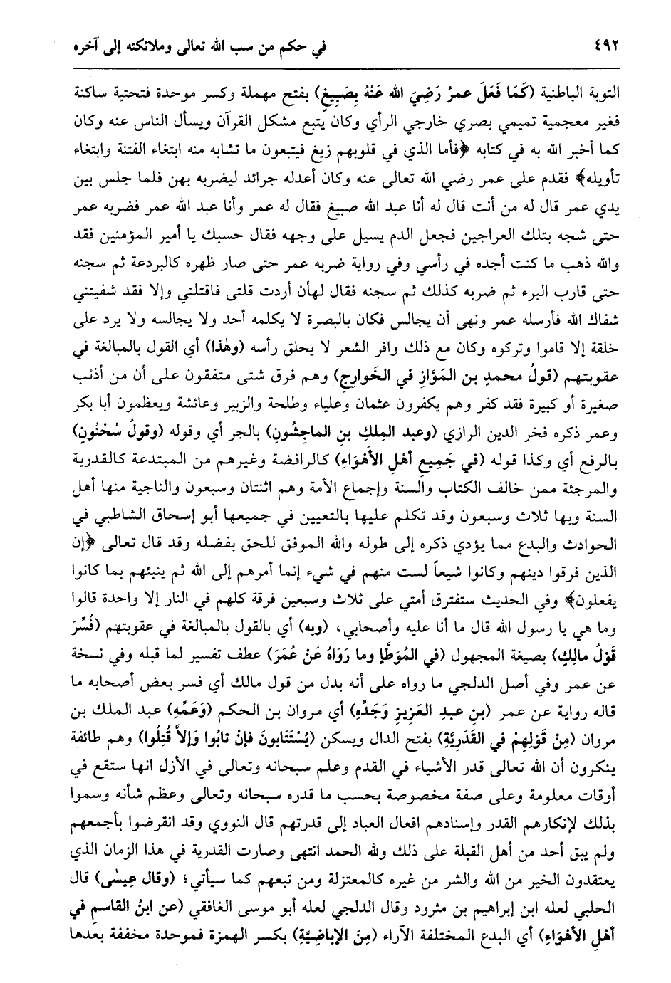 التوبة الباطنية (كَمَا فَعَلَ عُمَرُ رَضِيَ اللَّهُ عَنْهُ بِصَبِيغٍ) بفتح مهملة وكسر موحدة فتحتية ساكنة فغير معجمية تميمي بصري خارجي الرأي وكان يتبع مشكل القرآن ويسأل الناس عنه وكان كما أخبر الله به في كتابه فَأَمَّا الَّذِينَ فِي قُلُوبِهِمْ زَيْغٌ فَيَتَّبِعُونَ ما تَشابَهَ مِنْهُ ابْتِغاءَ الْفِتْنَةِ وَابْتِغاءَ تَأْوِيلِهِ فقدم على عمر رضي الله تعالى عنه وكان أعدله جرائد ليضربه بهن فلما جلس بين يدي عمر قال له من أنت قال له أنا عبد الله صبيغ فقال له عمر وأنا عبد الله عمر فضربه عمر حتى شجه بتلك العراجين فجعل الدم يسيل على وجهه فقال حسبك يا أمير المؤمنين فقد والله ذهب ما كنت أجده في رأسي وفي رواية ضربه عمر حتى صار ظهره كالبردعة ثم سجنه حتى قارب البرء ثم ضربه كذلك ثم سجنه فقال لهأن أردت قلتى فاقتلني وإلا فقد شفيتني شفاك الله فأرسله عمر ونهى أن يجالس فكان بالبصرة لا يكلمه أحد ولا يجالسه ولا يرد على خلقة إلا قاموا وتركوه وكان مع ذلك وافر الشعر لا يحلق رأسه (وهذا) أي القول بالمبالغة في عقوبتهم (قول محمد بن الموّاز في الخوارج) وهم فرق شتى متفقون على أن من أذنب صغيرة أو كبيرة فقد كفر وهم يكفرون عثمان وعلياء وطلحة والزبير وعائشة ويعظمون أبا بكر وعمر ذكره فخر الدين الرازي (وعبد الملك بن الماجشون) بالجر أي وقوله (وقول سحنون) بالرفع أي وكذا قوله (في جميع أهل الأهواء) كالرافضة وغيرهم من المبتدعة كالقدرية والمرجئة ممن خالف الكتاب والسنة وإجماع الأمة وهم اثنتان وسبعون والناجية منها أهل السنة وبها ثلاث وسبعون وقد تكلم عليها بالتعيين في جميعها أبو إسحاق الشاطبي في الحوادث والبدع مما يؤدي ذكره إلى طوله والله الموفق للحق بفضله وقد قال تعالى إِنَّ الَّذِينَ فَرَّقُوا دِينَهُمْ وَكانُوا شِيَعاً لَسْتَ مِنْهُمْ فِي شَيْءٍ إِنَّما أَمْرُهُمْ إِلَى اللَّهِ ثُمَّ يُنَبِّئُهُمْ بِما كانُوا يَفْعَلُونَ وفي الحديث ستفترق أمتي على ثلاث وسبعين فرقة كلهم في النار إلا واحدة قالوا وما هي يا رسول الله قال ما أنا عليه وأصحابي، (وبه) أي بالقول بالمبالغة في عقوبتهم (فسّر قول مالك) بصيغة المجهول (في الموطّإ وما رواه عن عمر) عطف تفسير لما قبله وفي نسخة عن عمر وفي أصل الدلجي ما رواه على أنه بدل من قول مالك أي فسر بعض أصحابه ما قاله رواية عن عمر (بن عبد العزيز وجدّه) أي مروان بن الحكم (وعمّه) عبد الملك بن مروان (من قولهم في القدريّة) بفتح الدال ويسكن (يستتابون فإن تابوا وإلّا قتلوا) وهم طائفة ينكرون أن الله تعالى قدر الأشياء في القدم وعلم سبحانه وتعالى في الأزل انها ستقع في أوقات معلومة وعلى صفة مخصوصة بحسب ما قدره سبحانه وتعالى وعظم شأنه وسموا بذلك لإنكارهم القدر وإسنادهم افعال العباد إلى قدرتهم قال النووي وقد انقرضوا بأجمعهم ولم يبق أحد من أهل القبلة على ذلك ولله الحمد انتهى وصارت القدرية في هذا الزمان الذي يعتقدون الخير من الله والشر من غيره كالمعتزلة ومن تبعهم كما سيأتي؛ (وقال عيسى) قال الحلبي لعله ابن إبراهيم بن مثرود وقال الدلجي لعله أبو موسى الغافقي (عن ابن القاسم في أهل الأهواء) أي البدع المختلفة الآراء (من الإباضيّة) بكسر الهمزة فموحدة مخففة بعدها