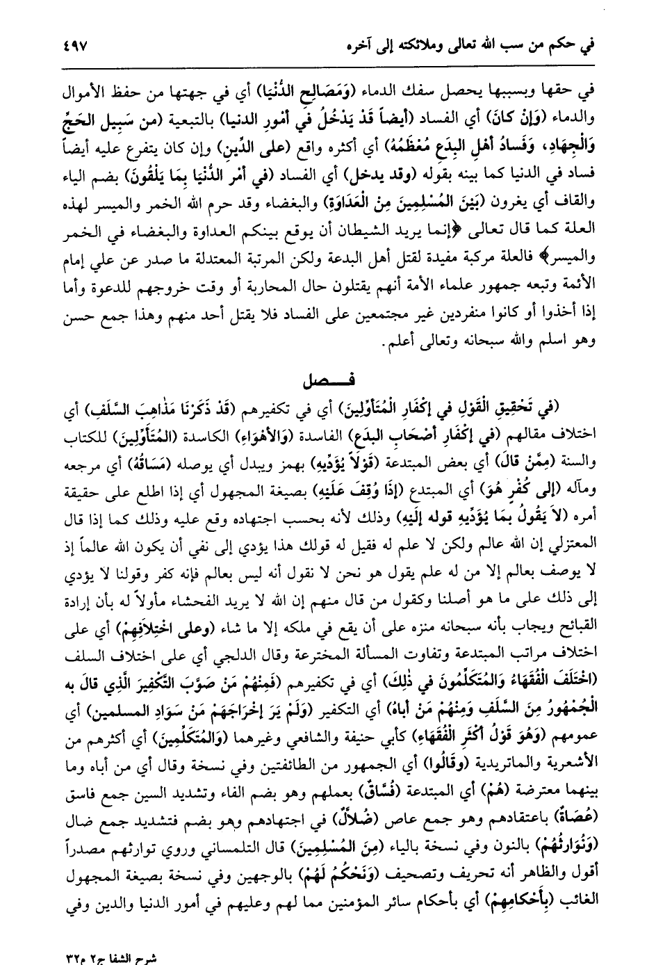 (في تحقيق القول في إكفار المتأوّلين) أي في تكفيرهم (قد ذكرنا مذاهب السّلف) أي اختلاف مقالهم (في إكفار أصحاب البدع) الفاسدة (والأهواء) الكاسدة (المتأوّلين) للكتاب والسنة (ممّن قال) أي بعض المبتدعة (قولا يؤدّيه) بهمز ويبدل أي يوصله (مساقه) أي مرجعه ومآله (إلى كفر هو) أي المبتدع (إذا وقف عليه) بصيغة المجهول أي إذا اطلع على حقيقة أمره (لا يقول بما يؤدّيه قوله إليه) وذلك لأنه بحسب اجتهاده وقع عليه وذلك كما إذا قال المعتزلي إن الله عالم ولكن لا علم له فقيل له قولك هذا يؤدي إلى نفي أن يكون الله عالما إِذْ لَا يُوصَفُ بِعَالِمٍ إِلَّا مَنْ لَهُ علم يقول هو نحن لا نقول أنه ليس بعالم فإنه كفر وقولنا لا يؤدي إلى ذلك على ما هو أصلنا وكقول من قال منهم إن الله لا يريد الفحشاء مأولا له بأن إرادة القبائح ويجاب بأنه سبحانه منزه على أن يقع في ملكه إلا ما شاء (وعلى اختلافهم) أي على اختلاف مراتب المبتدعة وتفاوت المسألة المخترعة وقال الدلجي أي على اختلاف السلف (اختلف الفقهاء والمتكلّمون في ذلك) أي في تكفيرهم (فَمِنْهُمْ مَنْ صَوَّبَ التَّكْفِيرَ الَّذِي قَالَ بِهِ الجمهور من السّلف ومنهم من أباه) أي التكفير (ولم ير إخراجهم من سواد المسلمين) أي عمومهم (وهو قول أكثر الفقهاء) كأبي حنيفة والشافعي وغيرهما (والمتكلّمين) أي أكثرهم من الأشعرية والماتريدية (وقالوا) أي الجمهور من الطائفتين وفي نسخة وقال أي من أباه وما بينهما معترضة (هم) أي المبتدعة (فسّاق) بعلمهم وهو بضم الفاء وتشديد السين جمع فاسق (عصاة) باعتقادهم وهو جمع عاص (ضلّال) في اجتهادهم وهو بضم فتشديد جمع ضال (ونوارثهم) بالنون وفي نسخة بالياء (من المسلمين) قال التلمساني وروي توارثهم مصدرا أقول والظاهر أنه تحريف وتصحيف (ونحكم لهم) بالوجهين وفي نسخة بصيغة المجهول الغائب (بأحكامهم) أي بأحكام سائر المؤمنين مما لهم وعليهم في أمور الدنيا والدين وفي