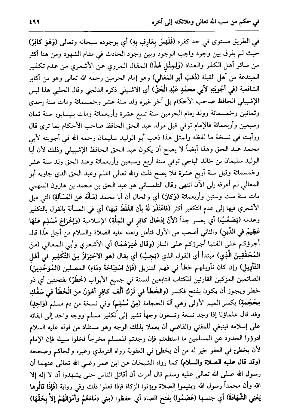 في الطريق مستوى في حد كفره (فليس بعارف به) أي بوجوده سبحانه وتعالى (وهو كافر) حيث لم يفرق بين وجود واجب الوجود وبين وجود الحادث في مقام الشهود ومن هنا أكثر من سائر أهل الكفر والعناد (ولمثل هذا) المقال المروي عن الأشعري من عدم تكفير المبتدعة من أهل القبلة (ذهب أبو المعالي) وهو إمام الحرمين رحمه الله تعالى وهو من أكابر الشافعية (في أجوبته لأبي محمّد عبد الحقّ) أي الاشبيلي ذكره الدلجي وقال الحلبي هذا ليس الإشبيلي الحافظ صاحب الأحكام بل آخر غيره ولد سنة عشر وخمسمائة ومات سنة إحدى وثمانين وخمسائة وولد إمام الحرمين سنة تسع عشرة وأربعمائة ومات بنيسابور سنة ثمان وسبعين وأربعمائة فالإمام توفي قبل مولد عبد الحق الحافظ صاحب الأحكام بما ترى قال ورأيت في نسخة ما لفظه ولمثل هذا ذهب أبو الوليد سليمان رَحِمَهُ اللَّهُ فِي أَجْوِبَتِهِ لِأَبِي مُحَمَّدٍ عَبْدِ الحق وهذا أيضا لا يصح أن يكون عبد الحق الحافظ الإشبيلي وذلك لأن أبا الوليد سليمان بن خالد الباجي توفي سنة أربع وسبعين وأربعمائة وعبد الحق ولد سنة عشر وخمسمائة وقيل سنة أربع عشرة فلا يصح ذلك والله تعالى اعلم وعبد الحق الذي جاوبه أبو المعالي لم أعرفه إلى الآن انتهى وقال التلمساني هو عبد الحق بن محمد بن هارون السهمي مات سنة ست وستين وأربعمائة (وكان) أي والحال أن أبا محمد (سأله عن المسألة) التي ميل الأشعري فيها إلى عدم التكفير أكثر (فاعتذر له بأن الغلط فيها) أي في المسألة بالقول بالتكفير وعدمه (يصعب) أي يعسر جدا (لأنّ إدخال كافر في الملّة) الإسلامية (وإخراج مسلم عنها عظيم في الدّين) والثاني أصعب من الأول فتأمل ولعله عليه الصلاة والسلام من أجل هذا قال أجرؤكم على الفتيا أجرؤكم على النار (وقال غيرهما) أي الأشعري وأبي المعالي (من المحقّقين الّذي) مبتدأ أي القول الذي (يجب) أي يقال (هو الاحتراز من التّكفير في أهل التّأويل) وإن كان تأويلهم خطأ في فهم التنزيل (فإنّ استباحة دماء) المصلين (الموحّدين) الصائمين المزكين القارئين للكتاب التابعين للسنة في جميع الأبواب (خطر) بفتحتين أي ذو خطر ويجوز أن يكون بفتح فكسر (وَالْخَطَأُ فِي تَرْكِ أَلْفِ كَافِرٍ أَهْوَنُ مِنَ الخطأ في سفك محجمة) بكسر الميم الأولى وهي آلة الحجامة (من مسلم) وفي نسخة من دم مسلم (واحد) وقد قال علماؤنا إذا وجد تسعة وتسعون وجها تشير إلى تكفير مسلم ووجه واحد إلى ابقائه على إسلامه فينبغي للمفتي والقاضي أن يعملا بذلك الوجه وهو مستفاد من قوله عليه السلام ادرؤوا الحدود عن المسلمين ما استطعتم فإن وجدتم للمسلم مخرجا فخلوا سبيله فإن الإمام لأن يخطئ في العفو خير له من أن يخطئ في العقوبة رواه الترمذي وغيره والحاكم وصححه (وقد قال عليه الصلاة والسلام) كما رواه الشيخان عن ابن عمر رضي الله تعالى عنهما أن رسول الله صلى الله تعالى عَلَيْهِ وَسَلَّمَ قَالَ أُمِرْتُ أَنْ أُقَاتِلَ النَّاسَ حَتَّى يَشْهَدُوا أَنْ لَا إِلَهَ إِلَّا اللَّهُ وأن محمدا رسول الله ويقيموا الصلاة ويؤتوا الزكاة فإذا فعلوا ذلك وفي رواية (فإذا قالوها يعني الشّهادة) أي جنسها (عصموا) بفتح الصاد أي حفظوا (مني دماءهم وأموالهم إلّا بحقّها)