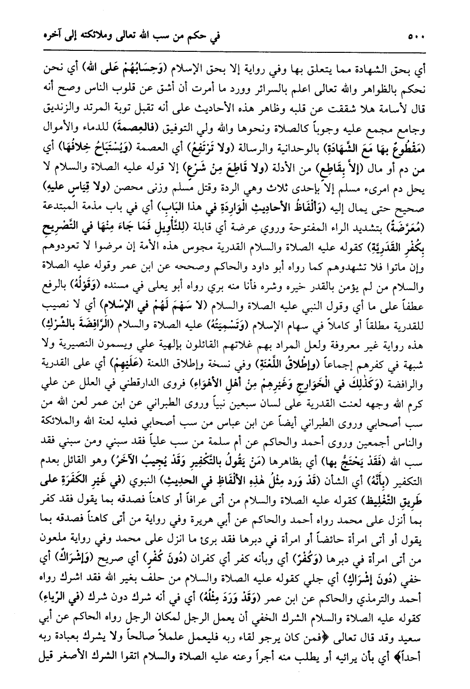 أي بحق الشهادة مما يتعلق بها وفي رواية إلا بحق الإسلام (وحسابهم على الله) أي نحن نحكم بالظواهر والله تعالى اعلم بالسرائر وورد ما أمرت أن أشق عن قلوب الناس وصح أنه قال لأسامة هلا شققت عن قلبه وظاهر هذه الأحاديث على أنه تقبل توبة المرتد والزنديق وجامع مجمع عليه وجوبا كالصلاة ونحوها والله ولي التوفيق (فالعصمة) للدماء والأموال (مقطوع بها مع الشّهادة) بالوحدانية والرسالة (ولا ترتفع) أي العصمة (ويستباح خلافها) أي من دم أو مال (إلّا بقاطع) من الأدلة (ولا قاطع من شرع) إلا قوله عليه الصلاة والسلام لا يحل دم امرىء مسلم إلا بإحدى ثلاث وهي الردة وقتل مسلم وزنى محصن (ولا قياس عليه) صحيح حتى يمال إليه (وألفاظ الأحاديث الواردة في هذا الباب) أي في باب مذمة المبتدعة (معرّضة) بتشديد الراء المفتوحة وروي عرضة أي قابلة (لِلتَّأْوِيلِ فَمَا جَاءَ مِنْهَا فِي التَّصْرِيحِ بِكُفْرِ القدريّة) كقوله عليه الصلاة والسلام القدرية مجوس هذه الأمة إن مرضوا لا تعودوهم وإن ماتوا فلا تشهدوهم كما رواه أبو داود والحاكم وصححه عن ابن عمر وقوله عليه الصلاة والسلام من لم يؤمن بالقدر خيره وشره فأنا منه بري رواه أبو يعلى في مسنده (وقوله) بالرفع عطفا على ما أي وقول النبي عليه الصلاة والسلام (لا سهم لهم في الإسلام) أي لا نصيب للقدرية مطلقا أو كاملا في سهام الإسلام (وتسميته) عليه الصلاة والسلام (الرّافضة بالشّرك) هذه رواية غير معروفة ولعل المراد بهم غلاتهم القائلون بإلهية علي ويسمون النصيرية ولا شبهة في كفرهم إجماعا (وإطلاق اللّعنة) وفي نسخة وإطلاق اللعنة (عليهم) أي على القدرية والرافضة (وَكَذَلِكَ فِي الْخَوَارِجِ وَغَيْرِهِمْ مِنْ أَهْلِ الْأَهْوَاءِ) فروى الدارقطني في العلل عن علي كرم الله وجهه لعنت القدرية على لسان سبعين نبيا وروى الطبراني عن ابن عمر لعن الله من سب أصحابي وروى الطبراني أيضا عن ابن عباس مَنْ سَبَّ أَصْحَابِي فَعَلَيْهِ لَعْنَةُ اللَّهِ وَالْمَلَائِكَةِ والناس أجمعين وروى أحمد والحاكم عن أم سلمة من سب عليا فقد سبني ومن سبني فقد سب الله (فقد يحتجّ بها) أي بظاهرها (من يقول بالتّكفير وقد يجيب الآخر) وهو القائل بعدم التكفير (بأنّه) أي الشأن (قد ورد مثل هذه الألفاظ في الحديث) النبوي (في غير الكفرة على طريق التّغليظ) كقوله عليه الصلاة والسلام من أتى عرافا أو كاهنا فصدقه بما يقول فقد كفر بما أنزل على محمد رواه أحمد والحاكم عن أبي هريرة وفي رواية من أتى كاهنا فصدقه بما يقول أو أتى امرأة حائضا أو امرأة في دبرها فقد برئ ما انزل على محمد وفي رواية ملعون من أتى امرأة في دبرها (وكفر) أي وبأنه كفر أي كفران (دون كفر) أي صريح (وإشراك) أي خفي (دون إشراك) أي جلي كقوله عليه الصلاة والسلام من حلف بغير الله فقد اشرك رواه أحمد والترمذي والحاكم عن ابن عمر (وقد ورد مثله) أي في أنه شرك دون شرك (في الرّياء) كقوله عليه الصلاة والسلام الشرك الخفي أن يعمل الرجل لمكان الرجل رواه الحاكم عن أبي سعيد وقد قال تعالى فَمَنْ كانَ يَرْجُوا لِقاءَ رَبِّهِ فَلْيَعْمَلْ عَمَلًا صالِحاً وَلا يُشْرِكْ بِعِبادَةِ رَبِّهِ أَحَداً أي بأن يرائيه أو يطلب منه أجرا وعنه عليه الصلاة والسلام اتقوا الشرك الأصغر قيل