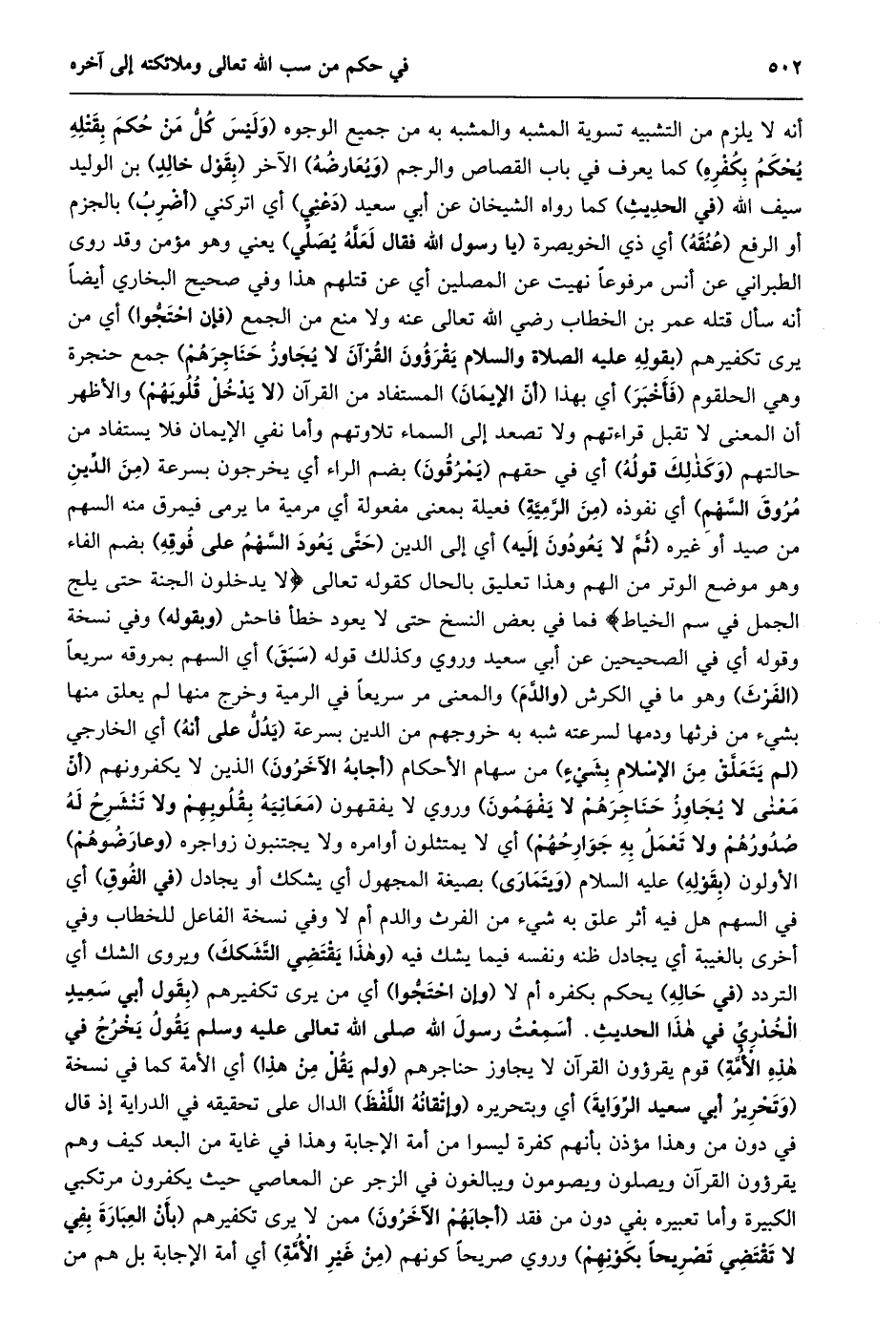 أنه لا يلزم من التشبيه تسوية المشبه والمشبه به من جميع الوجوه (وَلَيْسَ كُلُّ مَنْ حُكِمَ بِقَتْلِهِ يُحْكَمُ بِكُفْرِهِ) كما يعرف في باب القصاص والرجم (ويعارضه) الآخر (بقول خالد) بن الوليد سيف الله (في الحديث) كما رواه الشيخان عن أبي سعيد (دعني) أي اتركني (أضرب) بالجزم أو الرفع (عنقه) أي ذي الخويصرة (يا رسول الله فقال لعلّه يصلّي) يعني وهو مؤمن وقد روى الطبراني عن أنس مرفوعا نهيت عن المصلين أي عن قتلهم هذا وفي صحيح البخاري أيضا أنه سأل قتله عمر بن الخطاب رضي الله تعالى عنه ولا منع من الجمع (فإن احتجّوا) أي من يرى تكفيرهم (بقوله عليه الصلاة والسلام يقرؤون القرآن لا يجاوز حناجرهم) جمع حنجرة وهي الحلقوم (فأخبر) أي بهذا (أنّ الإيمان) المستفاد من القرآن (لا يدخل قلوبهم) والأظهر أن المعنى لا تقبل قراءتهم ولا تصعد إلى السماء تلاوتهم وأما نفي الإيمان فلا يستفاد من حالتهم (وكذلك قوله) أي في حقهم (يمرقون) بضم الراء أي يخرجون بسرعة (من الدّين مروق السّهم) أي نفوذه (من الرّميّة) فعلية بمعنى مفعولة أي مرمية ما يرمى فيمرق منه السهم من صيد أو غيره (ثمّ لا يعودون إليه) أي إلى الدين (حتّى يعود السّهم على فوقه) بضم الفاء وهو موضع الوتر من الهم وهذا تعليق بالحال كقوله تعالى لا يَدْخُلُونَ الْجَنَّةَ حَتَّى يَلِجَ الْجَمَلُ فِي سَمِّ الْخِياطِ فما في بعض النسخ حتى لا يعود خطأ فاحش (وبقوله) وفي نسخة وقوله أي في الصحيحين عن أبي سعيد وروي وكذلك قوله (سبق) أي السهم بمروقه سريعا (الفرث) وهو ما في الكرش (والدّم) والمعنى مر سريعا في الرمية وخرج منها لم يعلق منها بشيء من فرثها ودمها لسرعته شبه به خروجهم من الدين بسرعة (يدلّ على أنه) أي الخارجي (لم يتعلّق من الإسلام بشيء) من سهام الأحكام (أجابه الآخرون) الذين لا يكفرونهم (إِنَّ مَعْنَى لَا يُجَاوِزُ حَنَاجِرَهُمْ لَا يَفْهَمُونَ) وروي لا يفقهون (مَعَانِيَهُ بِقُلُوبِهِمْ وَلَا تَنْشَرِحُ لَهُ صُدُورُهُمْ وَلَا تعمل به جوارحهم) أي لا يمتثلون أوامره ولا يجتنبون زواجره (وعارضوهم) الأولون (بقوله) عليه السلام (ويتمارى) بصيغة المجهول أي يشكك أو يجادل (في الفوق) أي في السهم هل فيه أثر علق به شيء من الفرث والدم أم لا وفي نسخة الفاعل للخطاب وفي أخرى بالغيبة أي يجادل ظنه ونفسه فيما يشك فيه (وهذا يقتضي التّشكك) ويروى الشك أي التردد (في حاله) يحكم بكفره أم لا (وإن احتجّوا) أي من يرى تكفيرهم (بِقَوْلِ أَبِي سَعِيدٍ الْخُدْرِيِّ فِي هَذَا الْحَدِيثِ. أسمعت رسول الله صلى الله تعالى عَلَيْهِ وَسَلَّمَ يَقُولُ يَخْرُجُ فِي هَذِهِ الْأُمَّةِ) قوم يقرؤون القرآن لا يجاوز حناجرهم (ولم يقل من هذا) أي الأمة كما في نسخة (وتحرير أبي سعيد الرّواية) أي وبتحريره (وإتقانه اللّفظ) الدال على تحقيقه في الدراية إذ قال في دون من وهذا مؤذن بأنهم كفرة ليسوا من أمة الإجابة وهذا في غاية من البعد كيف وهم يقرؤون القرآن ويصلون ويصومون ويبالغون في الزجر عن المعاصي حيث يكفرون مرتكبي الكبيرة وأما تعبيره بفي دون من فقد (أجابهم الآخرون) ممن لا يرى تكفيرهم (بِأَنَّ الْعِبَارَةَ بِفِي لَا تَقْتَضِي تَصْرِيحًا بِكَوْنِهِمْ) وروي صريحا كونهم (من غير الأمّة) أي أمة الإجابة بل هم من