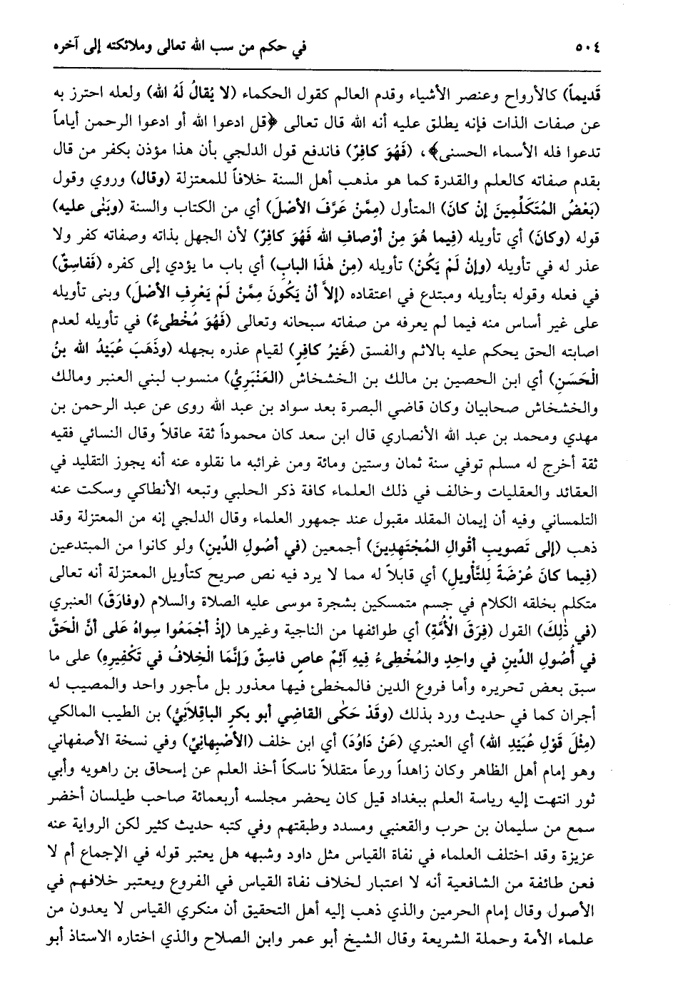 قديما) كالأرواح وعنصر الأشياء وقدم العالم كقول الحكماء (لا يقال له الله) ولعله احترز به عن صفات الذات فإنه يطلق عليه أنه الله قال تعالى قُلِ ادْعُوا اللَّهَ أَوِ ادْعُوا الرَّحْمنَ أَيًّا ما تَدْعُوا فَلَهُ الْأَسْماءُ الْحُسْنى، (فهو كافر) فاندفع قول الدلجي بأن هذا مؤذن بكفر من قال بقدم صفاته كالعلم والقدرة كما هو مذهب أهل السنة خلافا للمعتزلة (وقال) وروي وقول (بعض المتكلّمين إن كان) المتأول (ممّن عرّف الأصل) أي من الكتاب والسنة (وبنى عليه) قوله (وكان) أي تأويله (فِيمَا هُوَ مِنْ أَوْصَافِ اللَّهِ فَهُوَ كَافِرٌ) لأن الجهل بذاته وصفاته كفر ولا عذر له في تأويله (وإن لم يكن) تأويله (من هذا الباب) أي باب ما يؤدي إلى كفره (ففاسق) في فعله وقوله بتأويله ومبتدع في اعتقاده (إِلَّا أَنْ يَكُونَ مِمَّنْ لَمْ يَعْرِفِ الْأَصْلَ) وبنى تأويله على غير أساس منه فيما لم يعرفه من صفاته سبحانه وتعالى (فهو مخطىء) في تأويله لعدم اصابته الحق يحكم عليه بالاثم والفسق (غير كافر) لقيام عذره بجهله (وذهب عبيد الله بن الحسن) أي ابن الحصين بن مالك بن الخشخاش (العنبريّ) منسوب لبني العنبر ومالك والخشخاش صحابيان وكان قاضي البصرة بعد سواد بن عبد الله روى عن عبد الرحمن بن مهدي ومحمد بن عبد الله الأنصاري قال ابن سعد كان محمودا ثقة عاقلا وقال النسائي فقيه ثقة أخرج له مسلم توفي سنة ثمان وستين ومائة ومن غرائبه ما نقلوه عنه أنه يجوز التقليد في العقائد والعقليات وخالف في ذلك العلماء كافة ذكر الحلبي وتبعه الأنطاكي وسكت عنه التلمساني وفيه أن إيمان المقلد مقبول عند جمهور العلماء وقال الدلجي إنه من المعتزلة وقد ذهب (إلى تصويب أقوال المجتهدين) أجمعين (في أصول الدّين) ولو كانوا من المبتدعين (فيما كان عرضة للتّأويل) أي قابلا له مما لا يرد فيه نص صريح كتأويل المعتزلة أنه تعالى متكلم بخلقه الكلام في جسم متمسكين بشجرة موسى عليه الصلاة والسلام (وفارق) العنبري (في ذلك) القول (فرق الأمّة) أي طوائفها من الناجية وغيرها (إِذْ أَجْمَعُوا سِوَاهُ عَلَى أَنَّ الْحَقَّ فِي أُصُولِ الدِّينِ فِي وَاحِدٍ وَالْمُخْطِئُ فِيهِ آثِمٌ عاص فاسق وإنّما الخلاف في تكفيره) على ما سبق بعض تحريره وأما فروع الدين فالمخطئ فيها معذور بل مأجور واحد والمصيب له أجران كما في حديث ورد بذلك (وقد حكى القاضي أبو بكر الباقلانيّ) بن الطيب المالكي (مثل قول عبيد الله) أي العنبري (عن داود) أي ابن خلف (الأصبهانيّ) وفي نسخة الأصفهاني وهو إمام أهل الظاهر وكان زاهدا ورعا متقللا ناسكا أخذ العلم عن إسحاق بن راهويه وأبي ثور انتهت إليه رياسة العلم ببغداد قيل كان يحضر مجلسه أربعمائة صاحب طيلسان أخضر سمع من سليمان بن حرب والقعنبي ومسدد وطبقتهم وفي كتبه حديث كثير لكن الرواية عنه عزيزة وقد اختلف العلماء في نفاة القياس مثل داود وشبهه هل يعتبر قوله في الإجماع أم لا فعن طائفة من الشافعية أنه لا اعتبار لخلاف نفاة القياس في الفروع ويعتبر خلافهم في الأصول وقال إمام الحرمين والذي ذهب إليه أهل التحقيق أن منكري القياس لا يعدون من علماء الأمة وحملة الشريعة وقال الشيخ أبو عمر وابن الصلاح والذي اختاره الاستاذ أبو