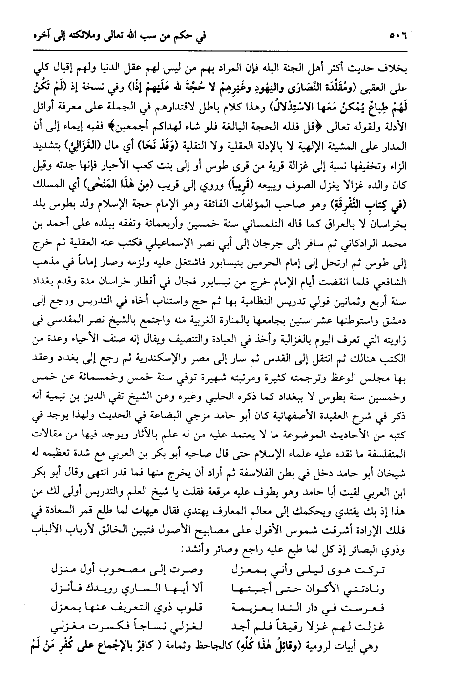 بخلاف حديث أكثر أهل الجنة البله فإن المراد بهم من ليس لهم عقل الدنيا ولهم إقبال كلي على العقبى (وَمُقَلِّدَةِ النَّصَارَى وَالْيَهُودِ وَغَيْرِهِمْ لَا حُجَّةَ لِلَّهِ عليهم إذا) وفي نسخة إِذْ (لَمْ تَكُنْ لَهُمْ طِبَاعٌ يُمْكِنُ مَعَهَا الاستدلال) وهذا كلام باطل لاقتدارهم في الجملة على معرفة أوائل الأدلة ولقوله تعالى قُلْ فَلِلَّهِ الْحُجَّةُ الْبالِغَةُ فَلَوْ شاءَ لَهَداكُمْ أَجْمَعِينَ ففيه إيماء إلى أن المدار على المشيئة الإلهية لا بالإدلة العقلية ولا النقلية (وقد نحا) أي مال (الغزاليّ) بتشديد الزاء وتخفيفها نسبة إلى غزالة قرية من قرى طوس أو إلى بنت كعب الأحبار فإنها جدته وقيل كان والده غزالا يغزل الصوف ويبيعه (قريبا) وروي إلى قريب (من هذا المنحى) أي المسلك (في كتاب التّفرقة) وهو صاحب المؤلفات الفائقة وهو الإمام حجة الإسلام ولد بطوس بلد بخراسان لا بالعراق كما قاله التلمساني سنة خمسين وأربعمائة وتفقه ببلده على أحمد بن محمد الرادكاني ثم سافر إلى جرجان إلى أبي نصر الإسماعيلي فكتب عنه العقلية ثم خرج إلى طوس ثم ارتحل إلى إمام الحرمين بنيسابور فاشتغل عليه ولزمه وصار إماما في مذهب الشافعي فلما انقضت أيام الإمام خرج من نيسابور فجال في أقطار خراسان مدة وقدم بغداد سنة أربع وثمانين فولي تدريس النظامية بها ثم حج واستناب أخاه في التدريس ورجع إلى دمشق واستوطنها عشر سنين بجامعها بالمنارة الغربية منه واجتمع بالشيخ نصر المقدسي في زوايته التي تعرف اليوم بالغزالية وأخذ في العبادة والتنصيف ويقال إنه صنف الأحياء وعدة من الكتب هنالك ثم انتقل إلى القدس ثم سار إلى مصر والإسكندرية ثم رجع إلى بغداد وعقد بها مجلس الوعظ وترجمته كثيرة ومرتبته شهيرة توفي سنة خمس وخمسمائة عن خمس وخمسين سنة بطوس لا ببغداد كما ذكره الحلبي وغيره وعن الشيخ تقي الدين بن تيمية أنه ذكر في شرح العقيدة الأصفهانية كان أبو حامد مزجي البضاعة في الحديث ولهذا يوجد في كتبه من الأحاديث الموضوعة ما لا يعتمد عليه من له علم بالآثار ويوجد فيها من مقالات المتفلسفة ما نقده عليه علماء الإسلام حتى قال صاحبه أبو بكر بن العربي مع شدة تعظيمه له شيخان أبو حامد دخل في بطن الفلاسفة ثم أراد أن يخرج منها فما قدر انتهى وقال أبو بكر ابن العربي لقيت أبا حامد وهو يطوف عليه مرقعة فقلت يا شيخ العلم والتدريس أولى لك من هذا إذ بك يقتدي ويحكمك إلى معالم المعارف يهتدي فقال هيهات لما طلع قمر السعادة في فلك الإرادة أشرقت شموس الأفول على مصابيح الأصول فتبين الخالق لأرباب الألباب وذوي البصائر إذ كل لما طبع عليه راجع وصائر وأنشد: