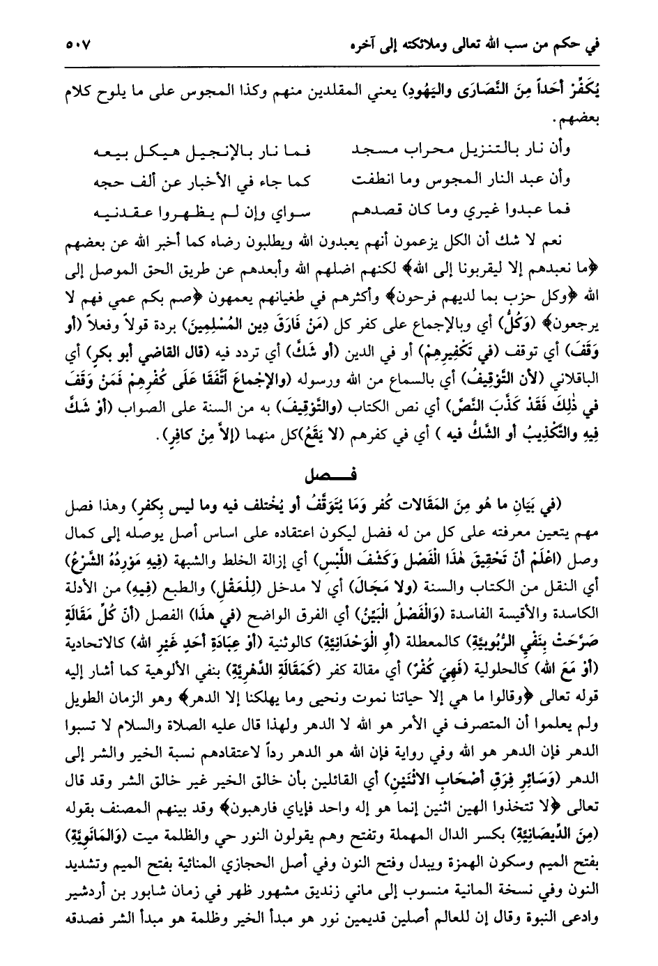 وهذا فصل مهم يتعين معرفته على كل من له فضل ليكون اعتقاده على اساس أصل يوصله إلى كمال وصل (اعْلَمْ أَنَّ تَحْقِيقَ هَذَا الْفَصْلِ وَكَشْفَ اللَّبْسِ) أي إزالة الخلط والشبهة (فيه مورده الشّرع) أي النقل من الكتاب والسنة (ولا مجال) أي لا مدخل (للعقل) والطبع (فيه) من الأدلة الكاسدة والأقيسة الفاسدة (والفصل البيّن) أي الفرق الواضح (في هذا) الفصل (أنّ كلّ مقالة صرّحت بنفي الرّبوبيّة) كالمعطلة (أو الوحدانيّة) كالوثنية (أو عبادة أحد غير الله) كالاتحادية (أو مع الله) كالحلولية (فهي كفر) أي مقالة كفر (كمقالة الدّهريّة) بنفي الألوهية كما أشار إليه قوله تعالى وَقالُوا ما هِيَ إِلَّا حَياتُنَا الدُّنْيا نَمُوتُ وَنَحْيا وَما يُهْلِكُنا إِلَّا الدَّهْرُ وهو الزمان الطويل ولم يعلموا أن المتصرف في الأمر هو الله لا الدهر ولهذا قال عليه الصلاة والسلام لا تسبوا الدهر فإن الدهر هو الله وفي رواية فإن الله هو الدهر ردا لاعتقادهم نسبة الخير والشر إلى الدهر (وسائر فرق أصحاب الاثنين) أي القائلين بأن خالق الخير غير خالق الشر وقد قال تعالى لا تَتَّخِذُوا إِلهَيْنِ اثْنَيْنِ إِنَّما هُوَ إِلهٌ واحِدٌ فَإِيَّايَ فَارْهَبُونِ وقد بينهم المصنف بقوله (من الدّيصانيّة) بكسر الدال المهملة وتفتح وهم يقولون النور حي والظلمة ميت (والمانويّة) بفتح الميم وسكون الهمزة ويبدل وفتح النون وفي أصل الحجازي المنائية بفتح الميم وتشديد النون وفي نسخة المانية منسوب إلى ماني زنديق مشهور ظهر في زمان شابور بن أردشير وادعى النبوة وقال إن للعالم أصلين قديمين نور هو مبدأ الخير وظلمة هو مبدأ الشر فصدقه
