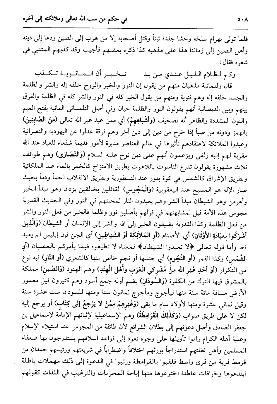 قال وللمانية مذهبان منهم من يقول إن النور والخير والروح خلقه إله والشر والظلمة والجسد خلقه إله وهم ثنوية ومنهم من يقول الخير كله في النور والشر كله في الظلمة والفرق بينهم وبين الديصانية أنهم يقولون النور والظلمة حيان وفي أصل التلمساني المانية بفتح الميم والنون المشددة والظاهر أنه تصحيف (وأشباههم) أي ممن عبد غير الله تعالى (من الصّابئين) بالهمز ودونه من صبأ إذا خرج من دين إلى دين آخر وهم فرقة عدلوا عن اليهودية والنصرانية وعبدوا الملائكة لا عتقادهم تأثيرها في عالم العناصر مدبرة لأمور قديمة شفعاء للعباد عند الله مقربة لهم إليه زلفى ويزعمون أنهم على دين نوح عليه السلام (والنّصارى) وهم طوائف ثلاث مشهورة يقولون تدرع الناسوت باللاهوت بطريق الامتزاج كالخمر بالماء عند الملكائية وبطريق الإشراق كالشمس في كوة بلور عند النسطورية وبطريق الانقلاب لحما ودما بحيث صار الإله هو المسيح عند اليعقوبية (والمجوس) القائلين بخالقين يزدان وهو مبدأ الخير وأهرمن وهو الشيطان مبدأ الشر وهم يعبدون النار لمحبتهم في النور وفي الحديث القدرية مجوس هذه الأمة قيل لمشابهتهم في قولهم بأصلين نور وظلمة فالخير من فعل النور والشر من فعل الظلمة وكذا القدرية يضيفون الخير إلى الله والشر إلى الإنسان أو الشيطان (والّذين أشركوا بعبادة الأوثان) أي الأصنام (أو الملائكة أو الشّياطين) أي الجن فإن إبليس لم يعبد قط وأما قوله تعالى لا تَعْبُدُوا الشَّيْطانَ فمعناه لا تطيعوه فيما يأمركم بالعصيان (أو الشّمس) وكذا القمر (أو النّجوم) أي جنسها أو نجم خاص منها كالشعري (أو النّار) فيه نوع من التكرار (أَوْ أَحَدٍ غَيْرِ اللَّهِ مِنْ مُشْرِكِي الْعَرَبِ وأهل الهند) وهم الهنود (والصّين) مملكة بالمشرق فيها الترك من الكفرة (والسّودان) بضم أوله جمع أسود وهم كثيرون قيل معمور الأرض مسافة مائة سنة منها ليأجوج ومأجوج ثمانون سنة ومنها للسودان ست عشرة سنة وقيل ثماني عشرة ومنها لأولاد سام ما بقي (وغيرهم ممّن لا يرجع إلى كتاب) أو يرجع إليه لكن لا على طريق صواب (وكذلك القرامطة) وهم الإسماعيلية لإثباتهم الإمامة لإسماعيل بن جعفر الصادق وأصل دعوتهم إلى بطلان الشرائع لأن طائفة من المجوس عند استيلاء الإسلام وغلبة أهله الكرام راموا تأويلها على وجوه تعود إلى قواعد اسلافهم يستدرجون بها ضعفاء المسلمين وأهل غفلتهم استدراجا يورثهم اختلافا واضطرابا في شريعتهم ورئيسهم حمدان من قرمط قرية من قرى واسط فلقبوا بالقرامطة ورتبوا في الدعوة إلى ذلك مهملات باطلة ابتدعوها وخرافات عاطلة اخترعوها منها إباحة المحرمات والترغيب في اللذات كقولهم