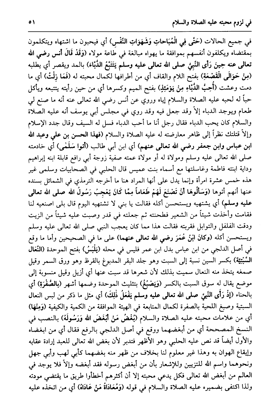 في جميع الحالات (حتّى في المباحات وشهوات النّفس) أي فيحبون ما اشتهاه ويتكلمون بمقتضاه ويكلفون أنفسهم بموافقة ما يهواه مبالغة في طاعة مولاه (وقد قال أنس رضي الله تعالى عنه حين رأى النّبيّ صلى الله تعالى عليه وسلم يتتبّع الدّبّاء) بالمد ويقصر أي يطلبه (من حوالى القصعة) بفتح اللام والقاف أي من أطرافها لكمال محبته له (فما زلت) أي ما دمت وعشت (أحبّ الدّبّاء من يومئذ) بفتح الميم وكسرها أي من حين رأيته يتتبعه ويأكل حبا له لحبه عليه الصلاة والسلام إياه وروي عن أنس رضي الله تعالى عنه أنه ما صنع لي طعام ويوجد الدباء إلّا وقد جعل فيه وقد روي في مجلس أبي يوسف أنه عليه الصلاة والسلام كان يحب الدباء فقال رجل أنا ما أحب الدباء فسل له السيف وقال جدد الإسلام وإلّا قتلتك نظرا إلى ظاهر معارضته له عليه الصلاة والسلام (فهذا الحسن بن علي وعبد الله ابن عباس وابن جعفر رضي الله تعالى عنهم) أي ابن أبي طالب (أتوا سلمى) أي خادمته صلى الله تعالى عليه وسلم ومولاة له أو مولاة عمته صفية زوجة أبي رافع قابلة ابنه إبراهيم وداية ابنته فاطمة وغاسلتها مع أسماء بنت عميس قال الحلبي في الصحابيات وسلمى غير هذه خمس عشرة امرأة وإنما يدل على أنها المراد هنا ما أخرجه الترمذي في الشمائل بسنده عنها أنهم أتوها (وَسَأَلُوهَا أَنْ تَصْنَعَ لَهُمْ طَعَامًا مِمَّا كَانَ يعجب رسول الله صلى الله تعالى عليه وسلم) أي يشتهيه ويستحسن أكله فقالت يا بني لا تشتهيه اليوم قال بلى اصنعيه لنا فقامت وأخذت شيئا من الشعير فطحنته ثم جعلته في قدر وصبت عليه شيئا من الزيت ودقت الفلفل والتوابل فقربته فقالت هذا مما كان يعجب النبي صلى الله تعالى عليه وسلم ويستحسن أكله (وكان ابن عمر رضي الله تعالى عنهما) على ما في الصحيحين وأما ما وقع في أصل الدلجي من ابن عباس بدل ابن عمر فليس في محله (يلبس) بفتح الموحدة (النّعال السّبتيّة) بكسر السين نسبة إلى السبت وهو جلد البقر المدبوغ بالقرظ وهو ورق السمر وقيل صمغه يتخذ منه النعال سميت بذلك لأن شعرها قد سبت عنها أي أزيل وقيل منسوبة إلى موضع يقال له سوق السبت بالكسر (ويصبغ) بتثليث الموحدة وضمها أشهر (بالصّفرة) أي بالحناء (إذ رأى النّبيّ صلى الله تعالى عليه وسلم يفعل ذلك) أي مثل ما ذكر من لبس النعال السبتية وصبغ اللحية بالصفرة لكمال المتابعة في الهيئة الموافقة من الكمية والكيفية (ومنها) أي من علامات محبته عليه الصلاة والسلام (بغض من أبغض الله ورسوله) بالنصب في النسخ المصححة أي من أبغضهما ووقع في أصل الدلجي بالرفع فقال أي من ابغضاه والأول أيضا قد نص عليه الحلبي وهو الأظهر فتدبر لأن بغض الله تعالى للعبد إرادة عقابه وإيقاع الهوان به وهذا غير معلوم لنا بخلاف من ظهر منه بغضهما كأبي لهب وأبي جهل ونحوهما واسم الله للتزيين وللإشعار بأن من أبغض رسوله فقد أبغضه وإلّا فلا يوجد في العالم من أبغض الله تعالى فكل يدعي محبته إلا أن أكثرهم أخطأوا طريق ما يقتضي مودته ولذا اكتفى بضميره عليه الصلاة والسلام في قوله (ومعاداة من عاداه) أي من اتخذه عليه