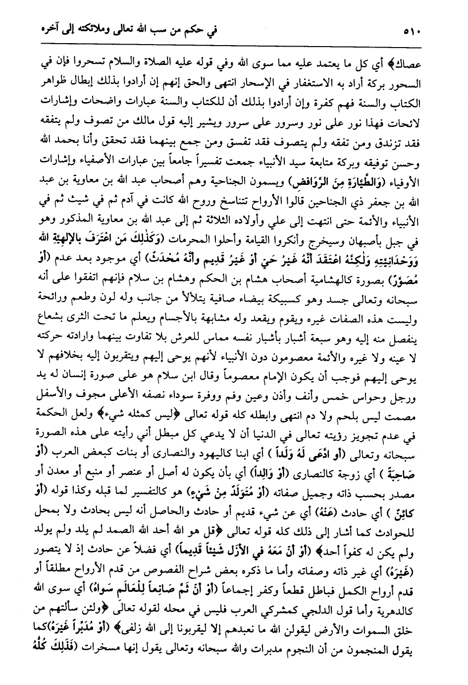 عَصاكَ أي كل ما يعتمد عليه مما سوى الله وفي قوله عليه الصلاة والسلام تسحروا فإن في السحور بركة أراد به الاستغفار في الإسحار انتهى والحق إنهم إن أرادوا بذلك إبطال ظواهر الكتاب والسنة فهم كفرة وإن أرادوا بذلك أن للكتاب والسنة عبارات واضحات وإشارات لائحات فهذا نور على نور وسرور على سرور ويشير إليه قول مالك من تصوف ولم يتفقه فقد تزندق ومن تفقه ولم يتصوف فقد تفسق ومن جمع بينهما فقد تحقق وأنا بحمد الله وحسن توفيقه وبركة متابعة سيد الأنبياء جمعت تفسيرا جامعا بين عبارات الأصفياء وإشارات الأوفياء (والطّيّارة من الرّوافض) ويسمون الجناحية وهم أصحاب عبد الله بن معاوية بن عبد الله بن جعفر ذي الجناحين قالوا الأرواح تتناسخ وروح الله كانت في آدم ثم في شيث ثم في الأنبياء والأئمة حتى انتهت إلى علي وأولاده الثلاثة ثم إلى عبد الله بن معاوية المذكور وهو في جبل بأصبهان وسيخرج وأنكروا القيامة وأحلوا المحرمات (وكذلك من اعترف بالإلهيّة اللَّهِ وَوَحْدَانِيَّتِهِ وَلَكِنَّهُ اعْتَقَدَ أَنَّهُ غَيْرُ حَيٍّ أو غير قديم وأنّه محدث) أي موجود بعد عدم (أو مصوّر) بصورة كالهشامية أصحاب هشام بن الحكم وهشام بن سلام فإنهم اتفقوا على أنه سبحانه وتعالى جسد وهو كسبيكة بيضاء صافية يتلألأ من جانب وله لون وطعم ورائحة وليست هذه الصفات غيره ويقوم ويقعد وله مشابهة بالأجسام ويعلم ما تحت الثرى بشعاع ينفصل منه إليه وهو سبعة أشبار بأشبار نفسه مماس للعرش بلا تفاوت بينهما وارادته حركته لا عينه ولا غيره والأئمة معصومون دون الأنبياء لأنهم يوحى إليهم ويتقربون إليه بخلافهم لا يوحى إليهم فوجب أن يكون الإمام معصوما وقال ابن سلام هو على صورة إنسان له يد ورجل وحواس خمس وأنف وأذن وعين وفم ووفرة سوداء نصفه الأعلى مجوف والأسفل مصمت ليس بلحم ولا دم انتهى وابطله كله قوله تعالى لَيْسَ كَمِثْلِهِ شَيْءٌ ولعل الحكمة في عدم تجويز رؤيته تعالى في الدنيا أن لا يدعي كل مبطل أني رأيته على هذه الصورة سبحانه وتعالى (أو ادّعى له ولدا) أي ابنا كاليهود والنصارى أو بنات كبعض العرب (أو صاحبة) أي زوجة كالنصارى (أو والدا) أي بأن يكون له أصل أو عنصر أو منبع أو معدن أو مصدر بحسب ذاته وجميل صفاته (أو متولد من شيء) هو كالتفسير لما قبله وكذا قوله (أو كائن) أي حادث (عنه) أي عن شيء قديم أو حادث والحاصل أنه ليس بحادث ولا بمحل للحوادث كما أشار إلى ذلك كله قوله تعالى قُلْ هُوَ اللَّهُ أَحَدٌ اللَّهُ الصَّمَدُ لَمْ يَلِدْ وَلَمْ يُولَدْ وَلَمْ يَكُنْ لَهُ كُفُواً أَحَدٌ (أَوْ أَنَّ مَعَهُ فِي الْأَزَلِ شَيْئًا قَدِيمًا) أي فضلا عن حادث إذ لا يتصور (غيره) أي غير ذاته وصفاته وأما ما ذكره بعض شراح الفصوص من قدم الأرواح مطلقا أو قدم أرواح الكمل فباطل قطعا وكفر إجماعا (أو أنّ ثمّ صانعا للعالم سواه) أي سوى الله كالدهرية وأما قول الدلجي كمشركي العرب فليس في محله لقوله تعالى وَلَئِنْ سَأَلْتَهُمْ مَنْ خَلَقَ السَّماواتِ وَالْأَرْضَ لَيَقُولُنَّ اللَّهُ ما نَعْبُدُهُمْ إِلَّا لِيُقَرِّبُونا إِلَى اللَّهِ زُلْفى (أو مدبّرا غيره) كما يقول المنجمون من أن النجوم مدبرات والله سبحانه وتعالى يقول إنها مسخرات (فذلك كلّه