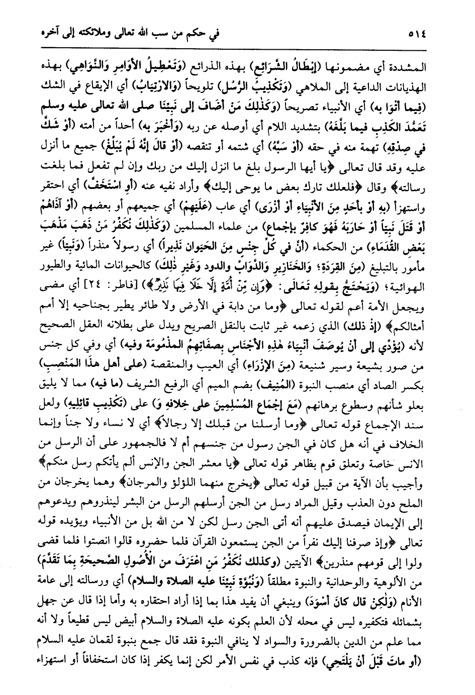 المشددة أي مضمونها (إبطال الشّرائع) بهذه الذرائع (وتعطيل الأوامر والنّواهي) بهذه الهذيانات الداعية إلى الملاهي (وتكذيب الرّسل) تلويحا (والارتياب) أي الإيقاع في الشك (فيما أتوا به) أي الأنبياء تصريحا (وَكَذَلِكَ مَنْ أَضَافَ إِلَى نَبِيِّنَا صَلَّى اللَّهُ تعالى عليه وسلم تعمّد الكذب فيما بلّغه) بتشديد اللام أي أوصله عن ربه (وأخبر به) أحدا من أمته (أو شكّ في صدقه) تهمة منه في حقه (أو سبّه) أي شتمه أو تنقصه (أو قال إنّه لم يبلّغ) جميع ما أنزل عليه وقد قال تعالى يا أَيُّهَا الرَّسُولُ بَلِّغْ ما أُنْزِلَ إِلَيْكَ مِنْ رَبِّكَ وَإِنْ لَمْ تَفْعَلْ فَما بَلَّغْتَ رِسالَتَهُ وقال فَلَعَلَّكَ تارِكٌ بَعْضَ ما يُوحى إِلَيْكَ وأراد نفيه عنه (أو استخفّ) أي احتقر واستهزأ (بِهِ أَوْ بِأَحَدٍ مِنَ الْأَنْبِيَاءِ أَوْ أَزْرَى) أي عاب (عليهم) أي جميعهم أو بعضهم (أَوْ آذَاهُمْ أَوْ قَتَلَ نَبِيًّا أَوْ حَارَبَهُ فهو كافر بإجماع) من علماء المسلمين (وكذلك نكفّر من ذهب مذهب بعض القدماء) من الحكماء (أَنَّ فِي كُلِّ جِنْسٍ مِنَ الْحَيَوَانِ نَذِيرًا) أي رسولا منذرا (ونبيّا) غير مأمور بالتبليغ (من القردة؛ والخنازير والدّوابّ والدود وغير ذلك) كالحيوانات المائية والطيور الهوائية؛ (وَيَحْتَجُّ بِقَوْلِهِ تَعَالَى: وَإِنْ مِنْ أُمَّةٍ إِلَّا خَلا فِيها نَذِيرٌ) [فاطر: 24] أي مضى ويجعل الأمة أعم لقوله تعالى وَما مِنْ دَابَّةٍ فِي الْأَرْضِ وَلا طائِرٍ يَطِيرُ بِجَناحَيْهِ إِلَّا أُمَمٌ أَمْثالُكُمْ (إذ ذلك) الذي زعمه غير ثابت بالنقل الصريح ويدل على بطلانه العقل الصحيح لأنه (يُؤَدِّي إِلَى أَنْ يُوصَفَ أَنْبِيَاءُ هَذِهِ الْأَجْنَاسِ بصفاتهم المذمومة وفيه) أي وفي كل جنس من صور بشيعة وسير شنيعة (من الإزراء) أي العيب والمنقصة (على أهل هذا المنصب) بكسر الصاد أي منصب النبوة (المنيف) بضم الميم أي الرفيع الشريف (ما فيه) مما لا يليق بعلو شأنهم وسطوع برهانهم (مع إجماع المسلمين على خلافه و) على (تكذيب قائليه) ولعل سند الإجماع قوله تعالى وَما أَرْسَلْنا مِنْ قَبْلِكَ إِلَّا رِجالًا أي لا نساء ولا جنا وإنما الخلاف في أنه هل كان في الجن رسول من جنسهم أم لا فالجمهور على أن الرسل من الانس خاصة وتعلق قوم بظاهر قوله تعالى امَعْشَرَ الْجِنِّ وَالْإِنْسِ أَلَمْ يَأْتِكُمْ رُسُلٌ مِنْكُمْ