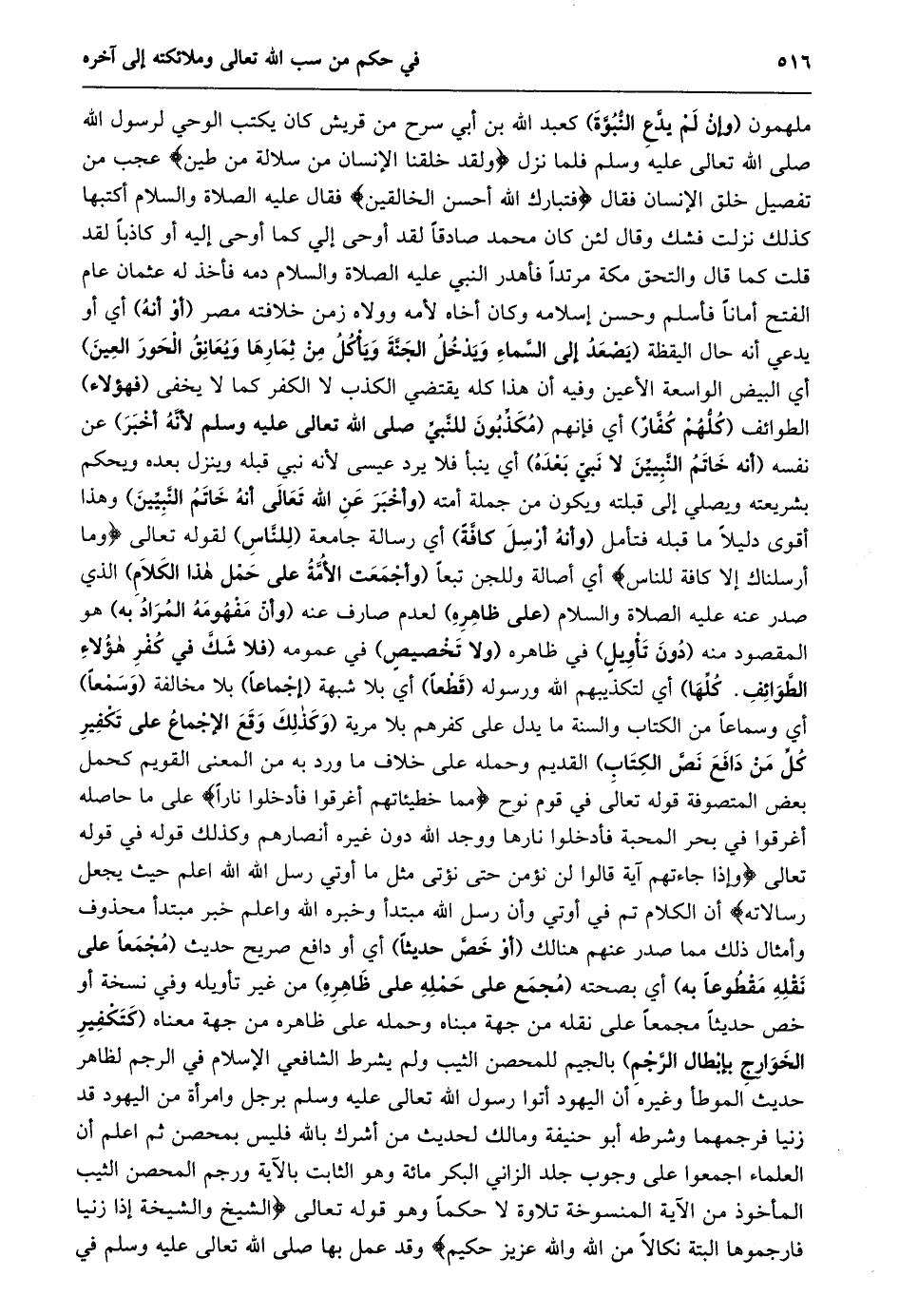 ملهمون (وإن لم يدّع النّبوّة) كعبد الله بن أبي سرح من قريش كان يكتب الوحي لرسول الله صلى الله تعالى عليه وسلم فلما نزل وَلَقَدْ خَلَقْنَا الْإِنْسانَ مِنْ سُلالَةٍ مِنْ طِينٍ عجب من تفصيل خلق الإنسان فقال فَتَبارَكَ اللَّهُ أَحْسَنُ الْخالِقِينَ فقال عليه الصلاة والسلام أكتبها كذلك نزلت فشك وقال لئن كان محمد صادقا لقد أوحى إلي كما أوحى إليه أو كاذبا لقد قلت كما قال والتحق مكة مرتدا فأهدر النبي عليه الصلاة والسلام دمه فأخذ له عثمان عام الفتح أمانا فأسلم وحسن إسلامه وكان أخاه لأمه وولاه زمن خلافته مصر (أو أنه) أي أو يدعي أنه حال اليقظة (يصعد إلى السّماء ويدخل الْجَنَّةِ وَيَأْكُلُ مِنْ ثِمَارِهَا وَيُعَانِقُ الْحُورَ الْعِينَ) أي البيض الواسعة الأعين وفيه أن هذا كله يقتضي الكذب لا الكفر كما لا يخفى (فهؤلاء) الطوائف (كلّهم كفّار) أي فإنهم (مكذّبون للنّبيّ صلى الله تعالى عليه وسلم لأنّه أخبر) عن نفسه (أنه خاتم النّبييّن لا نبيّ بعده) أي ينبأ فلا يرد عيسى لأنه نبي قبله وينزل بعده ويحكم بشريعته ويصلي إلى قبلته ويكون من جملة أمته (وَأَخْبَرَ عَنِ اللَّهِ تَعَالَى أَنَّهُ خَاتَمُ النَّبِيِّينَ) وهذا أقوى دليلا ما قبله فتأمل (وأنه أرسل كافّة) أي رسالة جامعة (للنّاس) لقوله تعالى وَما أَرْسَلْناكَ إِلَّا كَافَّةً لِلنَّاسِ أي أصالة وللجن تبعا (وأجمعت الأمّة على حمل هذا الكلام) الذي صدر عنه عليه الصلاة والسلام (على ظاهره) لعدم صارف عنه (وأنّ مفهومه المراد به) هو المقصود منه (دون تأويل) في ظاهره (ولا تخصيص) في عمومه (فَلَا شَكَّ فِي كُفْرِ هَؤُلَاءِ الطَّوَائِفِ. كُلِّهَا) أي لتكذيبهم الله ورسوله (قطعا) أي بلا شبهة (إجماعا) بلا مخالفة (وسمعا) أي وسماعا من الكتاب والسنة ما يدل على كفرهم بلا مرية (وَكَذَلِكَ وَقَعَ الْإِجْمَاعُ عَلَى تَكْفِيرِ كُلِّ مَنْ دافع نصّ الكتاب) القديم وحمله على خلاف ما ورد به من المعنى القويم كحمل بعض المتصوفة قوله تعالى في قوم نوح مِمَّا خَطِيئاتِهِمْ أُغْرِقُوا فَأُدْخِلُوا ناراً على ما حاصله أغرقوا في بحر المحبة فأدخلوا نارها ووجد الله دون غيره أنصارهم وكذلك قوله في قوله تعالى وَإِذا جاءَتْهُمْ آيَةٌ قالُوا لَنْ نُؤْمِنَ حَتَّى نُؤْتى مِثْلَ ما أُوتِيَ رُسُلُ اللَّهِ اللَّهُ أَعْلَمُ حَيْثُ يَجْعَلُ رِسالَتَهُ أن الكلام تم في أوتي وأن رسل الله مبتدأ وخبره الله واعلم خبر مبتدأ محذوف وأمثال ذلك مما صدر عنهم هنالك (أو خصّ حديثا) أي أو دافع صريح حديث (مجمعا على نقله مقطوعا به) أي بصحته (مجمع على حمله على ظاهره) من غير تأويله وفي نسخة أو خص حديثا مجمعا على نقله من جهة مبناه وحمله على ظاهره من جهة معناه (كتكفير الخوارج بإبطال الرّجم) بالجيم للمحصن الثيب ولم يشرط الشافعي الإسلام في الرجم لظاهر حديث الموطأ وغيره أن اليهود أتوا رسول الله تعالى عليه وسلم برجل وامرأة من اليهود قد زنيا فرجمهما وشرطه أبو حنيفة ومالك لحديث من أشرك بالله فليس بمحصن ثم اعلم أن العلماء اجمعوا على وجوب جلد الزاني البكر مائة وهو الثابت بالآية ورجم المحصن الثيب المأخوذ من الآية المنسوخة تلاوة لا حكما وهو قوله تعالى (الشيخ والشيخة إذا زنيا فارجموها البتة نكالا من الله والله عزيز حكيم) وقد عمل بها صلى الله تعالى عليه وسلم في