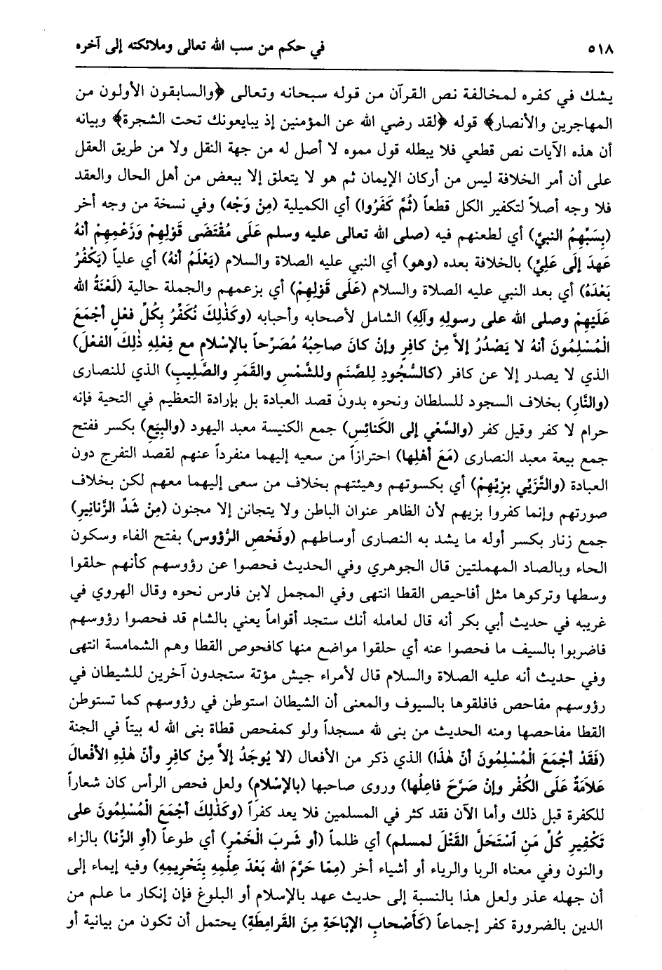 يشك في كفره لمخالفة نص القرآن من قوله سبحانه وتعالى وَالسَّابِقُونَ الْأَوَّلُونَ مِنَ الْمُهاجِرِينَ وَالْأَنْصارِ قوله لَقَدْ رَضِيَ اللَّهُ عَنِ الْمُؤْمِنِينَ إِذْ يُبايِعُونَكَ تَحْتَ الشَّجَرَةِ وبيانه أن هذه الآيات نص قطعي فلا يبطله قول مموه لا أصل له من جهة النقل ولا من طريق العقل على أن أمر الخلافة ليس من أركان الإيمان ثم هو لا يتعلق إلا ببعض من أهل الحال والعقد فلا وجه أصلا لتكفير الكل قطعا (ثمّ كفروا) أي الكميلية (من وجه) وفي نسخة من وجه أخر (بسبّهم النبيّ) أي لطعنهم فيه (صلى الله تعالى عَلَيْهِ وَسَلَّمَ عَلَى مُقْتَضَى قَوْلِهِمْ وَزَعْمِهِمْ أَنَّهُ عهد إلى عليّ) بالخلافة بعده (وهو) أي النبي عليه الصلاة والسلام (يعلم أنه) أي عليا (يكفر بعده) أي بعد النبي عليه الصلاة والسلام (على قولهم) أي بزعمهم والجملة حالية (لَعْنَةُ اللَّهِ عَلَيْهِمْ وَصَلَّى اللَّهُ عَلَى رَسُولِهِ وآله) الشامل لأصحابه وأحبابه (وَكَذَلِكَ نُكَفِّرُ بِكُلِّ فِعْلٍ أَجْمَعَ الْمُسْلِمُونَ أَنَّهُ لَا يَصْدُرُ إِلَّا مِنْ كَافِرٍ وَإِنْ كَانَ صَاحِبُهُ مُصَرِّحًا بِالْإِسْلَامِ مَعَ فِعْلِهِ ذَلِكَ الْفِعْلَ) الذي لا يصدر إلا عن كافر (كالسّجود للصّنم وللشّمس والقمر والصّليب) الذي للنصارى (والنّار) بخلاف السجود للسلطان ونحوه بدون قصد العبادة بل بإرادة التعظيم في التحية فإنه حرام لا كفر وقيل كفر (والسّعي إلى الكنائس) جمع الكنيسة معبد اليهود (والبيع) بكسر ففتح جمع بيعة معبد النصارى (مع أهلها) احترازا من سعيه إليهما منفردا عنهم لقصد التفرج دون العبادة (والتّزيّي بزيّهم) أي بكسوتهم وهيئتهم بخلاف من سعى إليهما معهم لكن بخلاف صورتهم وإنما كفروا بزيهم لأن الظاهر عنوان الباطن ولا يتجانن إلا مجنون (من شدّ الزّنانير) جمع زنار بكسر أوله ما يشد به النصارى أوساطهم (وفحص الرّؤوس) بفتح الفاء وسكون الحاء وبالصاد المهملتين قال الجوهري وفي الحديث فحصوا عن رؤوسهم كأنهم حلقوا وسطها وتركوها مثل أفاحيص القطا انتهى وفي المجمل لابن فارس نحوه وقال الهروي في غريبه في حديث أبي بكر أنه قال لعامله أنك ستجد أقواما يعني بالشام قد فحصوا رؤوسهم فاضربوا بالسيف ما فحصوا عنه أي حلقوا مواضع منها كافحوص القطاوهم الشمامسة انتهى وفي حديث أنه عليه الصلاة والسلام قال لأمراء جيش مؤتة ستجدون آخرين للشيطان في رؤوسهم مفاحص فافلقوها بالسيوف والمعنى أن الشيطان استوطن في رؤوسهم كما تستوطن القطا مفاحصها ومنه الحديث من بنى لله مسجدا ولو كمفحص قطاة بنى الله له بيتا في الجنة (فقد أجمع المسلمون أنّ هذا) الذي ذكر من الأفعال (لَا يُوجَدُ إِلَّا مِنْ كَافِرٍ وَأَنَّ هَذِهِ الْأَفْعَالَ عَلَامَةٌ عَلَى الْكُفْرِ وَإِنْ صَرَّحَ فَاعِلُهَا) وروى صاحبها (بالإسلام) ولعل فحص الرأس كان شعارا للكفرة قبل ذلك وأما الآن فقد كثر في المسلمين فلا يعد كفرا (وَكَذَلِكَ أَجْمَعَ الْمُسْلِمُونَ عَلَى تَكْفِيرِ كُلِّ مَنِ استحلّ القتل لمسلم) أي ظلما (أو شرب الخمر) أي طوعا (أو الزّنا) بالزاء والنون وفي معناه الربا والرياء أو أشياء أخر (ممّا حرّم الله بعد علمه بتحريمه) وفيه إيماء إلى أن جهله عذر ولعل هذا بالنسبة إلى حديث عهد بالإسلام أو البلوغ فإن إنكار ما علم من الدين بالضرورة كفر إجماعا (كأصحاب الإباحة من القرامطة) يحتمل أن تكون من بيانية أو