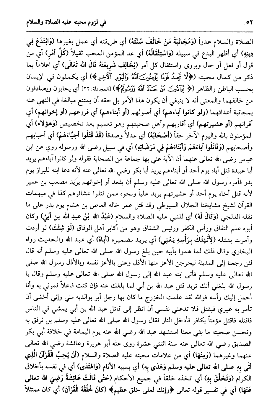 الصلاة والسلام عدوا (ومجانبة من خالف سنّته) أي طريقته أي عمل بغيرها (وابتدع في دينه) أي أظهر البدع في سبيله (واستثقاله) أي عد المؤمن المحب ثقيلا (كلّ أمر) أي من قول أو فعل أو حال ويروى واستثقال كُلَّ أَمْرٍ (يُخَالِفُ شَرِيعَتَهُ قَالَ اللَّهُ تَعَالَى) أي اعلاما بما ذكر من كمال محبته (لَا تَجِدُ قَوْماً يُؤْمِنُونَ بِاللَّهِ وَالْيَوْمِ الْآخِرِ) أي يكملون في الإيمان بحسب الباطن والظاهر (يُوادُّونَ مَنْ حَادَّ اللَّهَ وَرَسُولَهُ) [المجادلة: 22] أي يحابون ويصادقون من خالفهما والمعنى أنه لا ينبغي أن يكون هذا الأمر بل حقه أن يمتنع مبالغة في النهي عنه بمجانبة أعدائهما (ولو كانوا آباءهم) أي أصولهم (أو أبناءهم) أي فروعهم (أو إخوانهم) أي أقرانهم (أو عشيرتهم) أي أقاربهم وأهل صحبتهم وهو تعميم بعد تخصيص (وهؤلاء) أي المؤمنون بالله واليوم الآخر حقا (أصحابه) أي عدلا وصدقا (قد قتلوا أحبّاءهم) أي أحبابهم وأصحابهم (وقاتلوا آباءهم وأبناءهم في مرضاته) أي في سبيل رضى الله ورسوله روي عن ابن عباس رضى الله تعالى عنهما أن الآية عني بها جماعة من الصحابة فقوله ولو كانوا آباءهم يريد أبا عبيدة قتل أباه يوم أحد أو أبناءهم يريد أبا بكر رضي الله تعالى عنه لأنه دعا ابنه للبراز يوم بدر فأمره رسول الله صلى الله تعالى عليه وسلم أن يقعد أو إخوانهم يريد مصعب بن عمير لأنه قتل أخاه يوم أحد أو عشيرتهم يريد عليا ونحوه ممن قتلوا عشائرهم كذا في مبهمات القرآن لشيخ مشايخنا الجلال السيوطي وقد قتل عمر خاله العاص بن هشام يوم بدر على ما نقله الدلجي (وقال له) أي للنبي عليه الصلاة والسلام (عَبْدُ اللَّهِ بْنُ عَبْدِ اللَّهِ بْنِ أُبَيٍّ) وكان أبوه علم النفاق ورأس الكفر ورئيس الشقاق وهو من أكابر أهل الوفاق (لو شئت) لو أردت وأمرت بقتله (لأتيتك برأسه يعني) أي يريد بضميره (أباه) أي عبد الله والحديث رواه البخاري وقال ذلك لما هموا بأبيه حين بلغ رسول الله صلى الله تعالى عليه وسلم أنه قال لَئِنْ رَجَعْنَا إِلَى الْمَدِينَةِ لَيُخْرِجَنَّ الْأَعَزُّ مِنْهَا الأذل وعنى بالأعز نفسه وبالأذل رسول الله صلى الله تعالى عليه وسلم فأتى ابنه عبد الله إلى رسول الله صلى الله تعالى عليه وسلم وقال يا رسول الله بلغني أنك تريد قتل عبد الله بن أبي لما بلغك عنه فإن كنت فاعلا فمرني به وأنا أحمل إليك رأسه فو الله لقد علمت الخزرج ما كان بها رجل أبر بوالديه مني وإني أخشى أن تأمر به غيري فيقتل فلا تدعني نفسي أن انظر إلى قاتل عبد الله بن أبي يمشي في الناس فاقتله فاقتل مؤمنا بكافر فأدخل النار فقال رسول الله صلى الله تعالى عليه وسلم بل نرفق به ونحسن صحبته ما بقي معنا استشهد عبد الله رضي الله عنه يوم اليمامة في خلافة أبي بكر الصديق رضي الله تعالى عنه سنة اثنتي عشرة روى عنه أبو هريرة وعائشة رضي الله تعالى عنهما وغيرهما (ومنها) أي من علامات محبته عليه الصلاة والسلام (أَنْ يُحِبَّ الْقُرْآنَ الَّذِي أَتَى بِهِ صَلَّى الله تعالى عليه وسلم وهدى به) أي بسببه الأنام (واهتدى) أي في نفسه بأخلاق الكرام (وتخلّق به) أي اتخذه خلقا في جميع الأحكام (حتّى قالت عائشة رضي الله تعالى عنها) أي في تفسير قوله تعالى وَإِنَّكَ لَعَلى خُلُقٍ عَظِيمٍ (كان خلقه القرآن) أي كان ممتثلا