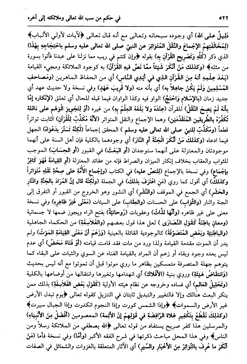 دليل على الله) أي وجوده سبحانه وتعالى مع أنه قال تعالى لَآياتٍ لِأُولِي الْأَلْبابِ (لِمُخَالَفَتِهِمُ الْإِجْمَاعَ وَالنَّقْلَ الْمُتَوَاتِرَ عَنِ النَّبِيِّ صَلَّى الله تعالى عليه وسلم باحتجاجه بهذا) الذي ذكر (كلّه وتصريح القرآن به) بقوله وَإِنْ كُنْتُمْ فِي رَيْبٍ مِمَّا نَزَّلْنا عَلى عَبْدِنا فَأْتُوا بِسُورَةٍ مِنْ مِثْلِهِ (وَكَذَلِكَ مَنْ أَنْكَرَ شَيْئًا مِمَّا نَصَّ فِيهِ القرآن) به كوجود الملائكة ومجيء القيامة (بَعْدَ عِلْمِهِ أَنَّهُ مِنَ الْقُرْآنِ الَّذِي فِي أيدي النّاس) أي من الحفاظ الماهرين (ومصاحف المسلمين ولم يكن جاهلا به) أي بأنه منه (ولا قريب عهد) وفي نسخة ولا حديث عهد أي جديد زمان (بالإسلام واحتجّ) الواو فيه وكذا الواوان فيما قبله للحال أي تعلق (لإنكاره إمّا بأنه لم يصح النّقل) للقرآن (عنده ولا بلغه العلم به) من غيره (أو لتجويز الوهم على ناقلة تكفّره بالطّريقين المتقدّمين) وهما الإجماع والنقل المتواتر (لأنّه مكذّب للقرآن) الثابت تواترا قطعا (ومكذّب للنبيّ صلى الله تعالى عليه وسلم) المحقق إجماعا (لكنّه تستّر بدعواه) الجهل فيما ادعاه (وكذلك من أنكر الجنّة أو النّار) أي وجودهما بالكلية فإن أهل السنة على أنهما موجودتان والمعتزلة على أنهما ستوجدان (أو البعث) في القبور (أو الحساب) الموجب للثواب والعقاب بخلاف إنكار الميزان والصراط فإنه من عقائد المعتزلة (أو القيامة فهو كافر بإجماع) وفي نسخة بالإجماع (للنصّ عليه) في الكتاب (وَإِجْمَاعِ الْأُمَّةِ عَلَى صِحَّةِ نَقْلِهِ مُتَوَاتِرًا وَكَذَلِكَ) أي أقول كما روي (من اعترف بذلك) في الجملة (وَلَكِنَّهُ قَالَ إِنَّ الْمُرَادَ بِالْجَنَّةِ وَالنَّارِ وَالْحَشْرِ) أي الجمع في الموقف (والنّشر) أي النشور وهو الخروج من القبور أو التفرق إلى الجنة والنار (والثّواب) على الحسنات (والعقاب) على السيئات (معنى غير ظاهره) وفي نسخة معنى على غير ظاهره (وأنّها لذّات) وعقوبات (روحانيّة) بفتح الراء ويجوز ضمها لا جسمانية (ومعان باطنة كقول النّصارى) لعل هذا قول بعضهم (والفلاسفة) من الحكماء الجاهلية (والباطنيّة وبعض المتصوّفة) كالوجودية القائلة بالعينية (وزعم أنّ معنى القيامة الموت) ولم يدر أن الموت مقدمة القيامة ولذا ورد من مات فقد قامت قيامته (أو فناء محض) أي عدم ليس بعده وجود وبقاء أو زعم أن المراد بالقيامة الفناء عن السوي والثبات على البقاء كما يتوهم جهلة المتصرفة متمسكين بظاهر ما روي موتوا قبل أن تموتوا مع أنه ليس بحديث (وانتقاض هيئة) وروي بنية (الأفلاك) أي انهدامها وتغيرها وانتقالها من أوضاعها بالكلية (وتحليل العالم) أي فساده وخروجه عن نظام هيئة الأولية (كقول بعض الفلاسفة) بذلك ممن ينكر البعث هنالك وإلا فالتغيير والتبديل ثابتان في التنزيل كقوله تعالى يَوْمَ تُبَدَّلُ الْأَرْضُ غَيْرَ الْأَرْضِ وَالسَّماواتُ إِذَا الشَّمْسُ كُوِّرَتْ وَإِذَا النُّجُومُ انْكَدَرَتْ وَإِذَا الْجِبالُ سُيِّرَتْ (وَكَذَلِكَ نَقْطَعُ بِتَكْفِيرِ غُلَاةِ الرَّافِضَةِ فِي قَوْلِهِمْ إنّ الأئمة) المعصومين (أفضل من الأنبياء) والمرسلين هذا كفر صريح يستفاد من قوله تعالى اللَّهُ يَصْطَفِي مِنَ الْمَلائِكَةِ رُسُلًا وَمِنَ النَّاسِ وفي هذا المحل مباحث ذكرتها في شرح الفقه الأكبر (وأمّا) وفي نسخة فَأَمَّا (مَنْ أَنْكَرَ مَا عُرِفَ بِالتَّوَاتُرِ مِنَ الأخبار والسّير) أي الآثار المتعلقة بالغزوات والشمائل في الصفات
