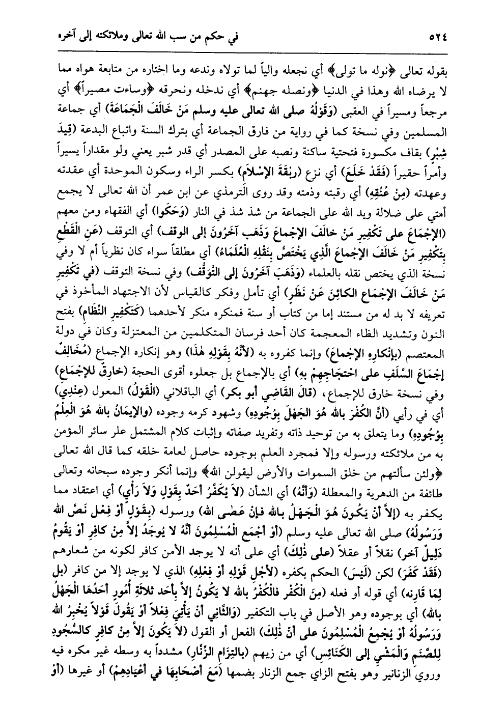 بقوله تعالى نُوَلِّهِ ما تَوَلَّى أي نجعله واليا لما تولاه وندعه وما اختاره من متابعة هواه مما لا يرضاه الله وهذا في الدنيا وَنُصْلِهِ جَهَنَّمَ أي ندخله ونحرقه وَساءَتْ مَصِيراً أي مرجعا ومسيرا في العقبى (وقوله صلى الله تعالى عليه وسلم من خالف الجماعة) أي جماعة المسلمين وفي نسخة كما في رواية من فارق الجماعة أي بترك السنة واتباع البدعة (قيد شبر) بقاف مكسورة فتحتية ساكنة ونصبه على المصدر أي قدر شبر يعني ولو مقدارا يسيرا وأمرا حقيرا (فقد خلع) أي نزع (ربقة الإسلام) بكسر الراء وسكون الموحدة أي عقدته وعهدته (من عنقه) أي رقبته وذمته وقد روى الترمذي عن ابن عمر أن الله تعالى لا يجمع أمتي على ضلالة ويد الله على الجماعة من شذ شذ في النار (وحكوا) أي الفقهاء ومن معهم (الْإِجْمَاعَ عَلَى تَكْفِيرِ مَنْ خَالَفَ الْإِجْمَاعَ وَذَهَبَ آخرون إلى الوقف) أي التوقف (عَنِ الْقَطْعِ بِتَكْفِيرِ مَنْ خَالَفَ الْإِجْمَاعَ الَّذِي يختصّ بنقله العلماء) أي مطلقا سواء كان نظريا أم لا وفي نسخة الذي يختص نقله بالعلماء (وذهب آخرون إلى التّوقّف) وفي نسخة التَّوَقُّفِ (فِي تَكْفِيرِ مَنْ خَالَفَ الْإِجْمَاعَ الْكَائِنَ عن نظر) أي تأمل وفكر كالقياس لأن الاجتهاد المأخوذ في تعريفه لا بد له من مستند إما من كتاب أو سنة فمنكره منكر لأحدهما (كتكفير النّظام) بفتح النون وتشديد الظاء المعجمة كان أحد فرسان المتكلمين من المعتزلة وكان في دولة المعتصم (بإنكاره الإجماع) وإنما كفروه به (لأنّه بقوله هذا) وهو إنكاره الإجماع (مخالف إجماع السّلف على احتجاجهم به) أي بالإجماع بل جعلوه أقوى الحجة (خارق للإجماع) وفي نسخة خارق للإجماع، (قال القاضي أبو بكر) أي الباقلاني (القول) المعول (عندي) أي في رأيي (أنّ الكفر بالله هو الجهل بوجوده) وشهود كرمه وجوده (والإيمان بالله هو العلم بوجوده) وما يتعلق به من توحيد ذاته وتفريد صفاته وإثبات كلام المشتمل علر سائر المؤمن به من ملائكته ورسوله وإلا فمجرد العلم بوجوده حاصل لعامة خلقه كما قال الله تعالى وَلَئِنْ سَأَلْتَهُمْ مَنْ خَلَقَ السَّماواتِ وَالْأَرْضَ لَيَقُولُنَّ اللَّهُ وإنما أنكر وجوده سبحانه وتعالى طائفة من الدهرية والمعطلة (وأنّه) أي الشأن (لا يكفّر أحد بقول ولا رأي) أي اعتقاد مما يكفر به (إِلَّا أَنْ يَكُونَ هُوَ الْجَهْلُ بِاللَّهِ فَإِنْ عصى الله) ورسوله (بقول أو فعل نصّ الله ورسوله) صلى الله تعالى عليه وسلم (أَوْ أَجْمَعَ الْمُسْلِمُونَ أَنَّهُ لَا يُوجَدُ إِلَّا من كافر أو يقوم دليل آخر) نقلا أو عقلا (على ذلك) أي على أنه لا يوجد الأمن كافر لكونه من شعارهم (فقد كفر) لكن (ليس) الحكم بكفره (لأجل قوله أو فعله) الذي لا يوجد إلا من كافر (بل لما قارنه) أي قوله أو فعله (مِنَ الْكُفْرِ فَالْكُفْرُ بِاللَّهِ لَا يَكُونُ إِلَّا بأحد ثلاثة أمور أحدها الجهل بالله) أي بوجوده وهو الأصل في باب التكفير (وَالثَّانِي أَنْ يَأْتِيَ فِعْلًا أَوْ يَقُولَ قَوْلًا يخبر الله ورسوله أو يجمع المسلمون على أنّ ذلك) الفعل أو القول (لَا يَكُونُ إِلَّا مِنْ كَافِرٍ كَالسُّجُودِ لِلصَّنَمِ والمشي إلى الكنائس) أي من زيهم (بالتزام الزّنّار) مشددا به وسطه غير مكره فيه وروي الزنانير وهو بفتح الزاي جمع الزنار بضمها (مع أصحابها في أعيادهم) أو غيرها (أو