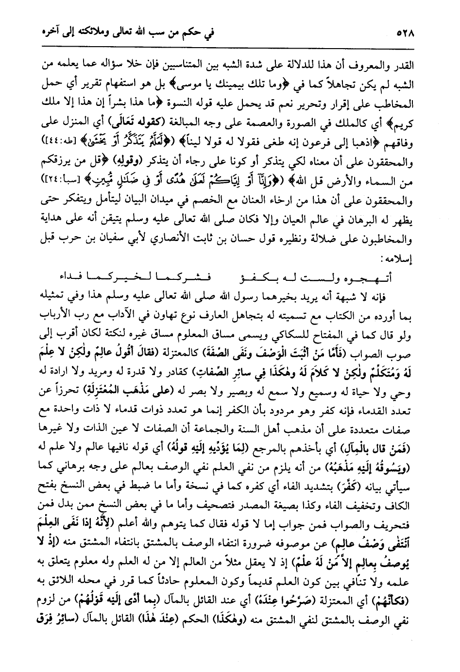 فإنه لا شبهة أنه يريد بخيرهما رسول الله صلى الله تعالى عليه وسلم هذا وفي تمثيله بما أورده من الكتاب مع تسميته له بتجاهل العارف نوع تهاون في الآداب مع رب الأرباب ولو قال كما في المفتاح للسكاكي ويسمى مساق المعلوم مساق غيره لنكتة لكان أقرب إلى صوب الصواب (فأمّا من أثبت الوصف ونفى الصّفة) كالمعتزلة (فَقَالَ أَقُولُ عَالِمٌ وَلَكِنْ لَا عِلْمَ لَهُ وَمُتَكَلِّمٌ وَلَكِنْ لَا كَلَامَ لَهُ وَهَكَذَا فِي سائر الصّفات) كقادر ولا قدرة له ومريد ولا ارادة له وحي ولا حياة له وسميع ولا سمع له وبصير ولا بصر له (على مذهب المعتزلة) تحرزا عن تعدد القدماء فإنه كفر وهو مردود بأن الكفر إنما هو تعدد ذوات قدماء لا ذات واحدة مع صفات متعددة على أن مذهب أهل السنة والجماعة أن الصفات لا عين الذات ولا غيرها (فمن قال بالمال) أي بأخذهم بالمرجع (لما يؤدّيه إليه قوله) أي قوله نافيها عالم ولا علم له (ويسوقه إليه مذهبه) من أنه يلزم من نفي العلم نفي الوصف بعالم على وجه برهاني كما سيأتي بيانه (كفّر) بتشديد الفاء أي كفره كما في نسخة وأما ما ضبط في بعض النسخ بفتح الكاف وتخفيف الفاء وكذا بصيغة المصدر فتصحيف وأما ما في بعض النسخ ممن بدل فمن فتحريف والصواب فمن جواب إما لا قوله فقال كما يتوهم والله أعلم (لِأَنَّهُ إِذَا نَفَى الْعِلْمَ انْتَفَى وَصْفُ عَالِمٍ) عن موصوفه ضرورة انتفاء الوصف بالمشتق بانتفاء المشتق منه (إِذْ لَا يُوصَفُ بِعَالِمٍ إِلَّا مَنْ لَهُ علم) إذ لا يعقل مثلا من العالم إلا من له العلم وله معلوم يتعلق به علمه ولا تنّافي بين كون العلم قديما وكون المعلوم حادثا كما قرر في محله اللائق به (فكأنّهم) أي المعتزلة (صرّحوا عنده) أي عند القائل بالمآل (بما أدّى إليه قولهم) من لزوم نفي الوصف بالمشتق لنفي المشتق منه (وهكذا) الحكم (عند هذا) القائل بالمآل (سائر فرق