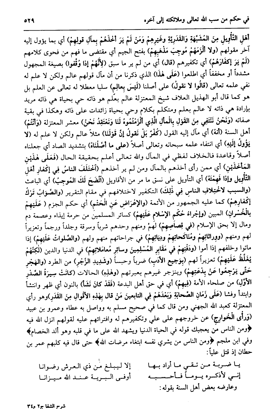 أَهْلِ التَّأْوِيلِ مِنَ الْمُشَبِّهَةِ وَالْقَدَرِيَّةِ وَغَيْرِهِمْ وَمَنْ لم ير أخذهم بمآل قولهم) أي بما يؤول إليه آخر مقولهم (ولا ألزمهم موجب مذهبهم) بفتح الجيم أي مقتضى ما فهم من فحوى كلامهم (لم ير إكفارهم) أي تكفيرهم (قال) أي من لم ير ما سبق (لأنّهم إذا وقّفوا) بصيغة المجهول مشددا أو مخففا أي اطلعوا (على هذا) الذي ذكرنا من أن مآل قولهم عالم ولكن لا علم له نفي علمه تعالى (قالوا لا نقول) على أصلنا (ليس بعالم) سلبا معطلا له تعالى عن العلم بل هو كما قال أبو الهذيل العلاف شيخ المعتزلة عالم بعلم هو ذاته حي بحياة هي ذاته مريد بإرادة هي ذاته لا عالم بعلم ومتكلم بكلام وحي بحياة زائدات على ذاته وهكذا في بقية صفاته (ونحن ننتفي من القول بالمأل الّذي ألزمتموه لنا ونعتقد نحن) معشر المعتزلة (وأنتم) أهل السنة (أنه) أي مآل إليه القول (كفر بل نقول إنّ قولنا) مثلا عالم ولكن لا علم له (لا يؤول إليه) أي انتفاء علمه سبحانه وتعالى أصلا (على ما أصّلناه) بتشديد الصاد أي جعلناه أصلا وقاعدة فالخلاف لفظي في المآل والله تعالى أعلم بحقيقة الحال (فعلى هذين المأخذين) أي ممن رأى أخذهم بالمآل ومن لم ير أخذهم (اخْتَلَفَ النَّاسُ فِي إِكْفَارِ أَهْلِ التَّأْوِيلِ وَإِذَا فهمته) أي التأويل على نسق ما مر من الأقاويل (اتّضح لك الموجب) أي الباعث (والسبب لاختلاف الناس في ذلك) التكفير لاختلافهم في مقام التقرير (والصّواب ترك إكفارهم) كما عليه الجمهور من الأئمة (والإعراض عن الحتم) أي حكم الجزم (عليهم بالخسران) المبين (وإجراء حكم الإسلام عليهم) كسائر المسلمين من حرمة إيذاء وعصمة دم ومال إلا بحق الإسلام (في قصاصهم) لهم ومنهم وحدهم شربا وسرقة وجلدا ورجما وتعزيرا لهم ومنهم (ووراثاتهم ومناكحاتهم ودياتهم) في جراحاتهم منهم ولهم (والصّلوات عليهم) إذا ماتوا وخلفهم إذا أموا (ودفنهم في مقابر المسلمين وسائر معاملاتهم) في الدنيا والدين (لكنّهم يغلّظ عليهم) تعزيرا لهم (بوجيع الأدب) ضربا وحبسا (وشديد الزّجر) من الطرد (والهجر حتّى يرجعوا عن بدعتهم) وينزجر غيرهم بعبرتهم (وهذه) الحالات (كانت سيرة الصّدر الأوّل) من صلحاء الأمة (فيهم) أي في حق أهل البدعة (فقد كان نشأ) بالنون أي ظهر وانتشأ وابتدأ وفشا (عَلَى زَمَانِ الصَّحَابَةِ وَبَعْدَهُمْ فِي التَّابِعِينَ مَنْ قال بهذه الأقوال من القدر) وهو رأي المعتزلة كعبد الله الجهني ومن قال كما في صحيح مسلم به وواصل به عطاء وعمرو بن عبيد (ورأى الخوارج) عن خروجهم على علي وتكفيرهم له وافترائهم عليه لقولهم انزل الله فيه وَمِنَ النَّاسِ مَنْ يُعْجِبُكَ قَوْلُهُ فِي الْحَياةِ الدُّنْيا وَيُشْهِدُ اللَّهَ عَلى ما فِي قَلْبِهِ وَهُوَ أَلَدُّ الْخِصامِ وفي ابن ملجم وَمِنَ النَّاسِ مَنْ يَشْرِي نَفْسَهُ ابْتِغاءَ مَرْضاتِ اللَّهِ حتى قال فيه كلبهم عمر بن حطان إذ قتل عليا: