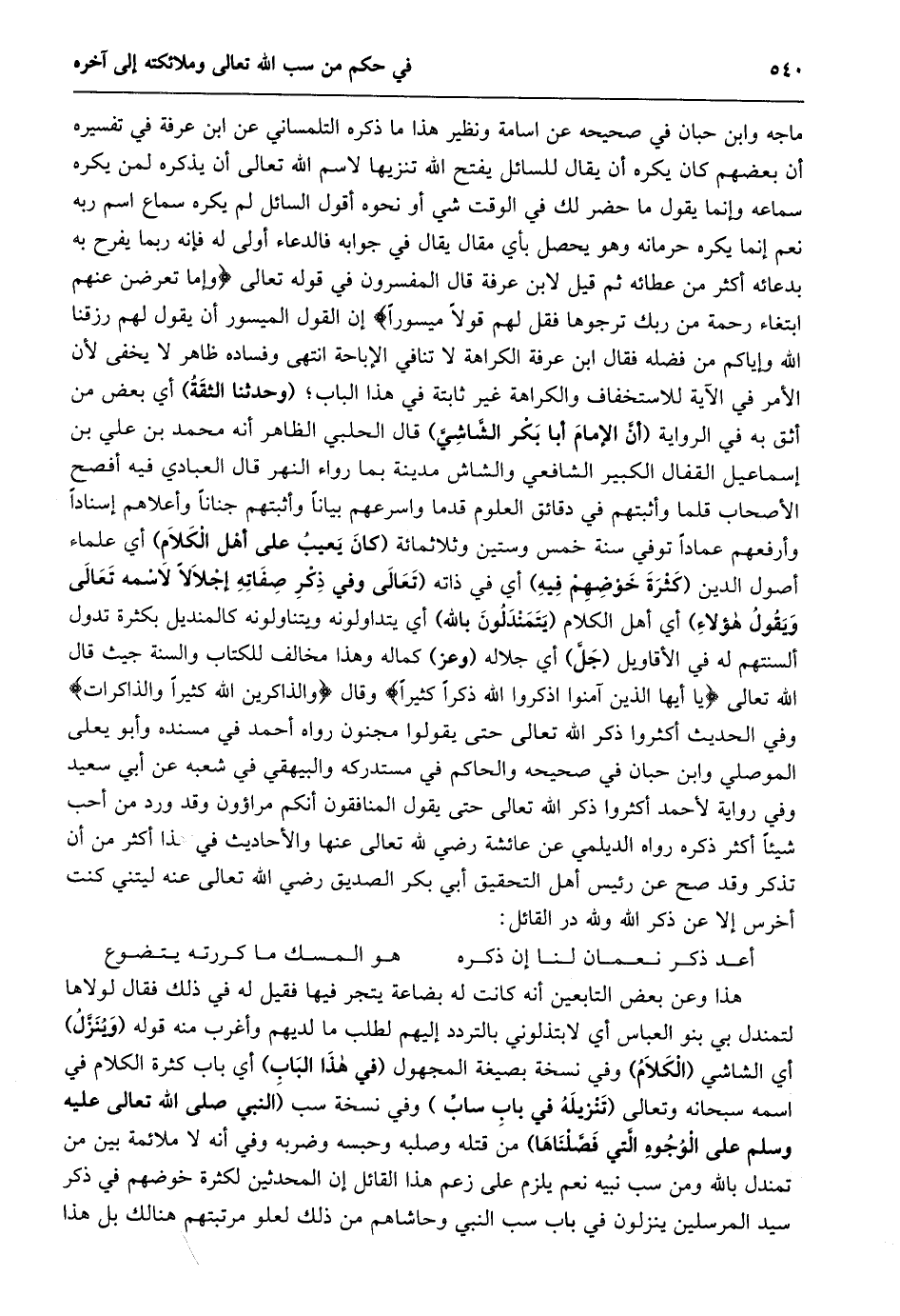 ماجه وابن حبان في صحيحه عن اسامة ونظير هذا ما ذكره التلمساني عن ابن عرفة في تفسيره أن بعضهم كان يكره أن يقال للسائل يفتح الله تنزيها لاسم الله تعالى أن يذكره لمن يكره سماعه وإنما يقول ما حضر لك في الوقت شي أو نحوه أقول السائل لم يكره سماع اسم ربه نعم إنما يكره حرمانه وهو يحصل بأي مقال يقال في جوابه فالدعاء أولى له فإنه ربما يفرح به بدعائه أكثر من عطائه ثم قيل لابن عرفة قال المفسرون في قوله تعالى وَإِمَّا تُعْرِضَنَّ عَنْهُمُ ابْتِغاءَ رَحْمَةٍ مِنْ رَبِّكَ تَرْجُوها فَقُلْ لَهُمْ قَوْلًا مَيْسُوراً إن القول الميسور أن يقول لهم رزقنا الله وإياكم من فضله فقال ابن عرفة الكراهة لا تنافي الإباحة انتهى وفساده ظاهر لا يخفى لأن الأمر في الآية للاستخفاف والكراهة غير ثابتة في هذا الباب؛ (وحدثنا الثقة) أي بعض من أثق به في الرواية (أنّ الإمام أبا بكر الشّاشيّ) قال الحلبي الظاهر أنه محمد بن علي بن إسماعيل القفال الكبير الشافعي والشاش مدينة بما رواء النهر قال العبادي فيه أفصح الأصحاب قلما وأثبتهم في دقائق العلوم قدما واسرعهم بيانا وأثبتهم جنانا وأعلاهم إسنادا وأرفعهم عمادا توفي سنة خمس وستين وثلاثمائة (كان يعيب على أهل الكلام) أي علماء أصول الدين (كثرة خوضهم فيه) أي في ذاته (تَعَالَى وَفِي ذِكْرِ صِفَاتِهِ إِجْلَالًا لِاسْمِهِ تَعَالَى ويقول هؤلاء) أي أهل الكلام (يتمندلون بالله) أي يتداولونه ويتناولونه كالمنديل بكثرة تدول ألسنتهم له في الأقاويل (جلّ) أي جلاله (وعز) كماله وهذا مخالف للكتاب والسنة جيث قال الله تعالى يا أَيُّهَا الَّذِينَ آمَنُوا اذْكُرُوا اللَّهَ ذِكْراً كَثِيراً وقال وَالذَّاكِرِينَ اللَّهَ كَثِيراً وَالذَّاكِراتِ وفي الحديث أكثروا ذكر الله تعالى حتى يقولوا مجنون رواه أحمد في مسنده وأبو يعلى الموصلي وابن حبان في صحيحه والحاكم في مستدركه والبيهقي في شعبه عن أبي سعيد وفي رواية لأحمد أكثروا ذكر الله تعالى حتى يقول المنافقون أنكم مراؤون وقد ورد من أحب شيئا أكثر ذكره رواه الديلمي عن عائشة رضي لله تعالى عنها والأحاديث في هذا أكثر من أن تذكر وقد صح عن رئيس أهل التحقيق أبي بكر الصديق رضي الله تعالى عنه ليتني كنت أخرس إلا عن ذكر الله ولله در القائل: