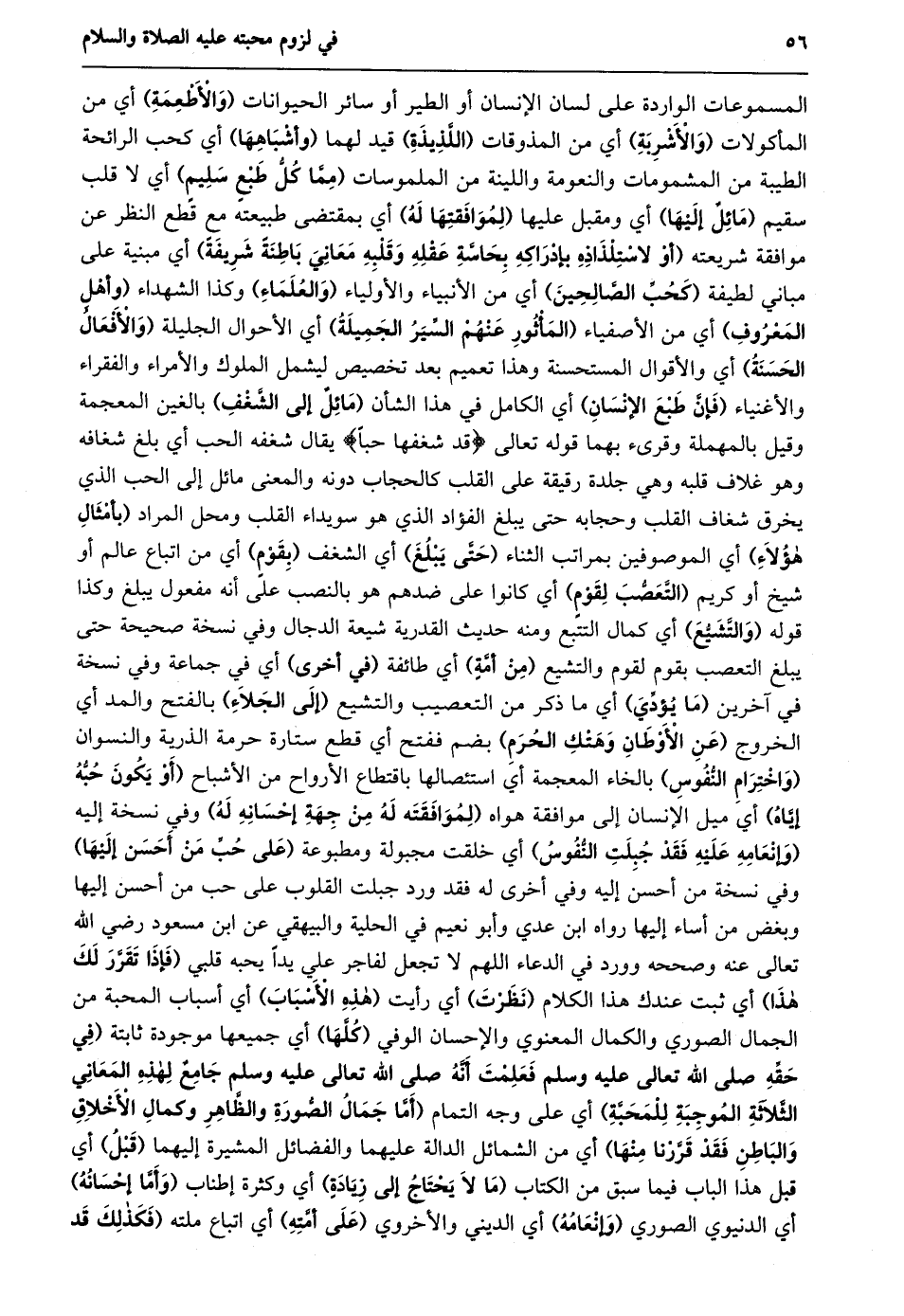 المسموعات الواردة على لسان الإنسان أو الطير أو سائر الحيوانات (والأطعمة) أي من المأكولات (والأشربة) أي من المذوقات (اللّذيذة) قيد لهما (وأشباهها) أي كحب الرائحة الطيبة من المشمومات والنعومة واللينة من الملموسات (ممّا كلّ طبع سليم) أي لا قلب سقيم (مائل إليها) أي ومقبل عليها (لموافقتها له) أي بمقتضى طبيعته مع قطع النظر عن موافقة شريعته (أَوْ لِاسْتِلْذَاذِهِ بِإِدْرَاكِهِ بِحَاسَّةِ عَقْلِهِ وَقَلْبِهِ مَعَانِيَ باطنة شريفة) أي مبنية على مباني لطيفة (كحبّ الصّالحين) أي من الأنبياء والأولياء (والعلماء) وكذا الشهداء (وأهل المعروف) أي من الأصفياء (المأثور عنهم السّير الجميلة) أي الأحوال الجليلة (والأفعال الحسنة) أي والأقوال المستحسنة وهذا تعميم بعد تخصيص ليشمل الملوك والأمراء والفقراء والأغنياء (فإنّ طبع الإنسان) أي الكامل في هذا الشأن (مائل إلى الشّغف) بالغين المعجمة وقيل بالمهملة وقرىء بهما قوله تعالى قَدْ شَغَفَها حُبًّا يقال شغفه الحب أي بلغ شغافه وهو غلاف قلبه وهي جلدة رقيقة على القلب كالحجاب دونه والمعنى مائل إلى الحب الذي يخرق شغاف القلب وحجابه حتى يبلغ الفؤاد الذي هو سويداء القلب ومحل المراد (بأمثال هؤلاء) أي الموصوفين بمراتب الثناء (حتّى يبلغ) أي الشغف (بقوم) أي من اتباع عالم أو شيخ أو كريم (التّعصّب لقوم) أي كانوا على ضدهم هو بالنصب علىّ أنه مفعول يبلغ وكذا قوله (والتّشيّع) أي كمال التتّبع ومنه حديث القدرية شيعة الدجال وفي نسخة صحيحة حَتَّى يَبْلُغَ التَّعَصُّبُ بِقَوْمٍ لِقَوْمٍ وَالتَّشَيُّعُ (مِنْ أمّة) أي طائفة (في أخرى) أي في جماعة وفي نسخة في آخرين (ما يؤدّي) أي ما ذكر من التعصيب والتشيع (إلى الجلاء) بالفتح والمد أي الخروج (عن الأوطان وهتك الحرم) بضم ففتح أي قطع ستارة حرمة الذرية والنسوان (واخترام النّفوس) بالخاء المعجمة أي استئصالها باقتطاع الأرواح من الأشباح (أو يكون حبّه إيّاه) أي ميل الإنسان إلى موافقة هواه (لموافقته له من جهة إحسانه له) وفي نسخة إليه (وإنعامه عليه فقد جبلت النّفوس) أي خلقت مجبولة ومطبوعة (على حبّ من أحسن إليها) وفي نسخة من أحسن إليه وفي أخرى له فقد ورد جبلت القلوب على حب من أحسن إليها وبغض من أساء إليها رواه ابن عدي وأبو نعيم في الحلية والبيهقي عن ابن مسعود رضي الله تعالى عنه وصححه وورد في الدعاء اللهم لا تجعل لفاجر على يدا يحبه قلبي (فإذا تقرّر لك هذا) أي ثبت عندك هذا الكلام (نظرت) أي رأيت (هذه الأسباب) أي أسباب المحبة من الجمال الصوري والكمال المعنوي والإحسان الوفي (كلّها) أي جميعها موجودة ثابتة (في حقّه صلى الله تعالى عليه وسلم فعلمت أنّه صلى الله تعالى عَلَيْهِ وَسَلَّمَ جَامِعٌ لِهَذِهِ الْمَعَانِي الثَّلَاثَةِ الْمُوجِبَةِ للمحبّة) أي على وجه التمام (أَمَّا جَمَالُ الصُّورَةِ وَالظَّاهِرِ وَكَمَالُ الْأَخْلَاقِ وَالْبَاطِنِ فقد قرّرنا منها) أي من الشمائل الدالة عليهما والفضائل المشيرة إليهما (قبل) أي قبل هذا الباب فيما سبق من الكتاب (ما لا يحتاج إلى زيادة) أي وكثرة إطناب (وأمّا إحسانه) أي الدنيوي الصوري (وإنعامه) أي الديني والأخروي (على أمّته) أي اتباع ملته (فكذلك قد