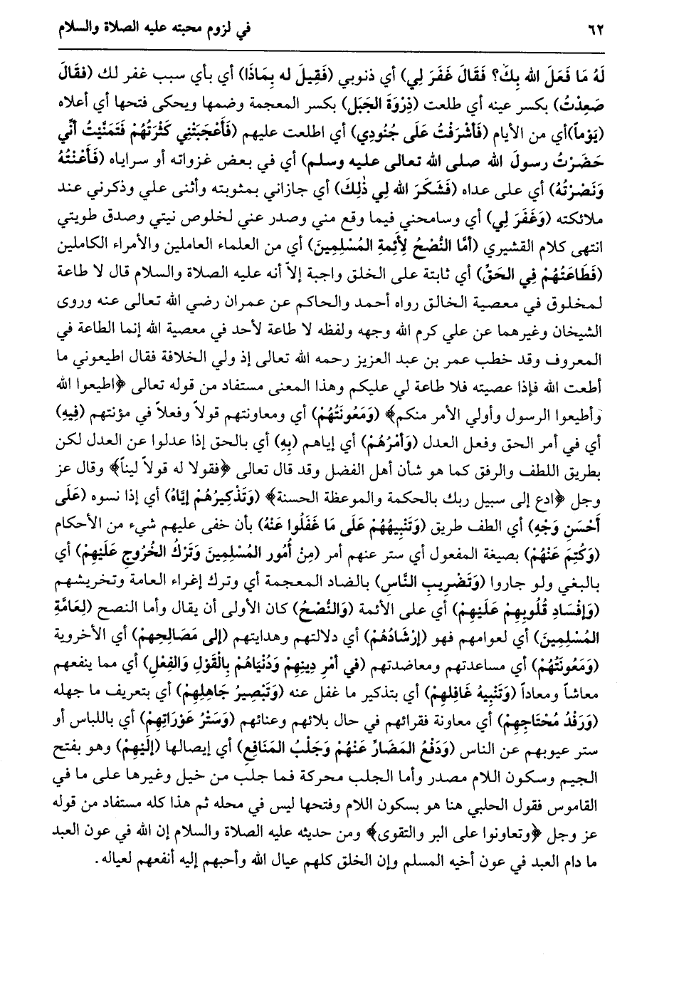 لَهُ مَا فَعَلَ اللَّهُ بِكَ؟ فَقَالَ غَفَرَ لي) أي ذنوبي (فقيل له بماذا) أي بأي سبب غفر لك (فقال صعدت) بكسر عينه أي طلعت (ذروة الجبل) بكسر المعجمة وضمها ويحكى فتحها أي أعلاه (يوما) أي من الأيام (فأشرفت على جنودي) أي اطلعت عليهم (فَأَعْجَبَتْنِي كَثْرَتُهُمْ فَتَمَنَّيْتُ أَنِّي حَضَرْتُ رَسُولَ اللَّهِ صلى الله تعالى عليه وسلم) أي في بعض غزواته أو سراياه (فأعنته ونصرته) أي على عداه (فشكر الله لي ذلك) أي جازاني بمثوبته وأثنى علي وذكرني عند ملائكته (وغفر لي) أي وسامحني فيما وقع مني وصدر عني لخلوص نيتي وصدق طويتي انتهى كلام القشيري (أمّا النّصح لأئمة المسلمين) أي من العلماء العاملين والأمراء الكاملين (فطاعتهم في الحقّ) أي ثابتة على الخلق واجبة إلّا أنه عليه الصلاة والسلام قال لا طاعة لمخلوق في معصية الخالق رواه أحمد والحاكم عن عمران رضي الله تعالى عنه وروى الشيخان وغيرهما عن علي كرم الله وجهه ولفظه لا طاعة لأحد في معصية الله إنما الطاعة في المعروف وقد خطب عمر بن عبد العزيز رحمه الله تعالى إذ ولي الخلافة فقال اطيعوني ما أطعت الله فإذا عصيته فلا طاعة لي عليكم وهذا المعنى مستفاد من قوله تعالى أَطِيعُوا اللَّهَ وَأَطِيعُوا الرَّسُولَ وَأُولِي الْأَمْرِ مِنْكُمْ (ومعونتهم) أي ومعاونتهم قولا وفعلا في مؤنتهم (فيه) أي في أمر الحق وفعل العدل (وأمرهم) أي إياهم (به) أي بالحق إذا عدلوا عن العدل لكن بطريق اللطف والرفق كما هو شأن أهل الفضل وقد قال تعالى فَقُولا لَهُ قَوْلًا لَيِّناً وقال عز وجل ادْعُ إِلى سَبِيلِ رَبِّكَ بِالْحِكْمَةِ وَالْمَوْعِظَةِ الْحَسَنَةِ (وتذكيرهم إيّاه) أي إذا نسوه (على أحسن وجه) أي الطف طريق (وتنبيههم على ما غفلوا عنه) بأن خفى عليهم شيء من الأحكام (وكتم عنهم) بصيغة المفعول أي ستر عنهم أمر (من أمور المسلمين وترك الخروج عليهم) أي بالبغي ولو جاروا (وتضريب النّاس) بالضاد المعجمة أي وترك إغراء العامة وتخريشهم (وإفساد قلوبهم عليهم) أي على الأئمة (والنّصح) كان الأولى أن يقال وأما النصح (لعامّة المسلمين) أي لعوامهم فهو (إرشادهم) أي دلالتهم وهدايتهم (إلى مصالحهم) أي الأخروية (ومعونتهم) أي مساعدتهم ومعاضدتهم (في أمر دينهم ودنياهم بالقول والفعل) أي مما ينفعهم معاشا ومعادا (وتنبيه غافلهم) أي بتذكير ما غفل عنه (وتبصير جاهلهم) أي بتعريف ما جهله (ورفد محتاجهم) أي معاونة فقرائهم في حال بلائهم وعنائهم (وستر عوراتهم) أي باللباس أو ستر عيوبهم عن الناس (ودفع المضارّ عنهم وجلب المنافع) أي إيصالها (إليهم) وهو بفتح الجيم وسكون اللام مصدر وأما الجلب محركة فما جلب من خيل وغيرها على ما في القاموس فقول الحلبي هنا هو بسكون اللام وفتحها ليس في محله ثم هذا كله مستفاد من قوله عز وجل وَتَعاوَنُوا عَلَى الْبِرِّ وَالتَّقْوى ومن حديثه عليه الصلاة والسلام إن الله في عون العبد ما دام العبد في عون أخيه المسلم وإن الخلق كلهم عيال الله وأحبهم إليه أنفعهم لعياله.