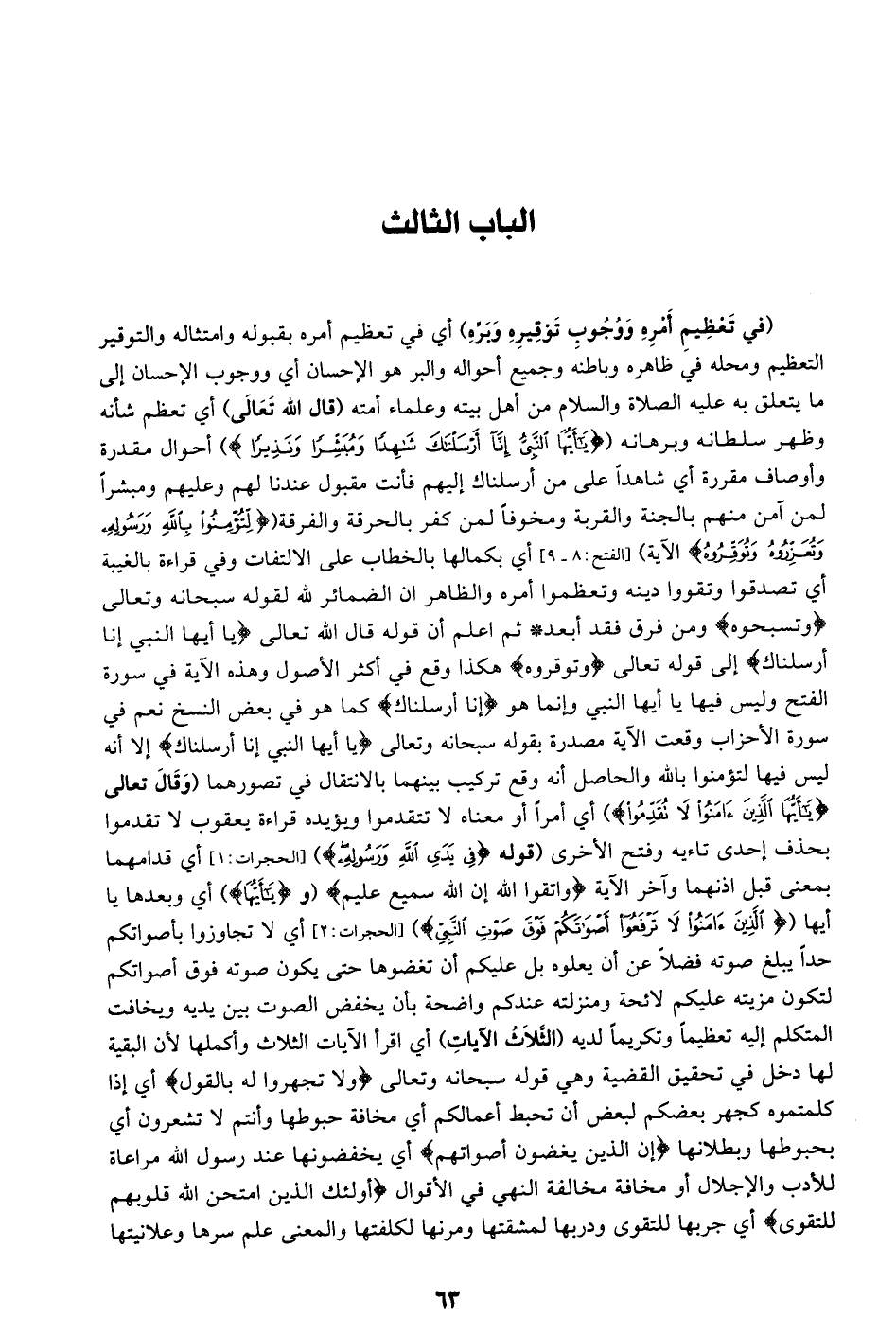 (في تعظيم أمره ووجوب توقيره وبرّه) أي في تعظيم أمره بقبوله وامتثاله والتوقير التعظيم ومحله في ظاهره وباطنه وجميع أحواله والبر هو الإحسان أي ووجوب الإحسان إلى ما يتعلق به عليه الصلاة والسلام من أهل بيته وعلماء أمته (قال الله تعالى) أي تعظم شأنه وظهر سلطانه وبرهانه (يَا أَيُّهَا النَّبِيُّ إِنَّا أَرْسَلْناكَ شاهِداً وَمُبَشِّراً وَنَذِيراً) أحوال مقدرة وأوصاف مقررة أي شاهدا على من أرسلناك إليهم فأنت مقبول عندنا لهم وعليهم ومبشرا لمن آمن منهم بالجنة والقربة ومخوفا لمن كفر بالحرقة والفرقة (لِتُؤْمِنُوا بِاللَّهِ وَرَسُولِهِ وَتُعَزِّرُوهُ وَتُوَقِّرُوهُ الآية) [الفتح: 8- 9] أي بكمالها بالخطاب على الالتفات وفي قراءة بالغيبة أي تصدقوا وتقووا دينه وتعظموا أمره والظاهر ان الضمائر لله لقوله سبحانه وتعالى وَتُسَبِّحُوهُ ومن فرق فقد أبعد* ثم اعلم أن قوله قال الله تعالى يا أَيُّهَا النَّبِيُّ إِنَّا أَرْسَلْناكَ إلى قوله تعالى وَتُوَقِّرُوهُ هكذا وقع في أكثر الأصول وهذه الآية في سورة الفتح وليس فيها يا أيها النبي وإنما هو إِنَّا أَرْسَلْناكَ كما هو في بعض النسخ نعم في سورة الأحزاب وقعت الآية مصدرة بقوله سبحانه وتعالى يا أَيُّهَا النَّبِيُّ إِنَّا أَرْسَلْناكَ إلا أنه ليس فيها لتؤمنوا بالله والحاصل أنه وقع تركيب بينهما بالانتقال في تصورهما (وقال تعالى يا أَيُّهَا الَّذِينَ آمَنُوا لا تُقَدِّمُوا) أي أمرا أو معناه لا تتقدموا ويؤيده قراءة يعقوب لا تقدموا بحذف إحدى تاءيه وفتح الأخرى (قوله بَيْنَ يَدَيِ اللَّهِ وَرَسُولِهِ) [الحجرات: 1] أي قدامهما بمعنى قبل اذنهما وآخر الآية وَاتَّقُوا اللَّهَ إِنَّ اللَّهَ سَمِيعٌ عَلِيمٌ (ويا أَيُّهَا) أي وبعدها يا أيها (الَّذِينَ آمَنُوا لَا تَرْفَعُوا أَصْواتَكُمْ فَوْقَ صَوْتِ النَّبِيِّ) [الحجرات: 2] أي لا تجاوزوا بأصواتكم حدا يبلغ صوته فضلا عن أن يعلوه بل عليكم أن تغضوها حتى يكون صوته فوق أصواتكم لتكون مزيته عليكم لائحة ومنزلته عندكم واضحة بأن يخفض الصوت بين يديه ويخافت المتكلم إليه تعظيما وتكريما لديه (الثّلاث الآيات) أي اقرأ الآيات الثلاث وأكملها لأن البقية لها دخل في تحقيق القضية وهي قوله سبحانه وتعالى وَلا تَجْهَرُوا لَهُ بِالْقَوْلِ أي إذا كلمتموه كجهر بعضكم لبعض أن تحبط أعمالكم أي مخافة حبوطها وأنتم لا تشعرون أي بحبوطها وبطلانها إِنَّ الَّذِينَ يَغُضُّونَ أَصْواتَهُمْ أي يخفضونها عند رسول الله مراعاة للأدب والإجلال أو مخافة مخالفة النهي في الأقوال أُولئِكَ الَّذِينَ امْتَحَنَ اللَّهُ قُلُوبَهُمْ لِلتَّقْوى أي جربها للتقوى ودربها لمشقتها ومرنها لكلفتها والمعنى علم سرها وعلانيتها