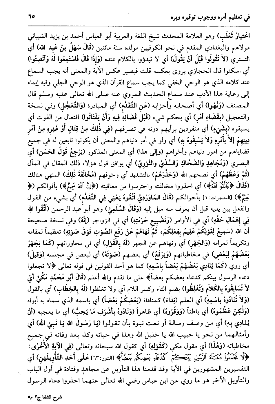اختيار ثعلب) وهو العلامة المحدث شيخ اللغة والعربية أبو العباس أحمد بن يزيد الشيباني مولاهم والبغدادي المقدم في نحو الكوفيين مولده سنة مائتين (قال سهل بن عبد الله) أي التستري (لا تقولوا قبل أن يقول) أي لا تبدؤوا بالكلام عنده (وإذا قال فاستمعوا له وأنصتوا) أي اسكتوا قال الحجازي يروى بعكسه قلت فيصير عكس الآية والمعنى أنه يجب السماع عند كلامه الذي هو الوحي الخفي كما يجب سماع القرآن الذي هو الوحي الجلي وفيه إيماء إلى رعاية هذا الأدب عند سماع الحديث المروي عنه صلى الله تعالى عليه وسلم قال المصنف (ونهوا) أي أصحابه وأحزابه (عن التّقدّم) أي المبادرة (والتّعجّل) وفي نسخة والتعجيل (بقضاء أمر) أي بحكم شيء (قبل قضائه فيه وأن يفتاتوا) افتعال من الفوت أي يسبقوه (بشيء) أي منفردين برأيهم دونه في تصرفهم (فِي ذَلِكَ مِنْ قِتَالٍ أَوْ غَيْرِهِ مِنْ أمر دينهم إلا بأمره ولا يسبقوه به) أي ولو في أمر دنياهم والمعنى أن يكونوا تابعين له في جميع قضاياهم من امور دنياهم وأخراهم (وإلى هذا) أي المعنى المذكور (يرجع قول الحسن) أي البصري (ومجاهد والضّحّاك والسّدّيّ والثّوريّ) أي يوافق قول هؤلاء ذلك المقال في المآل (ثمّ وعظهم) أي نصحهم الله (وحذّرهم) بالتشديد أي وخوفهم (مخالفة ذلك) المنهي هنالك (فقال وَاتَّقُوا اللَّهَ) أي احذروا مخالفته واحترسوا من معاقبته (إِنَّ اللَّهَ سَمِيعٌ) بأقوالكم (عَلِيمٌ) [الحجرات: 1] بأحوالكم (قال الماورديّ اتّقوه يعني في التّقدّم) أي بشيء من القول والفعل بين يديه قبل أن يعرف منه ميل إليه (وقال السّلميّ) وهو أبو عبد الرحمن (اتّقوا الله في إهمال حقّه) أي في الأوامر (وتضييع حرمته) أي في الزواجر (إنّه) وفي نسخة صحيحة أن الله (سُمَيْعٌ لِقَوْلِكُمْ عَلِيمٌ بِفِعْلِكُمْ، ثُمَّ نَهَاهُمْ عَنْ رفع الصّوت فوق صوته) تعظيما لمقامه وتكريما لمرامه (والجهر) أي ونهاهم عن الجهر (له بالقول) أي في محاوراتهم (كما يجهر بعضهم لبعض) في مخاطباتهم (ويرفع) أي بعضهم (صوته) أي لبعض في مجلسه (وقيل) أي روي (كما ينادي بعضهم بعضا باسمه) كما هو أحد القولين في قوله تَعَالَى لَا تَجْعَلُوا دُعاءَ الرَّسُولِ بَيْنَكُمْ كَدُعاءِ بَعْضِكُمْ بَعْضاً على ما تقدم والله أعلم (قَالَ أَبُو مُحَمَّدٍ مَكِّيٌّ أَيْ لَا تُسَابِقُوهُ بالكلام وتغلظوا) بضم التاء وكسر اللام أي ولا تغلظوا (له بالخطاب) أي بالقول (ولا تنادوه باسمه) أي العلم (نداء) كمناداة (بعضكم بعضا) أي باسمه الذي سماه به أبواه (ولكن عظّموه) أي باطنا (ووقّروه) أي ظاهرا (ونادوه بأشرف ما يحبّ) أي ما يعجبه (أن ينادي به) أي من وصف رسالة أو نعت نبوة بأن تقولوا (يا رسول الله يا نبيّ الله) أي وأمثالهما من نحو يا حبيب الله يا خليل الله وهذا في حياته وكذا بعد وفاته في جميع مخاطباته (وهذا) أي مقول مكي (كقوله) أي كقول الله سبحانه وتعالى (فِي الْآيَةِ الْأُخْرَى: