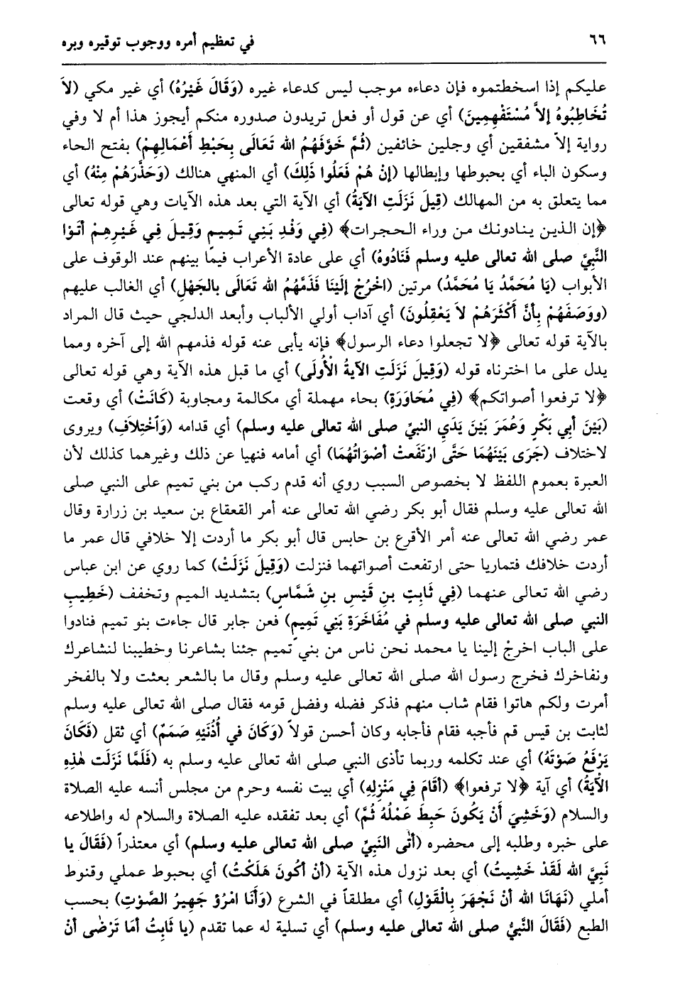 عليكم إذا اسخطتموه فإن دعاءه موجب ليس كدعاء غيره (وقال غيره) أي غير مكي (لا تخاطبوه إلّا مستفهمين) أي عن قول أو فعل تريدون صدوره منكم أيجوز هذا أم لا وفي رواية إلّا مشفقين أي وجلين خائفين (ثمّ خوّفهم الله تعالى بحبط أعمالهم) بفتح الحاء وسكون الباء أي بحبوطها وإبطالها (إن هم فعلوا ذلك) أي المنهي هنالك (وحذّرهم منه) أي مما يتعلق به من المهالك (قيل نزلت الآية) أي الآية التي بعد هذه الآيات وهي قوله تعالى إِنَّ الَّذِينَ يُنادُونَكَ مِنْ وَراءِ الْحُجُراتِ (فِي وَفْدِ بَنِي تَمِيمٍ وَقِيلَ فِي غَيْرِهِمْ أتوا النّبيّ صلى الله تعالى عليه وسلم فنادوه) أي على عادة الأعراب فيما بينهم عند الوقوف على الأبواب (يا محمّد يا محمّد) مرتين (اخرج إلينا فذمّهم الله تعالى بالجهل) أي الغالب عليهم (ووصفهم بأنّ أكثرهم لا يعقلون) أي آداب أولي الألباب وأبعد الدلجي حيث قال المراد بالآية قوله تعالى لا تَجْعَلُوا دُعاءَ الرَّسُولِ فإنه يأبي عنه قوله فذمهم الله إلى آخره ومما يدل على ما اخترناه قوله (وقيل نزلت الآية الأولى) أي ما قبل هذه الآية وهي قوله تعالى لا تَرْفَعُوا أَصْواتَكُمْ (في محاورة) بحاء مهملة أي مكالمة ومجاوبة (كانت) أي وقعت (بَيْنَ أَبِي بَكْرٍ وَعُمَرَ بَيْنَ يَدَيِ النَّبِيِّ صلى الله تعالى عليه وسلم) أي قدامه (واختلاف) ويروى لاختلاف (جرى بينهما حتّى ارتفعت أصواتهما) أي أمامه فنهيا عن ذلك وغيرهما كذلك لأن العبرة بعموم اللفظ لا بخصوص السبب روي أنه قدم ركب من بني تميم على النبي صلى الله تعالى عليه وسلم فقال أبو بكر رضي الله تعالى عنه أمر القعقاع بن سعيد بن زرارة وقال عمر رضي الله تعالى عنه أمر الأقرع بن حابس قال أبو بكر ما أردت إلا خلافي قال عمر ما أردت خلافك فتماريا حتى ارتفعت أصواتهما فنزلت (وقيل نزلت) كما روي عن ابن عباس رضي الله تعالى عنهما (في ثابت بن قيس بن شمّاس) بتشديد الميم وتخفف (خطيب النبي صلى الله تعالى عليه وسلم في مفاخرة بني تميم) فعن جابر قال جاءت بنو تميم فنادوا على الباب اخرج إلينا يا محمد نحن ناس من بني تميم جئنا بشاعرنا وخطيبنا لنشاعرك ونفاخرك فخرج رسول الله صلى الله تعالى عليه وسلم وقال ما بالشعر بعثت ولا بالفخر أمرت ولكم هاتوا فقام شاب منهم فذكر فضله وفضل قومه فقال صلى الله تعالى عليه وسلم لثابت بن قيس قم فأجبه فقام فأجابه وكان أحسن قولا (وكان في أذنيه صمم) أي ثقل (فكان يرفع صوته) أي عند تكلمه وربما تأذى النبي صلى الله تعالى عليه وسلم به (فلمّا نزلت هذه الآية) أي آية لا تَرْفَعُوا (أقام في منزله) أي بيت نفسه وحرم من مجلس أنسه عليه الصلاة والسلام (وخشي أن يكون حبط عمله ثمّ) أي بعد تفقده عليه الصلاة والسلام له واطلاعه على خبره وطلبه إلى محضره (أتى النبيّ صلى الله تعالى عليه وسلم) أي معتذرا (فقال يا نبيّ الله لقد خشيت) أي بعد نزول هذه الآية (أن أكون هلكت) أي بحبوط عملي وقنوط أملي (نهانا الله أن نجهر بالقول) أي مطلقا في الشرع (وأنا امرؤ جهير الصّوت) بحسب الطبع (فقال النّبيّ صلى الله تعالى عليه وسلم) أي تسلية له عما تقدم (يَا ثَابِتُ أَمَّا تَرْضَى أَنْ