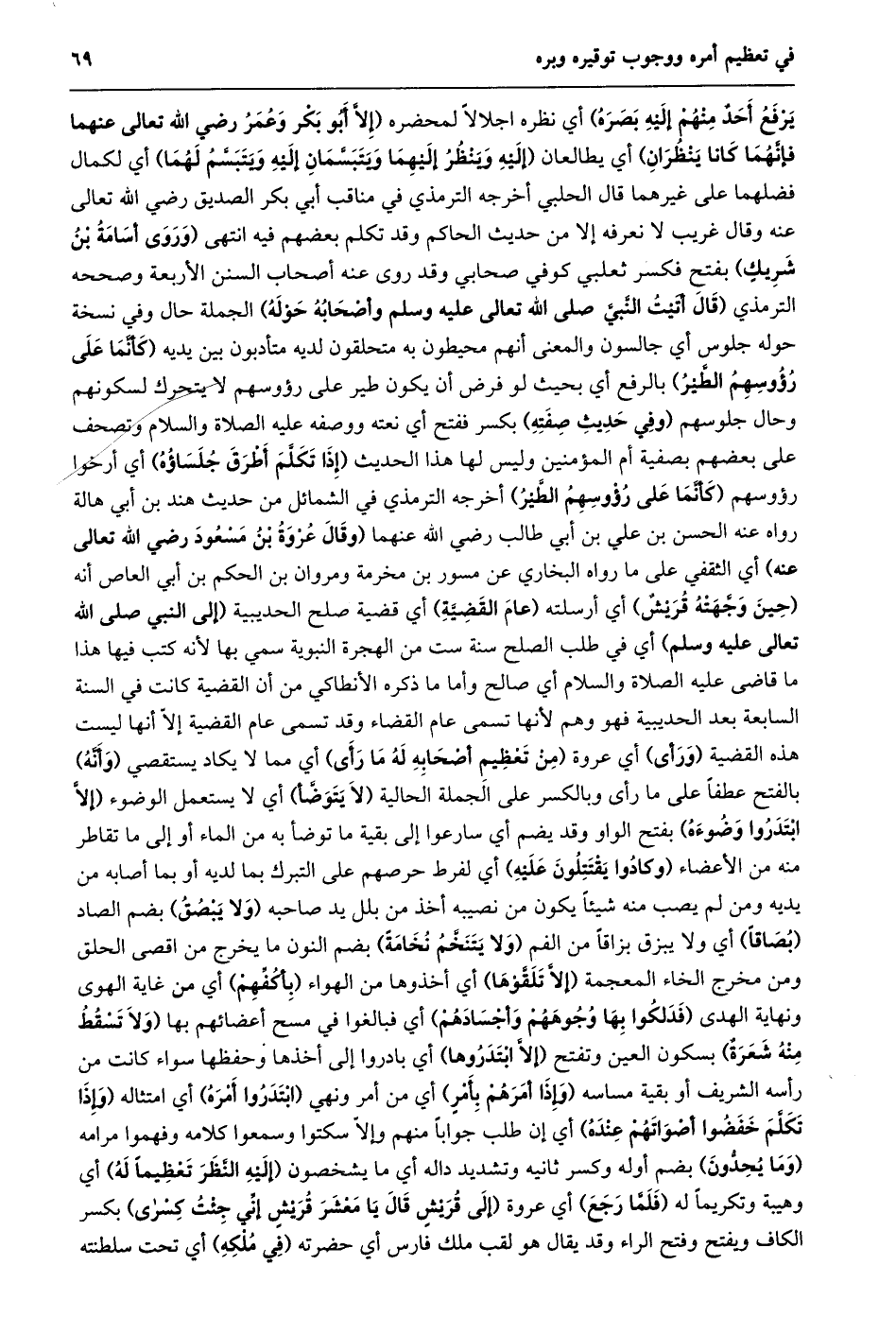 يرفع أحد منهم إليه بصره) أي نظره اجلالا لمحضره (إلّا أبو بكر وعمر رضي الله تعالى عنهما فإنّهما كانا ينظران) أي يطالعان (إِلَيْهِ وَيَنْظُرُ إِلَيْهِمَا وَيَتَبَسَّمَانِ إِلَيْهِ وَيَتَبَسَّمُ لَهُمَا) أي لكمال فضلهما على غيرهما قال الحلبي أخرجه الترمذي في مناقب أبي بكر الصديق رضي الله تعالى عنه وقال غريب لا نعرفه إلا من حديث الحاكم وقد تكلم بعضهم فيه انتهى (وروى أسامة بن شريك) بفتح فكسر ثعلبي كوفي صحابي وقد روى عنه أصحاب السنن الأربعة وصححه الترمذي (قال أتيت النّبيّ صلى الله تعالى عليه وسلم وأصحابه حوله) الجملة حال وفي نسخة حوله جلوس أي جالسون والمعنى أنهم محيطون به متحلقون لديه متأدبون بين يديه (كأنّما على رؤوسهم الطّير) بالرفع أي بحيث لو فرض أن يكون طير على رؤوسهم لا يتحرك لسكونهم وحال جلوسهم (وفي حديث صفته) بكسر ففتح أي نعته ووصفه عليه الصلاة والسلام وتصحف على بعضهم بصفية أم المؤمنين وليس لها هذا الحديث (إذا تكلّم أطرق جلساؤه) أي أرخوا رؤوسهم (كأنّما على رؤوسهم الطّير) أخرجه الترمذي في الشمائل من حديث هند بن أبي هالة رواه عنه الْحَسَنِ بْنِ عَلِيِّ بْنِ أَبِي طَالِبٍ رَضِيَ الله عنهما (وقال عروة بن مسعود رضي الله تعالى عنه) أي الثقفي على ما رواه البخاري عن مسور بن مخرمة ومروان بن الحكم بن أبي العاص أنه (حين وجّهته قريش) أي أرسلته (عام القضيّة) أي قضية صلح الحديبية (إلى النبي صلى الله تعالى عليه وسلم) أي في طلب الصلح سنة ست من الهجرة النبوية سمي بها لأنه كتب فيها هذا ما قاضى عليه الصلاة والسلام أي صالح وأما ما ذكره الأنطاكي من أن القضية كانت في السنة السابعة بعد الحديبية فهو وهم لأنها تسمى عام القضاء وقد تسمى عام القضية إلّا أنها ليست هذه القضية (ورأى) أي عروة (من تعظيم أصحابه له ما رأى) أي مما لا يكاد يستقصي (وأنّه) بالفتح عطفا على ما رأى وبالكسر على الجملة الحالية (لا يتوضّأ) أي لا يستعمل الوضوء (إلّا ابتدروا وضوءه) بفتح الواو وقد يضم أي سارعوا إلى بقية ما توضأ به من الماء أو إلى ما تقاطر منه من الأعضاء (وكادوا يقتتلون عليه) أي لفرط حرصهم على التبرك بما لديه أو بما أصابه من يديه ومن لم يصب منه شيئا يكون من نصيبه أخذ من بلل يد صاحبه (ولا يبصق) بضم الصاد (بصاقا) أي ولا يبزق بزاقا من الفم (ولا يتنخّم نخامة) بضم النون ما يخرج من اقصى الحلق ومن مخرج الخاء المعجمة (إلّا تلقّوها) أي أخذوها من الهواء (بأكفّهم) أي من غاية الهوى ونهاية الهدى (فدلكوا بها وجوههم وأجسادهم) أي فبالغوا في مسح أعضائهم بها (ولا تسقط منه شعرة) بسكون العين وتفتح (إلّا ابتدروها) أي بادروا إلى أخذها وحفظها سواء كانت من رأسه الشريف أو بقية مساسه (وإذا أمرهم بأمر) أي من أمر ونهي (ابتدروا أمره) أي امتثاله (وإذا تكلّم خفضوا أصواتهم عنده) أي إن طلب جوابا منهم وإلّا سكتوا وسمعوا كلامه وفهموا مرامه (وما يحدّون) بضم أوله وكسر ثانيه وتشديد داله أي ما يشخصون (إليه النّظر تعظيما له) أي وهيبة وتكريما له (فلمّا رجع) أي عروة (إِلَى قُرَيْشٍ قَالَ يَا مَعْشَرَ قُرَيْشٍ إِنِّي جئت كسرى) بكسر الكاف ويفتح وفتح الراء وقد يقال هو لقب ملك فارس أي حضرته (في ملكه) أي تحت سلطنته