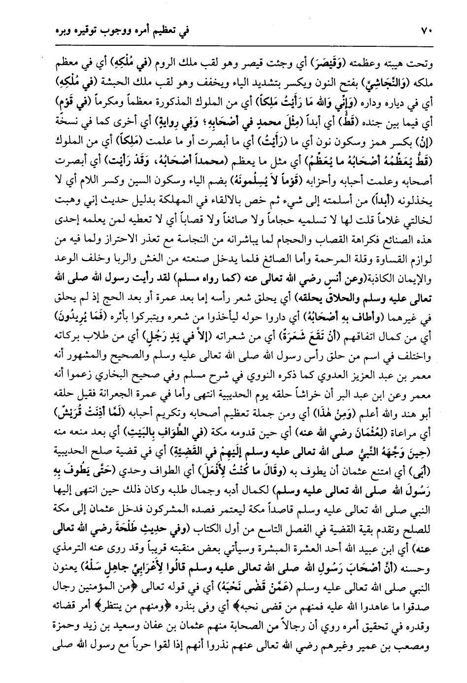 وتحت هيبته وعظمته (وقيصر) أي وجئت قيصر وهو لقب ملك الروم (في ملكه) أي في معظم ملكه (والنّجاشيّ) بفتح النون وبكسر بتشديد الياء ويخفف وهو لقب ملك الحبشة (في ملكه) أي في دياره وداره (وإنّي والله ما رأيت ملكا) أي من الملوك المذكورة معظما ومكرما (في قوم) أي فيما بين جنده (قطّ) أي أبدا (مثل محمد في أصحابه؛ وفي رواية) أي أخرى كما في نسخة (إن) بكسر همز وسكون نون أي ما (رأيت) أي ما أبصرت أو ما علمت (ملكا) أي من الملوك (قطّ يعظّمه أصحابه ما يعظّم) أي مثل ما يعظم (محمدا أصحابه، وقد رأيت) أي أبصرت أصحابه وعلمت أحبابه وأحزابه (قوما لا يسلمونه) بضم الياء وسكون السين وكسر اللام أي لا يخذلونه (أبدا) من أسلمته إلى شيء ثم خص بالالقاء في المهلكة بدليل حديث إني وهبت لخالتي غلاما قلت لها لا تسلميه حجاما ولا صائغا ولا قصابا أي لا تعطيه لمن يعلمه إحدى هذه الصنائع فكراهة القصاب والحجام لما يباشرانه من النجاسة مع تعذر الاحتراز ولما فيه من لوازم القساوة وقلة المرحمة وأما الصائغ فلما يدخل صنعته من الغش والربا وخلف الوعد والإيمان الكاذبة (وعن أنس رضي الله تعالى عنه (كما رواه مسلم) لقد رأيت رسول الله صلى الله تعالى عليه وسلم والحلاق يحلقه) أي يحلق شعر رأسه إما بعد عمرة أو بعد الحج إذ لم يحلق في غيرهما (وأطاف به أصحابه) أي داروا حوله ليأخذوا من شعره ويتبركوا بأثره (فما يريدون) أي من كمال اتفاقهم (أن تقع شعرة) أي من شعراته (إلّا في يد رجل) أي من طلاب بركاته واختلف في اسم من حلق رأس رسول الله صلى الله تعالى عليه وسلم والصحيح والمشهور أنه معمر بن عبد العزيز العدوي كما ذكره النووي في شرح مسلم وفي صحيح البخاري زعموا أنه معمر وعن ابن عبد البر أن خراشا حلقه يوم الحديبية انتهى وأما في عمرة الجعرانة فقيل حلقه أبو هند والله أعلم (ومن هذا) أي ومن جملة تعظيم أصحابه وتكريم أحبابه (لمّا أذنت قريش) أي مراعاة (لعثمان رضي الله عنه) أي حين قدومه مكة (في الطّواف بالبيت) أي بعد منعه منه (حين وجّهه النّبيّ صلى الله تعالى عليه وسلم إليهم في القضيّة) أي في قضية صلح الحديبية (أبى) أي امتنع عثمان أن يطوف به (وقال ما كنت لأفعل) أي الطواف وحدي (حَتَّى يَطُوفَ بِهِ رَسُولُ اللَّهِ صَلَّى اللَّهُ تعالى عليه وسلم) لكمال أدبه وجمال طلبه وكان ذلك حين انتهى إليها النبي صلى الله تعالى عليه وسلم قاصدا مكة ليعتمر فصده المشركون فدخل عثمان إلى مكة للصلح وتقدم بقية القضية في الفصل التاسع من أول الكتاب (وفي حديث طلحة رضي الله تعالى عنه) أي ابن عبيد الله أحد العشرة المبشرة وسيأتي بعض منقبته قريبا وقد روى عنه الترمذي وحسنه (أنّ أصحاب رسول الله صلى الله تعالى عليه وسلم قالوا لأعرابيّ جاهل سله) يعنون النبي صلى الله تعالى عليه وسلم (عمّن قضى نحبه) أي في قوله تعالى مِنَ الْمُؤْمِنِينَ رِجالٌ صَدَقُوا ما عاهَدُوا اللَّهَ عَلَيْهِ فَمِنْهُمْ مَنْ قَضى نَحْبَهُ أي وفى بنذره وَمِنْهُمْ مَنْ يَنْتَظِرُ أمر قضائه وقدره في تحقيق أمره روي أن رجالا من الصحابة منهم عثمان بن عفان وسعيد بن زيد وحمزة ومصعب بن عمير وغيرهم رضي الله تعالى عنهم نذروا أنهم إذا لقوا حربا مع رسول الله صلى