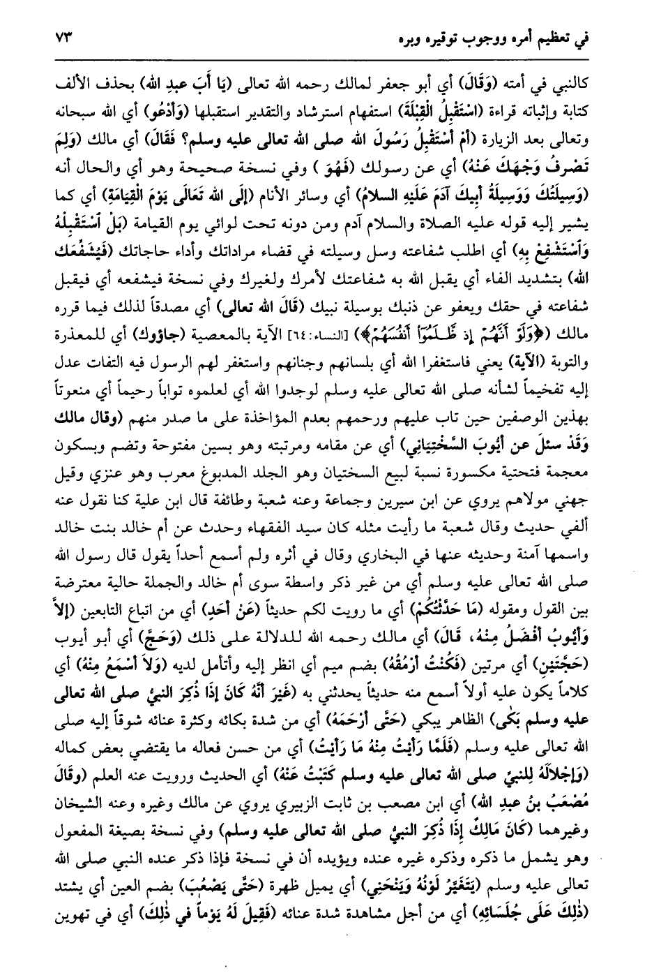 كالنبي في أمته (وقال) أي أبو جعفر لمالك رحمه الله تعالى (يا أب عبد الله) بحذف الألف كتابة وإثباته قراءة (استقبل القبلة) استفهام استرشاد والتقدير استقبلها (وأدعو) أي الله سبحانه وتعالى بعد الزيارة (أم أستقبل رسول الله صلى الله تعالى عليه وسلم؟ فقال) أي مالك (ولم تصرف وجهك عنه) أي عن رسولك (فهو) وفي نسخة صحيحة وهو أي والحال أنه (وسيلتك ووسيلة أبيك آدم عليه السلام) أي وسائر الأنام (إلى الله تعالى يوم القيامة) أي كما يشير إليه قوله عليه الصلاة والسلام آدم ومن دونه تحت لوائي يوم القيامة (بل استقبله واستشفع به) أي اطلب شفاعته وسل وسيلته في قضاء مراداتك وأداء حاجاتك (فيشفّعك الله) بتشديد الفاء أي يقبل الله به شفاعتك لأمرك ولغيرك وفي نسخة فيشفعه أي فيقبل شفاعته في حقك ويعفو عن ذنبك بوسيلة نبيك (قال الله تعالى) أي مصدقا لذلك فيما قرره مالك (وَلَوْ أَنَّهُمْ إِذْ ظَلَمُوا أَنْفُسَهُمْ) [النِّسَاءِ: 64] الْآيَةَ بالمعصية (جاؤوك) أي للمعذرة والتوبة (الآية) يعني فاستغفرا الله أي بلسانهم وجنانهم واستغفر لهم الرسول فيه التفات عدل إليه تفخيما لشأنه صلى الله تعالى عليه وسلم لوجدوا الله أي لعلموه توابا رحيما أي منعوتا بهذين الوصفين حين تاب عليهم ورحمهم بعدم المؤاخذة على ما صدر منهم (وَقَالَ مَالِكٌ وَقَدْ سُئِلَ عَنْ أَيُّوبَ السَّخْتِيَانِيِّ) أي عن مقامه ومرتبته وهو بسين مفتوحة وتضم وبسكون معجمة فتحتية مكسورة نسبة لبيع السختيان وهو الجلد المدبوغ معرب وهو عنزي وقيل جهني مولاهم يروي عن ابن سيرين وجماعة وعنه شعبة وطائفة قال ابن علية كنا نقول عنه ألفي حديث وقال شعبة ما رأيت مثله كان سيد الفقهاء وحدث عن أم خالد بنت خالد واسمها آمنة وحديثه عنها في البخاري وقال في أثره ولم أسمع أحدا يقول قال رسول الله صلى الله تعالى عليه وسلم أي من غير ذكر واسطة سوى أم خالد والجملة حالية معترضة بين القول ومقوله (ما حدّثتكم) أي ما رويت لكم حديثا (عن أحد) أي من اتباع التابعين (إلّا وأيوب أفضل منه، قال) أي مالك رحمه الله للدلالة على ذلك (وحجّ) أي أبو أيوب (حجّتين) أي مرتين (فكنت أرمقه) بضم ميم أي انظر إليه وأتأمل لديه (ولا أسمع منه) أي كلاما يكون عليه أولا أسمع منه حديثا يحدثني به (غَيْرَ أَنَّهُ كَانَ إِذَا ذُكِرَ النَّبِيُّ صَلَّى الله تعالى عليه وسلم بكى) الظاهر يبكي (حتّى أرحمه) أي من شدة بكائه وكثرة عنائه شوقا إليه صلى الله تعالى عليه وسلم (فلمّا رأيت منه ما رأيت) أي من حسن فعاله ما يقتضي بعض كماله (وإجلاله للنبيّ صلى الله تعالى عليه وسلم كتبت عنه) أي الحديث ورويت عنه العلم (وقال مصعب بن عبد الله) أي ابن مصعب بن ثابت الزبيري يروي عن مالك وغيره وعنه الشيخان وغيرهما (كَانَ مَالِكٌ إِذَا ذُكِرَ النَّبِيُّ صَلَّى اللَّهُ تعالى عليه وسلم) وفي نسخة بصيغة المفعول وهو يشمل ما ذكره وذكره غيره عنده ويؤيده أن في نسخة فإذا ذكر عنده النبي صلى الله تعالى عليه وسلم (يتغيّر لونه وينحني) أي يميل ظهرة (حتّى يصعب) بضم العين أي يشتد (ذلك على جلسائه) أي من أجل مشاهدة شدة عنائه (فقيل له يوما في ذلك) أي في تهوين