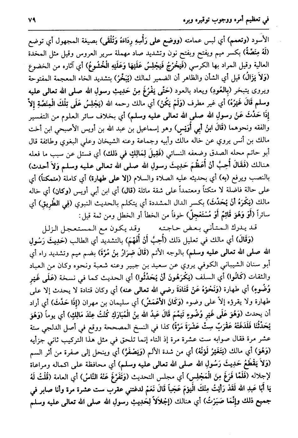 (وقال) أي مالك في تعليل ذلك (أحبّ أن أفهّم) بالتشديد أي الطالب (حديث رسول الله صلى الله تعالى عليه وسلم) بالوجه الأتم (قال ضرار بن مرّة) بضم ميم وتشديد راء أي أبو سنان الشيباني الكوفي يروي عن سعيد بن جبير وعنه شعبة ونحوه وكان من العباد والثقات (كانوا) أي السلف (يكرهون أن يحدّثوا) أي الحديث كما في نسخة (على غير وضوء) أي طهارة (ونحوه عن قتادة رضي الله تعالى عنه) أي وكان قتادة لا يحدث إلا على طهارة ولا يقرؤه إلّا على وضوء (وكان الأعمش) أي سليمان بن مهران (إذا حدّث) أي أَرَادَ أَنْ يُحَدِّثَ (وَهُوَ عَلَى غَيْرِ وُضُوءٍ تَيَمَّمَ قَالَ عَبْدُ اللَّهِ بْنُ الْمُبَارَكِ كُنْتُ عند مالك) أي يوما (وَهُوَ يُحَدِّثُنَا فَلَدَغَتْهُ عَقْرَبٌ سِتَّ عَشْرَةَ مَرَّةً) كذا في النسخ المصححة ووقع في أصل الدلجي ستة عشر مرة فقال صوابه ست عشرة مرة إذ التاء إنما تلحق في مثل هذا التركيب ثاني جزأيه (وهو) أي مالك (يتغيّر لونه) أي من شدة الألم (ويصفرّ) أي وينحل إلى صفرة من أثر السم (وَلَا يَقْطَعُ حَدِيثَ رَسُولِ اللَّهِ صَلَّى اللَّهُ تعالى عليه وسلم) أي محافظة على اكماله ومراعاة لإجلاله (فلمّا فرغ من المجلس) أي مجلس التحديث (وتفرّغ عنه النّاس) أي العامة (قُلْتُ لَهُ يَا أَبَا عَبْدِ اللَّهِ لَقَدْ رأيت منك اليوم عَجَبًا قَالَ نَعَمْ لَدَغَتْنِي عَقْرَبٌ سِتَّ عَشْرَةَ مَرَّةً وَأَنَا صَابِرٌ فِي جَمِيعِ ذَلِكَ وَإِنَّمَا صبرت) أي هنالك (إجلالا لحديث رسول الله صلى الله تعالى عليه وسلم