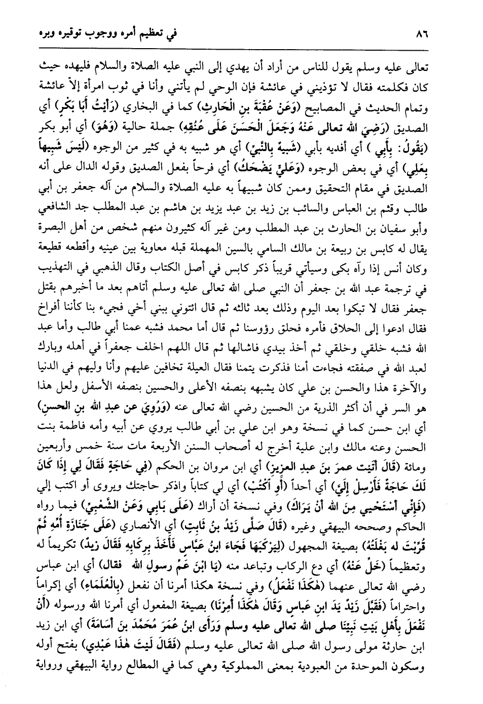 تعالى عليه وسلم يقول للناس من أراد أن يهدي إلى النبي عليه الصلاة والسلام فليهده حيث كان فكلمته فقال لا تؤذيني في عائشة فإن الوحي لم يأتني وأنا في ثوب امرأة إلّا عائشة وتمام الحديث في المصابيح (وعن عقبة بن الحارث) كما في البخاري (رأيت أبا بكر) أي الصديق (رضي الله تعالى عنه وجعل الحسن على عنقه) جملة حالية (وهو) أي أبو بكر (يقول: بأبي) أي أفديه بأبي (شبيه بالنّبيّ) أي هو شبيه به في كثير من الوجوه (ليس شبيها بعلي) أي في بعض الوجوه (وعليّ يضحك) أي فرحا بفعل الصديق وقوله الدال على أنه الصديق في مقام التحقيق وممن كان شبيها به عليه الصلاة والسلام من آله جعفر بن أبي طالب وقثم بن العباس والسائب بن زيد بن عبد يزيد بن هاشم بن عبد المطلب جد الشافعي وأبو سفيان بن الحارث بن عبد المطلب ومن غير آله كثيرون منهم شخص من أهل البصرة يقال له كابس بن ربيعة بن مالك السامي بالسين المهملة قبله معاوية بين عينيه وأقطعه قطيعة وكان أنس إذا رآه بكى وسيأتي قريبا ذكر كابس في أصل الكتاب وقال الذهبي في التهذيب في ترجمة عبد الله بن جعفر أن النبي صلى الله تعالى عليه وسلم أتاهم بعد ما أخبرهم بقتل جعفر فقال لا تبكوا بعد اليوم وذلك بعد ثالثه ثم قال ائتوني ببني أخي فجيء بنا كأننا أفراخ فقال ادعوا إلى الحلاق فأمره فحلق رؤوسنا ثم قال أما محمد فشبه عمنا أبي طالب وأما عبد الله فشبه خلقي وخلقي ثم أخذ بيدي فاشالها ثم قال اللهم اخلف جعفرا في أهله وبارك لعبد الله في صفقته فجاءت أمنا فذكرت يتمنا فقال العلية تخافين عليهم وأنا وليهم في الدنيا والآخرة هذا والحسن بن علي كان يشبهه بنصفه الأعلى والحسين بنصفه الأسفل ولعل هذا هو السر في أن أكثر الذرية من الحسين رضي الله تعالى عنه (وروي عن عبد الله بن الحسن) أي ابن حسن كما في نسخة وهو ابن علي بن أبي طالب يروي عن أبيه وأمه فاطمة بنت الحسن وعنه مالك وابن علية أخرج له أصحاب السنن الأربعة مات سنة خمس وأربعين ومائة (قال أتيت عمر بن عبد العزيز) أي ابن مروان بن الحكم (في حاجة فقال لي إذا كان لك حاجة فأرسل إليّ) أي أحدا (أو اكتب) أي لي كتابا واذكر حاجتك ويروى أو اكتب إلي (فإنّي أستحيي من الله أن يراك) وفي نسخة أن أراك (على بابي وعن الشّعبيّ) فيما رواه الحاكم وصححه البيهقي وغيره (قال صلّى زيد بن ثابت) أي الأنصاري (عَلَى جِنَازَةِ أُمِّهِ ثُمَّ قُرِّبَتْ لَهُ بَغْلَتُهُ) بصيغة المجهول (لِيَرْكَبَهَا فَجَاءَ ابْنُ عَبَّاسٍ فَأَخَذَ بِرِكَابِهِ فَقَالَ زيد) تكريما له وتعظيما (خلّ عنه) أي دع الركاب وتباعد منه (يا ابن عمّ رسول الله فقال) أي ابن عباس رضي الله تعالى عنهما (هكذا نفعل) وفي نسخة هكذا أمرنا أن نفعل (بالعلماء) أي إكراما واحتراما (فَقَبَّلَ زَيْدٌ يَدَ ابْنِ عَبَّاسٍ وَقَالَ هَكَذَا أمرنا) بصيغة المفعول أي أمرنا الله ورسوله (أن نفعل بأهل بيت نبيّنا صلى الله تعالى عليه وسلم ورأى ابن عمر محمّد بن أسامة) أي ابن زيد ابن حارثة مولى رسول الله صلى الله تعالى عليه وسلم (فقال ليت هذا عبدي) بفتح أوله وسكون الموحدة من العبودية بمعنى المملوكية وهي كما في المطالع رواية البيهقي ورواية