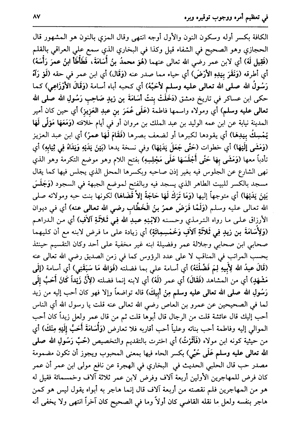 الكافة بكسر أوله وسكون النون والأول أوجه انتهى وقال المزي بالنون هو المشهور قال الحجازي وهو الصحيح في الشفاء قيل وكذا في البخاري الذي سمع علي العراقي بالقلم (فقيل له) أي لابن عمر رضي الله تعالى عنهما (هُوَ مُحَمَّدُ بْنُ أُسَامَةَ، فَطَأْطَأَ ابْنُ عُمَرَ رأسه) أي أطرقه (ونقر بيده الأرض) أي حياء مما صدر عنه (وقال) أي ابن عمر في حقه (لو رآه رسول الله صلى الله تعالى عليه وسلم لأحبّه) أي كحبه أباه أسامة (وقال الأوزاعي) كما حكى ابن عساكر في تاريخ دمشق (دَخَلَتْ بِنْتُ أُسَامَةَ بْنِ زَيْدٍ صَاحِبِ رَسُولِ الله صلى الله تعالى عليه وسلم) أي ومولاه واسمها فاطمة (على عمر بن عبد العزيز) أي حين كان أمير المدينة نيابة عن ابن عمه الوليد بن عبد الملك بن مروان أو في أيام خلافته (ومعها مولى لها يمسك بيدها) أي يقودها لكبرها أو لضعف بصرها (فقام لها عمر) أي ابن عبد العزيز (ومشى إليها) أي خطوات (حتّى جعل يديها) وفي نسخة يدها (بين يديه ويداه في ثيابه) أي تأدبا معها (ومشى بها حتّى أجلسها على مجلسه) بفتح اللام وهو موضع التكرمة وهو الذي نهى الشارع عن الجلوس فيه بغير إذن صاحبه وبكسرها المحل الذي يجلس فيها كما يقال مسجد بالكسر للبيت الطاهر الذي يسجد فيه وبالفتح لموضع الجبهة في السجود (وجلس بين يديها) أي متوجها إليها (وما ترك لها حاجة إلّا قضاها) لكونها بنت حبه ومولاته صلى الله تعالى عليه وسلم (ولمّا فرض عمر بن الخطّاب رضي الله تعالى عنه) أي في ديوان الأرزاق على ما رواه الترمذي وحسنه (لابنه عبد الله في ثلاثة آلاف) أي من الدراهم (وَلِأُسَامَةَ بْنِ زَيْدٍ فِي ثَلَاثَةِ آلَافٍ وَخَمْسِمِائَةٍ) أي زيادة على ما فرض لابنه مع أن كليهما صحابي ابن صحابي وجلالة عمر وفضيلة ابنه غير مخفية على أحد وكان التقسيم حينئذ بحسب المراتب في المناقب لا على عدد الرؤوس كما في زمن الصديق رضي الله تعالى عنه (قال عبد الله لأبيه لم فضّلته) أي أسامة علي بما فضلته (فو الله ما سبقني) أي أسامة (إلى مشهد) أي من المشاهد (فقال) أي عمر (له) أي لابنه إنما فضلته (لِأَنَّ زَيْدًا كَانَ أَحَبَّ إِلَى رَسُولِ اللَّهِ صلى الله تعالى عليه وسلم من أبيك) قاله تواضعا وإلا فهو كان أحب إليه من زيد لما في الصحيحين عن عمرو بن العاص رضي الله تعالى عنه قلت يا رسول الله أي الناس أحب إليك قال عائشة قلت من الرجال قال أبوها قلت ثم من قال عمر ولعل زيدا كان أحب الموالي إليه وفاطمة أحب بناته وعليا أحب أقاربه فلا تعارض (وأسامة أحبّ إليه منك) أي من حيثية كونه ابن مولاه (فآثرت) أي اخترت بالتقديم والتخصيص (حبّ رسول الله صلى الله تعالى عليه وسلم على حبّي) بكسر الحاء فيها بمعنى المحبوب ويجوز أن تكون مضمومة مصدر حب قال الحلبي الحديث في البخاري في الهجرة عن نافع مولى ابن عمر أن عمر كان فرض للمهاجرين الأولين أربعة آلاف وفرض لابن عمر ثلاثة آلاف وخمسمائة فقيل له هو من المهاجرين فلم نقصته من أربعة آلاف قال إنما هاجر به أبواه يقول ليس هو كمن هاجر بنفسه ولعل ما نقله القاضي كان أولا وما في الصحيح كان آخرا انتهى ولا يخفى أنه