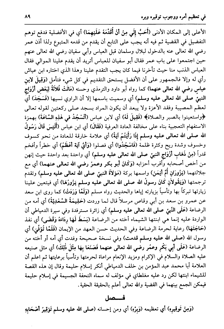 الأعلى إلى المكان الأدنى (أحبّ إلي من أن أقدّمه عليهما) أي في الأفضلية فدفع توهم التفضيل في القضية ثم فيه أنه يجب على التابع أن يقدم من قدمه المتبوع ولذا أذن عمر رضي الله تعالى عنه بالدخول لبلال وسلمان قبل العباس وأبي سفيان رضي الله تعالى عنهم حين اجتمعوا على باب عمر فقال أبو سفيان للعباس أتريد أن يقدم علينا الموالي فقال العباس الذنب منا حيث تأخرنا فيما كان يجب التقدم علينا وهذا الذي اختاره ابن عياش رأي له وإلا فالجمهور على أن الأفضل يستحق التقديم في كل شيء فتأمل (وقيل لابن عباس رضي الله تعالى عنهما) كما رواه أبو داود والترمذي وحسنه (مَاتَتْ فُلَانَةُ لِبَعْضِ أَزْوَاجِ النَّبِيِّ صَلَّى اللَّهُ تعالى عليه وسلم) أي وسميت باسمها إلا أن الراوي نسيها (فسجد) أي لعظم المصيبة وفقد الأعزة ولا يبعد أن يكون المراد بسجد صلى ركعتين لقوله تعالى وَاسْتَعِينُوا بِالصَّبْرِ وَالصَّلاةِ (فقيل له) أي لابن عباس (أتسجد في هذه السّاعة) بهمزة الاستفهام التعجبية بناء على مخالفة العادة العرفية (فقال) أي ابن عباس (أليس قال رسول الله صلى الله تعالى عليه وسلم إذا رأيتم آية) أي علامة خارقة للعادة من نحو كسوف وخسوف وشدة ريح وكثرة ظلمة (فاسجدوا) أي فصلوا (وأيّ آية أعظم) أي خطرا وأفخم قدرا (من ذهاب أزواج النبيّ صلى الله تعالى عليه وسلم) أي واحدة بعد واحدة حيث إنهن من أخص أصحابه وأقرب أحزابه (وكان أبو بكر وعمر رضي الله تعالى عنهما) أي مع جلالتهما (يزوران أمّ أيمن) واسمها بركة (مولاة النبيّ صلى الله تعالى عليه وسلم) وتقدم ترجمتها (ويقولان كان رسول الله صلى الله تعالى عليه وسلم يزورها) أي فيتعين علينا زيارتها تبركا بها وتأسيا بزيارته إياها والحديث رواه مسلم (ولمّا وردت) كما روى ابن سعد عن عمرو بن سعد بن أبي وقاص مرسلا قال لما وردت (حليمة السّعديّة) أي أمه من الرضاعة (على النّبيّ صلى الله تعالى عليه وسلم) أي زائرة مسترفدة وفي سيرة الدمياطي أن الواردة عليه إنما هي ابنتها الشيماء أخته من الرضاعة (بسط لها رداءه وقضى) أي نفذ (حاجتها) رعاية لحرمة الرضاعة وفي الحديث حسن العهد من الإيمان (فلمّا توفّي) أي رسول الله (صلى الله تعالى عليه وسلم قدمت) وفي نسخة صحيحة وفدت أي أمه أو أخته من الرضاعة (على أبي بكر وعمر رضي الله تعالى عنهما فصنعا بها مثل ذلك) أي مثل صنيعه عليه الصلاة والسلام في الإكرام ومزيد الإنعام مراعاة لحرمتها وتأسيا برعايتها ثم اعلم أن العلامة أبا محمد عبد المؤمن بن خلف الدمياطي أنكر إسلام حليمة وقال إن هذه القصة للشيماء ابنتها لكن رد عليه مغلطاي في مؤلف له سماه التحفة الجسمية في إسلام حليمة فيمكن الجمع بينهما في القضية والله تعالى أعلم بالحقيقة الحقية.