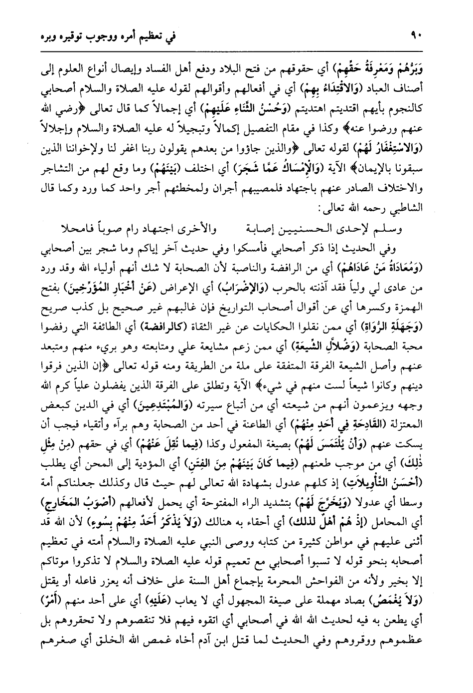 وبرّهم ومعرفة حقّهم) أي حقوقهم من فتح البلاد ودفع أهل الفساد وإيصال أنواع العلوم إلى أصناف العباد (والاقتداء بهم) أي في أفعالهم وأقوالهم لقوله عليه الصلاة والسلام أصحابي كالنجوم بأيهم اقتديتم اهتديتم (وحسن الثّناء عليهم) أي إجمالا كما قال تعالى رَضِيَ اللَّهُ عَنْهُمْ وَرَضُوا عَنْهُ وكذا في مقام التفصيل إكمالا وتبجيلا له عليه الصلاة والسلام وإجلالا (والاستغفار لهم) لقوله تعالى وَالَّذِينَ جاؤُ مِنْ بَعْدِهِمْ يَقُولُونَ رَبَّنَا اغْفِرْ لَنا وَلِإِخْوانِنَا الَّذِينَ سَبَقُونا بِالْإِيمانِ الآية (والإمساك عمّا شجر) أي اختلف (بينهم) وما وقع لهم من التشاجر والاختلاف الصادر عنهم باجتهاد فلمصيبهم أجران ولمخطئهم أجر واحد كما ورد وكما قال الشاطبي رحمه الله تعالى: