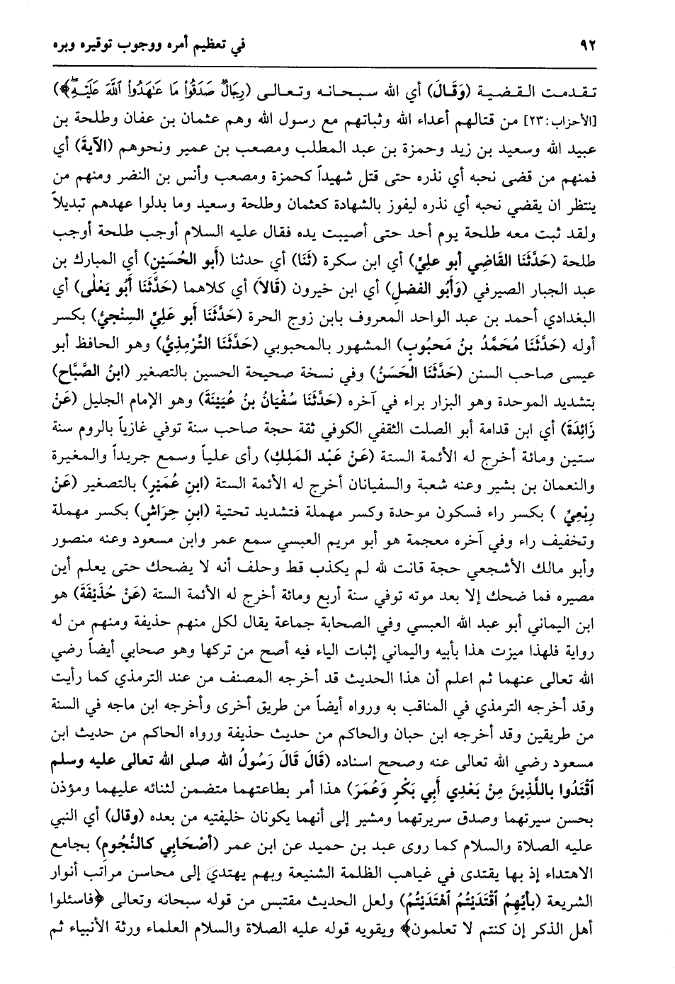 تقدمت القضية (وقال) أي الله سبحانه وتعالى (رِجالٌ صَدَقُوا مَا عاهَدُوا اللَّهَ عَلَيْهِ) [الْأَحْزَابِ: 23] من قتالهم أعداء الله وثباتهم مع رسول الله وهم عثمان بن عفان وطلحة بن عبيد الله وسعيد بن زيد وحمزة بن عبد المطلب ومصعب بن عمير ونحوهم (الآية) أي فمنهم من قضى نحبه أي نذره حتى قتل شهيدا كحمزة ومصعب وأنس بن النضر ومنهم من ينتظر ان يقضي نحبه أي نذره ليفوز بالشهادة كعثمان وطلحة وسعيد وما بدلوا عهدهم تبديلا ولقد ثبت معه طلحة يوم أحد حتى أصيبت يده فقال عليه السلام أوجب طلحة أوجب طلحة (حدّثنا القاضي أبو عليّ) أي ابن سكرة (ثنا) أي حدثنا (أبو الحسين) أي المبارك بن عبد الجبار الصيرفي (وأبو الفضل) أي ابن خيرون (قالا) أي كلاهما (حدّثنا أبو يعلى) أي البغدادي أحمد بن عبد الواحد المعروف بابن زوج الحرة (حدّثنا أبو عليّ السنجيّ) بكسر أوله (حدّثنا محمّد بن محبوب) المشهور بالمحبوبي (حدّثنا التّرمذيّ) وهو الحافظ أبو عيسى صاحب السنن (حدّثنا الحسن) وفي نسخة صحيحة الحسين بالتصغير (ابن الصّبّاح) بتشديد الموحدة وهو البزار براء في آخره (حدّثنا سفيان بن عيينة) وهو الإمام الجليل (عن زائدة) أي ابن قدامة أبو الصلت الثقفي الكوفي ثقة حجة صاحب سنة توفي غازيا بالروم سنة ستين ومائة أخرج له الأئمة الستة (عن عبد الملك) رأى عليا وسمع جريدا والمغيرة والنعمان بن بشير وعنه شعبة والسفيانان أخرج له الأئمة الستة (ابن عمير) بالتصغير (عن ربعيّ) بكسر راء فسكون موحدة وكسر مهملة فتشديد تحتية (ابن حراش) بكسر مهملة وتخفيف راء وفي آخره معجمة هو أبو مريم العبسي سمع عمر وابن مسعود وعنه منصور وأبو مالك الأشجعي حجة قانت لله لم يكذب قط وحلف أنه لا يضحك حتى يعلم أين مصيره فما ضحك إلا بعد موته توفي سنة أربع ومائة أخرج له الأئمة الستة (عن حذيفة) هو ابن اليماني أبو عبد الله العبسي وفي الصحابة جماعة يقال لكل منهم حذيفة ومنهم من له رواية فلهذا ميزت هذا بأبيه واليماني إثبات الياء فيه أصح من تركها وهو صحابي أيضا رضي الله تعالى عنهما ثم اعلم أن هذا الحديث قد أخرجه المصنف من عند الترمذي كما رأيت وقد أخرجه الترمذي في المناقب به ورواه أيضا من طريق أخرى وأخرجه ابن ماجه في السنة من طريقين وقد أخرجه ابن حبان والحاكم من حديث حذيفة ورواه الحاكم من حديث ابن مسعود رضي الله تعالى عنه وصحح اسناده (قال قال رسول الله صلى الله تعالى عَلَيْهِ وَسَلَّمَ اقْتَدُوا بِاللَّذَيْنِ مِنْ بَعْدِي أَبِي بكر وعمر) هذا أمر بطاعتهما متضمن لثنائه عليهما ومؤذن بحسن سيرتهما وصدق سريرتهما ومشير إلى أنهما يكونان خليفتيه من بعده (وقال) أي النبي عليه الصلاة والسلام كما روى عبد بن حميد عن ابن عمر (أصحابي كالنّجوم) بجامع الاهتداء إذ بها يقتدى في غياهب الظلمة الشنيعة وبهم يهتدي إلى محاسن مراتب أنوار الشريعة (بأيّهم اقتديتم اهتديتم) ولعل الحديث مقتبس من قوله سبحانه وتعالى فَسْئَلُوا أَهْلَ الذِّكْرِ إِنْ كُنْتُمْ لا تَعْلَمُونَ ويقويه قوله عليه الصلاة والسلام العلماء ورثة الأنبياء ثم