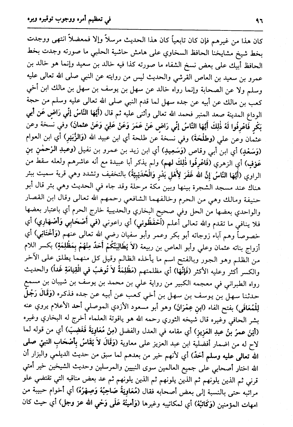 كان هذا من غيرهم فإن كان تابعيا كان هذا الحديث مرسلا وإلا فمعضلا انتهى ووجدت بخط شيخ مشايخنا الحافظ السخاوي على هامش حاشية الحلبي ما صورته وجدت بخط الحافظ أبيك على بعض نسخ الشفاء ما صورته كذا فيه خالد بن سعيد وإنما هو خالد بن عمرو بن سعيد بن العاص القرشي والحديث ليس من روايته عن النبي صلى الله تعالى عليه وسلم ولا عن الصحابة وإنما رواه خالد عن سهل بن يوسف بن سهل بن مالك ابن أخي كعب بن مالك عن أبيه عن جده سهل لما قدم النبي صلى الله تعالى عليه وسلم من حجة الوداع المدينة صعد المنبر فحمد الله تعالى وأثنى عليه ثم قَالَ (أَيُّهَا النَّاسُ إِنِّي رَاضٍ عَنْ أَبِي بَكْرٍ فَاعْرِفُوا لَهُ ذَلِكَ أَيُّهَا النَّاسُ إِنِّي رَاضٍ عَنْ عُمَرَ وَعَنْ عَلِيٍّ وَعَنْ عُثْمَانَ) وفي نسخة وعن عثمان وعن علي (وطلحة) وفي نسخة عن طلحة أي ابن عبيد الله (والزّبير) أي ابن العوام (وسعد) أي ابن أبي وقاص (وسعيد) أي ابن زيد بن عمرو بن نفيل (وعبد الرحمن بن عوف) أي الزهري (فاعرفوا ذلك لهم) ولم يذكر أبا عبيدة مع أنه عاشرهم ولعله سقط من الراوي (أَيُّهَا النَّاسُ إِنَّ اللَّهَ غَفَرَ لِأَهْلِ بَدْرٍ والحديبيّة) بالتخفيف وتشدد وهي قرية سميت ببئر هناك عند مسجد الشجرة بينها وبين مكة مرحلة وقد جاء في الحديث وهي بئر قال أبو حنيفة ومالك وهي من الحرم وخالفهما الشافعي رحمهم الله تعالى وقال ابن القصار والواحدي بعضها من الحل وفي صحيح البخاري والحديبية خارج الحرم أي باعتبار بعضها فلا ينافي ما تقدم والله تعالى أعلم (احفظوني) أي راعوني (في أصحابي وأصهاري) أي خصوصا وهم آباء زوجاته أبو بكر وعمر وأبو سفيان رضي الله تعالى عنهم (وأختاني) أي أزواج بناته عثمان وعلي وأبو العاص بن ربيعة (لا يطالبنّكم أحد منهم بمظلمة) بكسر اللام من الظلم وهو الجور وبالفتح اسم ما يأخذه الظالم وقيل كل منهما يطلق على الآخر والكسر أكثر وعليه الأكثر (فإنّها) أي مظلمتهم (مظلمة لا توهب في القيامة غدا) والحديث رواه الطبراني في معجمه الكبير من رواية علي بن محمد بن يوسف بن شيبان بن مسمع حدثنا سهل بن يوسف بن سهل بن أخي كعب عن أبيه عن جده فذكره (وقال رجل للمعافى) بفتح الفاء (ابن عمران) وهو أبو مسعود الأزدي الموصلي أحد الأعلام يروي عنه بشر الحافي وغيره قال شيخه الثوري رحمه الله هو ياقوتة العلماء أخرج له البخاري وغيره (أين عمر بن عبد العزيز) أي مقامه في العدل والفضل (من معاوية فغضب) أي من قوله لما لاح له من اضمار أفضلية ابن عبد العزيز على معاوية (وَقَالَ لَا يُقَاسُ بِأَصْحَابِ النَّبِيِّ صَلَّى اللَّهُ تعالى عليه وسلم أحد) أي لأنهم خير من بعدهم لما سبق من حديث الديلمي والبزار إِنَّ اللَّهَ اخْتَارَ أَصْحَابِي عَلَى جَمِيعِ الْعَالَمِينَ سوى النبيين والمرسلين وحديث الشيخين خير أمتي قَرْنِي ثُمَّ الَّذِينَ يَلُونَهُمْ ثُمَّ الَّذِينَ يَلُونَهُمْ ثم الذين يلونهم ثم عد بعض مناقبه التي تقتضي علو مراتبه حتى بالنسبة إلى بعض أصحابه فقال (معاوية صاحبه وصهره) أي أخوام حبيبة من امهات المؤمنين (وكاتبه) أي لمكاتيبه وغيرها (وأمينه على وحي الله عز وجل) أي حيث كان