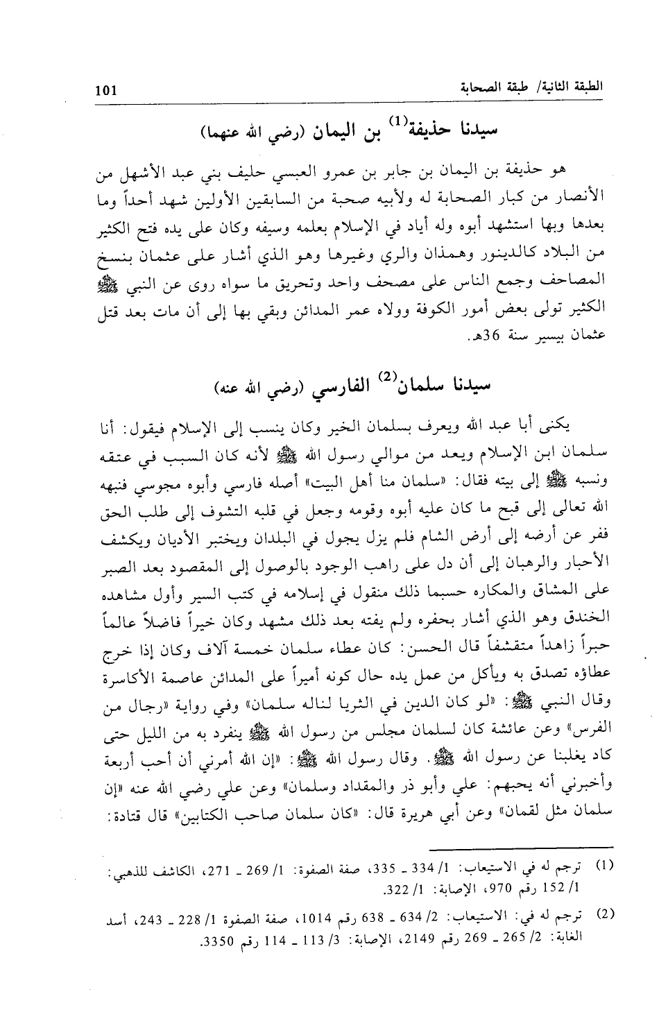 يكنى أبا عبد الله ويعرف بسلمان الخير وكان ينسب إلى الإِسلام فيقول: أنا سلمان ابن الإِسلام ويعد من موالي رسول الله - صلى الله عليه وسلم - لأنه كان السبب في عتقه ونسبه - صلى الله عليه وسلم - إلى بيته فقال: "سلمان منا أهل البيت" أصله فارسي وأبوه مجوسي فنبهه الله تعالى إلى قبح ما كان عليه أبوه وقومه وجعل في قلبه التشوف إلى طلب الحق ففر عن أرضه إلى أرض الشام فلم يزل يجول في البلدان ويختبر الأديان ويكشف الأحبار والرهبان إلى أن دل على راهب الوجود بالوصول إلى المقصود بعد الصبر على المشاق والمكاره حسبما ذلك منقول في إسلامه في كتب السير وأول مشاهده الخندق وهو الذي أشار بحفره ولم يفته بعد ذلك مشهد وكان خيراً فاضلاً عالماً حبراً زاهداً متقشفاً قال الحسن: كان عطاء سلمان خمسة آلاف وكان إذا خرج عطاؤه تصدق به ويأكل من عمل يده حال كونه أميراً على المدائن عاصمة الأكاسرة وقال النبي - صلى الله عليه وسلم -: "لو كان الدين في الثريا لناله سلمان" وفي رواية "رجال من الفرس" وعن عائشة كان لسلمان مجلس من رسول الله - صلى الله عليه وسلم - ينفرد به من الليل حتى كاد يغلبنا عن رسول الله - صلى الله عليه وسلم -. وقال رسول الله - صلى الله عليه وسلم -: "إن الله أمرني أن أحب أربعة وأخبرني أنه يحبهم: علي وأبو ذر والمقداد وسلمان" وعن علي رضي الله عنه "إن سلمان مثل لقمان" وعن أبي هريرة قال: "كان سلمان صاحب الكتابين" قال قتادة: