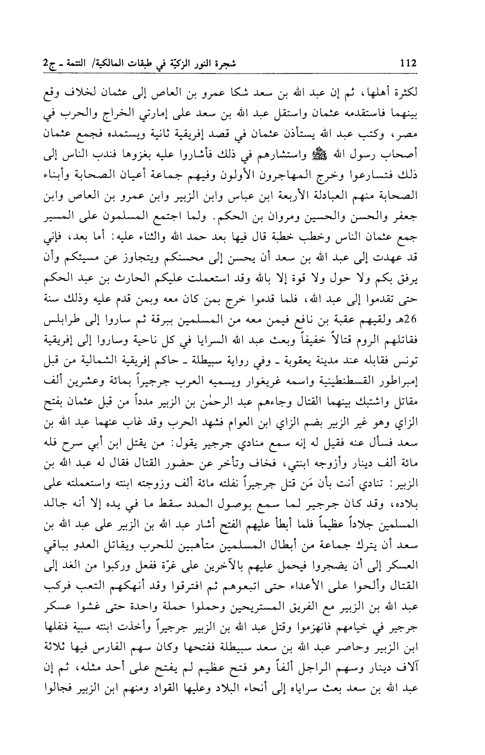 لكثرة أهلها، ثم إن عبد الله بن سعد شكا عمرو بن العاص إلى عثمان لخلاف وقع بينهما فاستقدمه عثمان واستقل عبد الله بن سعد على إمارتي الخراج والحرب في مصر، وكتب عبد الله يستأذن عثمان في قصد إفريقية ثانية ويستمده فجمع عثمان أصحاب رسول الله - صلى الله عليه وسلم - واستشارهم في ذلك فأشاروا عليه بغزوها فندب الناس إلى ذلك فتسارعوا وخرج المهاجرون الأولون وفيهم جماعة أعيان الصحابة وأبناء الصحابة منهم العبادلة الأربعة ابن عباس وابن الزبير وابن عمرو بن العاص وابن جعفر والحسن والحسين ومروان بن الحكم. ولما اجتمع المسلمون على المسير جمع عثمان الناس وخطب خطبة قال فيها بعد حمد الله والثناء عليه: أما بعد، فإني قد عهدت إلى عبد الله بن سعد أن يحسن إلى محسنكم ويتجاوز عن مسيئكم وأن يرفق بكم ولا حول ولا قوة إلا بالله وقد استعملت عليكم الحارث بن عبد الحكم حتى تقدموا إلى عبد الله، فلما قدموا خرج بمن كان معه وبمن قدم عليه وذلك سنة 26 هـ ولقيهم عقبة بن نافع فيمن معه من المسلمين ببرقة ثم ساروا إلى طرابلس فقاتلهم الروم قتالاً خفيفاً وبعث عبد الله السرايا في كل ناحية وساروا إلى إفريقية تونس فقابله عند مدينة يعقوبة - وفي رواية سبيطلة - حاكم إفريقية الشمالية من قبل إمبراطور القسطنطينية واسمه غريغوار ويسميه العرب جرجيراً بمائة وعشرين ألف مقاتل واشتبك بينهما القتال وجاءهم عبد الرحمن بن الزبير مدداً من قبل عثمان بفتح الزاي وهو غير الزبير بضم الزاي ابن العوام فشهد الحرب وقد غاب عنهما عبد الله بن سعد فسأل عنه فقيل له إنه سمع منادي جرجير يقول: من يقتل ابن أبي سرح فله مائة ألف دينار وأزوجه ابنتي، فخاف وتأخر عن حضور القتال فقال له عبد الله بن الزبير: تنادي أنت بأن مَن قتل جرجيراً نفلته مائة ألف وزوجته ابنته واستعملته على بلاده، وقد كان جرجير لما سمع بوصول المدد سقط ما في يده إلا أنه جالد المسلمين جلاداً عظيماً فلما أبطأ عليهم الفتح أشار عبد الله بن الزبير على عبد الله بن سعد أن يترك جماعة من أبطال المسلمين متأهبين للحرب ويقاتل العدو بباقي العسكر إلى أن يضجروا فيحمل عليهم بالآخرين على غرّة ففعل وركبوا من الغد إلى القتال وألحوا على الأعداء حتى اتبعوهم ثم افترقوا وقد أنهكهم التعب فركب عبد الله بن الزبير مع الفريق المستريحين وحملوا حملة واحدة حتى غشوا عسكر جرجير في خيامهم فانهزموا وقتل عبد الله بن الزبير جرجيراً وأخذت ابنته سبية فنفلها ابن الزبير وحاصر عبد الله بن سعد سبيطلة ففتحها وكان سهم الفارس فيها ثلاثة آلاف دينار وسهم الراجل ألفاً وهو فتح عظيم لم يفتح على أحد مثله، ثم إن عبد الله بن سعد بعث سراياه إلى أنحاء البلاد وعليها القواد ومنهم ابن الزبير فجالوا