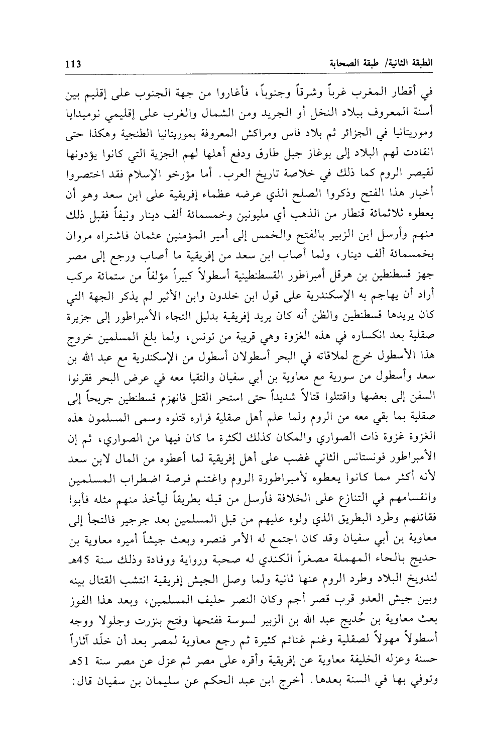في أقطار المغرب غرباً وشرقاً وجنوباً، فأغاروا من جهة الجنوب على إقليم بين أسنة المعروف ببلاد النخل أو الجريد ومن الشمال والغرب على إقليمي نوميدايا وموريتانيا في الجزائر ثم بلاد فاس ومراكش المعروفة بموريتانيا الطنجية وهكذا حتى انقادت لهم البلاد إلى بوغاز جبل طارق ودفع أهلها لهم الجزية التي كانوا يؤدونها لقيصر الروم كما ذلك في خلاصة تاريخ العرب. أما مؤرخو الإِسلام فقد اختصروا أخبار هذا الفتح وذكروا الصلح الذي عرضه عظماء إفريقية على ابن سعد وهو أن يعطوه ثلاثمائة قنطار من الذهب أي مليونين وخمسمائة ألف دينار ونيفاً فقبل ذلك منهم وأرسل ابن الزبير بالفتح والخمس إلى أمير المؤمنين عثمان فاشتراه مروان بخمسمائة ألف دينار، ولما أصاب ابن سعد من إفريقية ما أصاب ورجع إلى مصر جهز قسطنطين بن هرقل أمبراطور القسطنطينية أسطولاً كبيراً مؤلفاً من ستمائة مركب أراد أن يهاجم به الإسكندرية على قول ابن خلدون وابن الأثير لم يذكر الجهة التي كان يريدها قسطنطين والظن أنه كان يريد إفريقية بدليل التجاء الأمبراطور إلى جزيرة صقلية بعد انكساره في هذه الغزوة وهي قريبة من تونس، ولما بلغ المسلمين خروج هذا الأسطول خرج لملاقاته في البحر أسطولان أسطول من الإسكندرية مع عبد الله بن سعد وأسطول من سورية مع معاوية بن أبي سفيان والتقيا معه في عرض البحر فقرنوا السفن إلى بعضها واقتتلوا قتالاً شديداً حتى استحر القتل فانهزم قسطنطين جريحاً إلى صقلية بما بقي معه من الروم ولما علم أهل صقلية فراره قتلوه وسمى المسلمون هذه الغزوة غزوة ذات الصواري والمكان كذلك لكثرة ما كان فيها من الصواري، ثم إن الأمبراطور فونستانس الثاني غضب على أهل إفريقية لما أعطوه من المال لابن سعد لأنه أكثر مما كانوا يعطوه لأمبراطورة الروم واغتنم فرصة اضطراب المسلمين وانقسامهم في التنازع على الخلافة فأرسل من قبله بطريقاً ليأخذ منهم مثله فأبوا فقاتلهم وطرد البطريق الذي ولوه عليهم من قبل المسلمين بعد جرجير فالتجأ إلى معاوية بن أبي سفيان وقد كان اجتمع له الأمر فنصره وبعث جيشاً أميره معاوية بن حديج بالحاء المهملة مصغراً الكندي له صحبة ورواية ووفادة وذلك سنة 45 هـ لتدويخ البلاد وطرد الروم عنها ثانية ولما وصل الجيش إفريقية انتشب القتال بينه وبين جيش العدو قرب قصر أجم وكان النصر حليف المسلمين، وبعد هذا الفوز بعث معاوية بن حُديج عبد الله بن الزبير لسوسة ففتحها وفتح بنزرت وجلولا ووجه أسطولاً مهولاً لصقلية وغنم غنائم كثيرة ثم رجع معاوية لمصر بعد أن خلّد آثاراً حسنة وعزله الخليفة معاوية عن إفريقية وأقره على مصر ثم عزل عن مصر سنة 51 هـ وتوفي بها في السنة بعدها. أخرج ابن عبد الحكم عن سليمان بن سفيان قال: