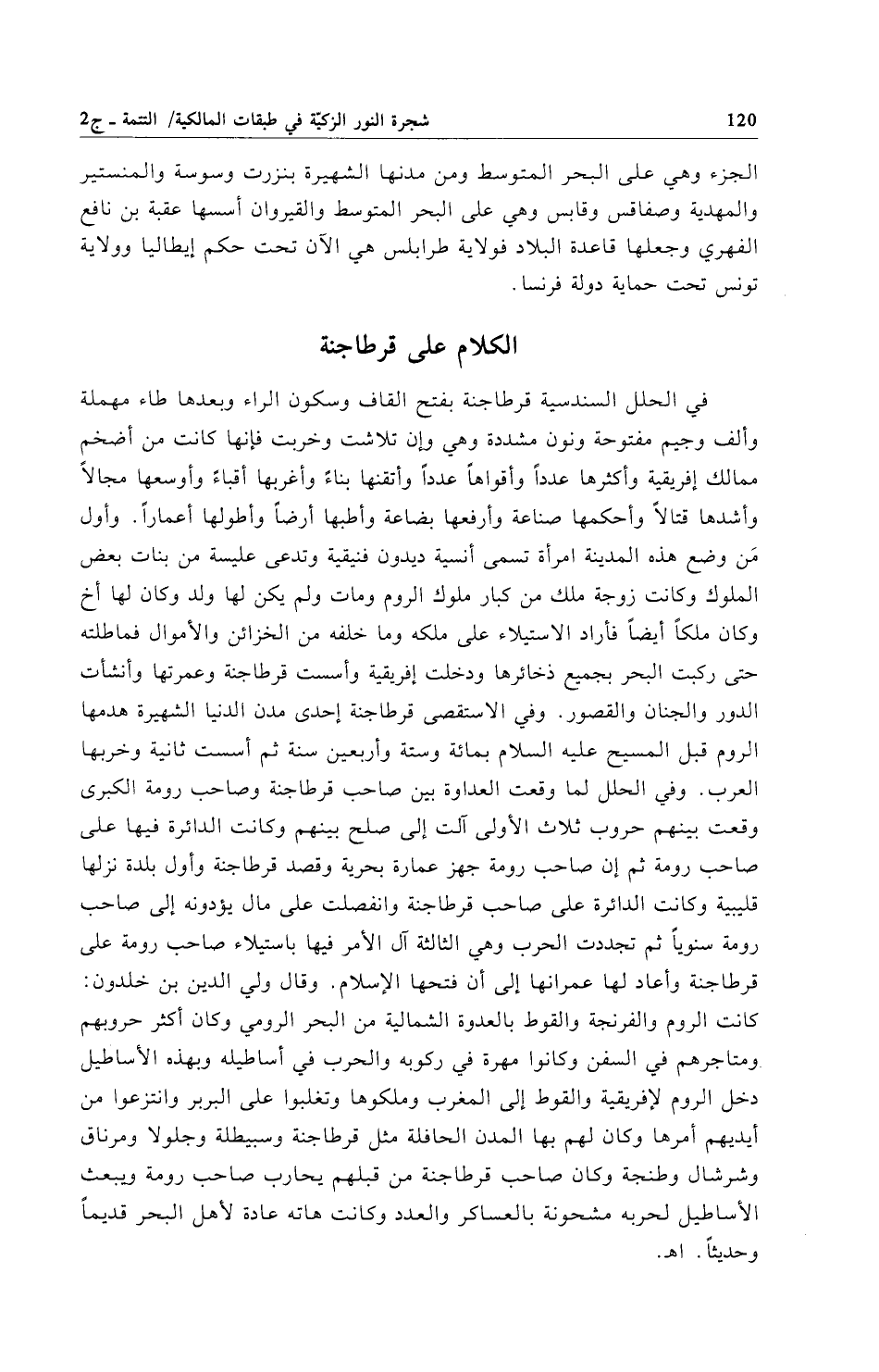 في الحلل السندسية قرطاجنة بفتح القاف وسكون الراء وبعدها طاء مهملة وألف وجيم مفتوحة ونون مشددة وهي وإن تلاشت وخربت فإنها كانت من أضخم ممالك إفريقية وأكثرها عدداً وأقواهاً عدداً وأتقنها بناءً وأغربها أقباءً وأوسعها مجالاً وأشدها قتالاً وأحكمها صناعة وأرفعها بضاعة وأطبها أرضاً وأطولها أعماراً. وأول مَن وضع هذه المدينة امرأة تسمى أنسية ديدون فنيقية وتدعى عليسة من بنات بعض الملوك وكانت زوجة ملك من كبار ملوك الروم ومات ولم يكن لها ولد وكان لها أخ وكان ملكاً أيضاً فأراد الاستيلاء على ملكه وما خلفه من الخزائن والأموال فماطلته حتى ركبت البحر بجميع ذخائرها ودخلت إفريقية وأسست قرطاجنة وعمرتها وأنشأت الدور والجنان والقصور. وفي الاستقصى قرطاجنة إحدى مدن الدنيا الشهيرة هدمها الروم قبل المسيح عليه السلام بمائة وستة وأربعين سنة ثم أسست ثانية وخربها العرب. وفي الحلل لما وقعت العداوة بين صاحب قرطاجنة وصاحب رومة الكبرى وقعت بينهم حروب ثلاث الأولى آلت إلى صلح بينهم وكانت الدائرة فيها على صاحب رومة ثم إن صاحب رومة جهز عمارة بحرية وقصد قرطاجنة وأول بلدة نزلها قليبية وكانت الدائرة على صاحب قرطاجنة وانفصلت على مال يؤدونه إلى صاحب رومة سنوياً ثم تجددت الحرب وهي الثالثة آل الأمر فيها باستيلاء صاحب رومة على قرطاجنة وأعاد لها عمرانها إلى أن فتحها الإِسلام. وقال ولي الدين بن خلدون: كانت الروم والفرنجة والقوط بالعدوة الشمالية من البحر الرومي وكان أكثر حروبهم ومتاجرهم في السفن وكانوا مهرة في ركوبه والحرب في أساطيله وبهذه الأساطيل دخل الروم لإفريقية والقوط إلى المغرب وملكوها وتغلبوا على البربر وانتزعوا من أيديهم أمرها وكان لهم بها المدن الحافلة مثل قرطاجنة وسبيطلة وجلولا ومرناق وشرشال وطنجة وكان صاحب قرطاجنة من قبلهم يحارب صاحب رومة ويبعث الأساطيل لحربه مشحونة بالعساكر والعدد وكانت هاته عادة لأهل البحر قديماً وحديثاً. اهـ.