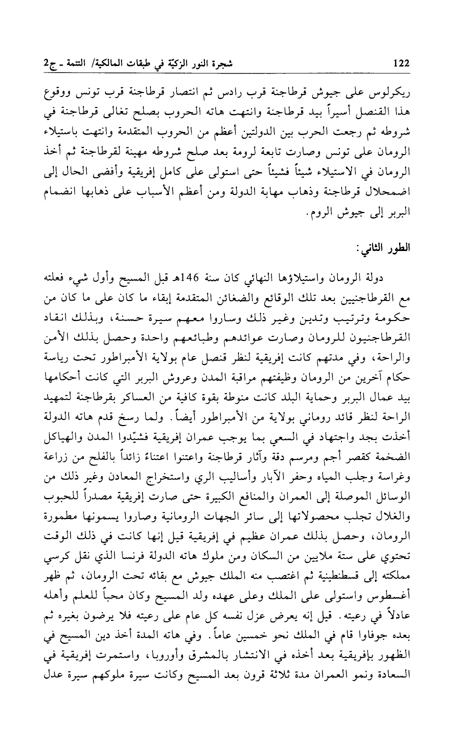دولة الرومان واستيلاؤها النهائي كان سنة 146 هـ قبل المسيح وأول شيء فعلته مع القرطاجنيين بعد تلك الوقائع والضغائن المتقدمة إبقاء ما كان على ما كان من حكومة وترتيب وتدين وغير ذلك وساروا معهم سيرة حسنة، وبذلك انقاد القرطاجنيون للرومان وصارت عوائدهم وطبائعهم واحدة وحصل بذلك الأمن والراحة، وفي مدتهم كانت إفريقية لنظر قنصل عام بولاية الأمبراطور تحت رياسة حكام آخرين من الرومان وظيفتهم مراقبة المدن وعروش البربر التي كانت أحكامها بيد عمال البربر وحماية البلد كانت منوطة بقوة كافية من العساكر بقرطاجنة لتمهيد الراحة لنظر قائد روماني بولاية من الأمبراطور أيضاً. ولما رسخ قدم هاته الدولة أخذت بجد واجتهاد في السعي بما يوجب عمران إفريقية فشيدوا المدن والهياكل الضخمة كقصر أجم ومرسم دقة وآثار قرطاجنة واعتنوا اعتناءً زائداً بالفلح من زراعة وغراسة وجلب المياه وحفر الآبار وأساليب الري واستخراج المعادن وغير ذلك من الوسائل الموصلة إلى العمران والمنافع الكبيرة حتى صارت إفريقية مصدراً للحبوب والغلال تجلب محصولاتها إلى سائر الجهات الرومانية وصاروا يسمونها مطمورة الرومان، وحصل بذلك عمران عظيم في إفريقية قيل إنها كانت في ذلك الوقت تحتوي على ستة ملايين من السكان ومن ملوك هاته الدولة فرنسا الذي نقل كرسي مملكته إلى قسطنطينية ثم اغتصب منه الملك جيوش مع بقائه تحت الرومان، ثم ظهر أغسطوس واستولى على الملك وعلى عهده ولد المسيح وكان محباً للعلم وأهله عادلاً في رعيته. قيل إنه يعرض عزل نفسه كل عام على رعيته فلا يرضون بغيره ثم بعده جوفاوا قام في الملك نحو خمسين عاماً. وفي هاته المدة أخذ دين المسيح في الظهور بإفريقية بعد أخذه في الانتشار بالمشرق وأوروبا، واستمرت إفريقية في السعادة ونمو العمران مدة ثلاثة قرون بعد المسيح وكانت سيرة ملوكهم سيرة عدل