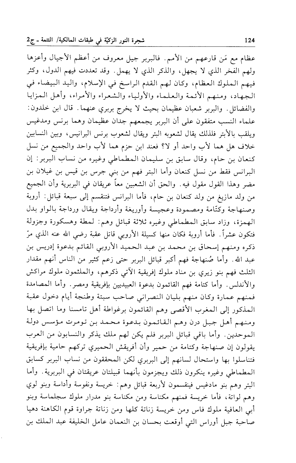 عظام مع مَن قارعهم من الأمم. فالبربر جيل معروف من أعظم الأجيال وأعزها ولهم الفخر الذي لا يجهل، والذكر الذي لا يهمل. وقد تعددت فيهم الدول، وكثر فيهم الملوك العظام، وكان لهم القدم الراسخ في الإِسلام، واليد البيضاء في الجهاد، ومنهم الأئمة والعلماء والأولياء والشعراء والأمراء، وأهل المزايا والفضائل. والبربر شعبان عظيمان بحيث لا يخرج بربري عنهما. قال ابن خلدون: علماء النسب متفقون على أن البربر يجمعهم جدان عظيمان وهما برنس ومدغيس ويلقب بالأبتر فلذلك يقال لشعوبه البتر ويقال لشعوب برنس البرانيس، وبين النسابين خلاف هل هما لأب واحد أو لا؟ فعند ابن حزم هما لأب واحد والجميع من نسل كنعان بن حام، وقال سابق بن سليمان المطماطي وغيره من نساب البربر: إن البرانس فقط من نسل كنعان وأما البتر فهم من بني جرس بن قيس بن غيلان بن مضر وهذا القول مقول فيه. والحق أن الشعبين معاً عريقان في البربرية وأن الجميع من ولد مازيغ من ولد كنعان بن حام، فأما البرانس فتنقسم إلى سبعة قبائل: أروبة وصنهاجة وكتّامة ومصمودة وعجيسة وأوريغة وأرداجة ويقال ورداجة بالواو بدل الهمزة، وزاد سابق المطماطي وغيره ثلاثة قبائل وهم: لمطة وهسكورة وجزولة فتكون عشراً. فأما أروبة فكان منها كسيلة الأروبي قاتل عقبة رضي الله عنه الذي مرّ ذكره ومنهم إسحاق بن محمَّد بن عبد الحميد الأروبي القائم بدعوة إدريس بن عبد الله. وأما صُنهاجة فهم أكبر قبائل البربر حتى زعم كثير من الناس أنهم مقدار الثلث فهم بنو زيري بن مناد ملوك إفريقية الآتي ذكرهم، والملثمون ملوك مراكش والأندلس. وأما كتامة فهم القائمون بدعوة العبيديين بإفريقية ومصر. وأما المصامدة فمنهم عمارة وكان منهم بليان النصراني صاحب سبتة وطنجة أيام دخول عقبة المذكور إلى المغرب الأقصى وهم القائمون برغواطة أهل تامسنا وما اتصل بها ومنهم أهل جبل درن وهم القائمون بدعوة محمَّد بن تومرت مؤسس دولة الموحدين. وأما باقي قبائل البربر فلم يكن لهم ملك يذكر والنسابون من العرب يقولون إن صنهاجة وكتامة من حمير وأن أفريقش الحميري تركهم حامية بإفريقية فتناسلوا بها واستحال لسانهم إلى البربري لكن المحققون من نساب البربر كسابق المطماطي وغيره ينكرون ذلك ويجزمون بأنهما قبيلتان عريقتان في البربرية. وأما البتر وهم بنو مادغيس فينقسمون لأربعة قبائل وهم: خريسة ونفوسة وأداسة وبنو لوي وهم لواتة، فأما خريسة فمنهم مكناسة ومن مكناسة بنو مدرار ملوك سجلماسة وبنو أبي العافية ملوك فاس ومن خريسة زناتة كلها ومن زناتة جراوة قوم الكاهنة دهيا صاحبة جبل أوراس التي أوقعت بحسان بن النعمان عامل الخليفة عبد الملك بن