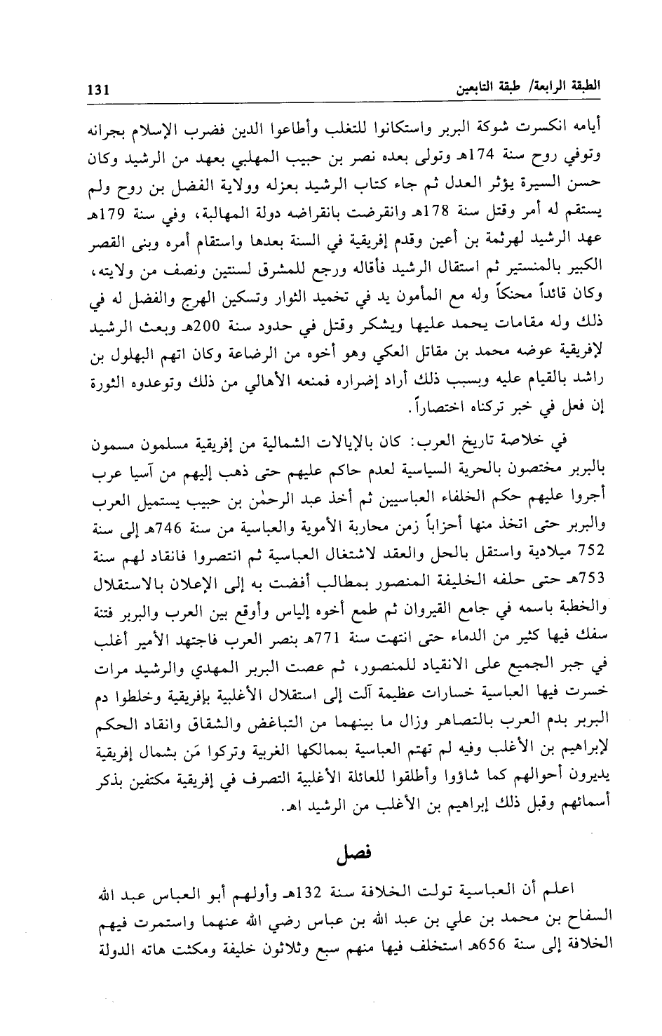 في خلاصة تاريخ العرب: كان بالإيالات الشمالية من إفريقية مسلمون مسمون بالبربر مختصون بالحرية السياسية لعدم حاكم عليهم حتى ذهب إليهم من آسيا عرب أجروا عليهم حكم الخلفاء العباسيين ثم أخذ عبد الرحمن بن حبيب يستميل العرب والبربر حتى اتخذ منها أحزاباً زمن محاربة الأموية والعباسية من سنة 746 هـ إلى سنة 752 ميلادية واستقل بالحل والعقد لاشتغال العباسية ثم انتصروا فانقاد لهم سنة 753 هـ حتى حلفه الخليفة المنصور بمطالب أفضت به إلى الإعلان بالاستقلال والخطبة باسمه في جامع القيروان ثم طمع أخوه إلياس وأوقع بين العرب والبربر فتنة سفك فيها كثير من الدماء حتى انتهت سنة 771 هـ بنصر العرب فاجتهد الأمير أغلب في جبر الجميع على الانقياد للمنصور، ثم عصت البربر المهدي والرشيد مرات خسرت فيها العباسية خسارات عظيمة آلت إلى استقلال الأغلبية بإفريقية وخلطوا دم البربر بدم العرب بالتصاهر وزال ما بينهما من التباغض والشقاق وانقاد الحكم لإبراهيم بن الأغلب وفيه لم تهتم العباسية بممالكها الغربية وتركوا مَن بشمال إفريقية يديرون أحوالهم كما شاؤوا وأطلقوا للعائلة الأغلبية التصرف في إفريقية مكتفين بذكر أسمائهم وقبل ذلك إبراهيم بن الأغلب من الرشيد اهـ.