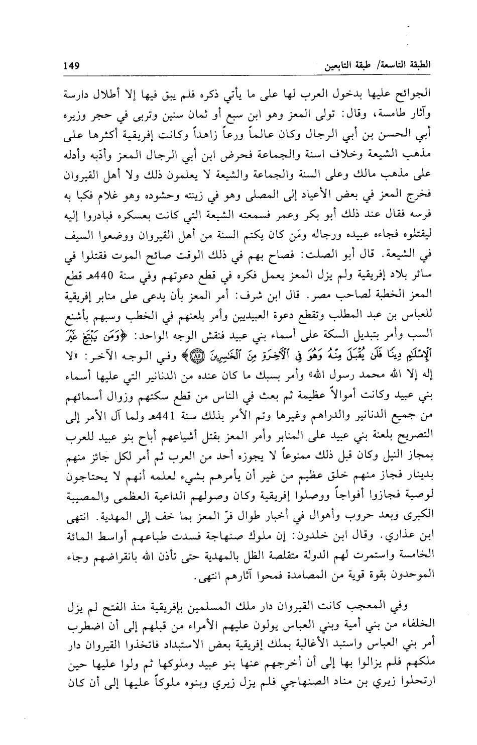 الجوائح عليها بدخول العرب لها على ما يأتي ذكره فلم يبق فيها إلا أطلال دارسة وآثار طامسة، وقال: تولى المعز وهو ابن سبع أو ثمان سنين وتربى في حجر وزيره أبي الحسن بن أبي الرجال وكان عالماً ورعاً زاهداً وكانت إفريقية أكثرها على مذهب الشيعة وخلاف السنة والجماعة فحرض ابن أبي الرجال المعز وأدّبه وأدله على مذهب مالك وعلى السنة والجماعة والشيعة لا يعلمون ذلك ولا أهل القيروان فخرج المعز في بعض الأعياد إلى المصلى وهو في زينته وحشوده وهو غلام فكبا به فرسه فقال عند ذلك أبو بكر وعمر فسمعته الشيعة التي كانت بعسكره فبادروا إليه ليقتلوه فجاءه عبيده ورجاله ومَن كان يكتم السنة من أهل القيروان ووضعوا السيف في الشيعة. قال أبو الصلت: فصاح بهم في ذلك الوقت صائح الموت فقتلوا في سائر بلاد إفريقية ولم يزل المعز يعمل فكره في قطع دعوتهم وفي سنة 440 هـ قطع المعز الخطبة لصاحب مصر. قال ابن شرف: أمر المعز بأن يدعى على منابر إفريقية للعباس بن عبد المطلب وتقطع دعوة العبيديين وأمر بلعنهم في الخطب وسبهم بأشنع السب وأمر بتبديل السكة على أسماء بني عبيد فنقش الوجه الواحد: {وَمَنْ يَبْتَغِ غَيْرَ الْإِسْلَامِ دِينًا فَلَنْ يُقْبَلَ مِنْهُ وَهُوَ فِي الْآخِرَةِ مِنَ الْخَاسِرِينَ (85)} وفي الوجه الآخر: "لا إله إلا الله محمَّد رسول الله" وأمر بسبك ما كان عنده من الدنانير التي عليها أسماء بني عبيد وكانت أموالاً عظيمة ثم بعث في الناس من قطع سكتهم وزوال أسمائهم من جميع الدنانير والدراهم وغيرها وتم الأمر بذلك سنة 441 هـ ولما آل الأمر إلى التصريح بلعنة بني عبيد على المنابر وأمر المعز بقتل أشياعهم أباح بنو عبيد للعرب بمجاز النيل وكان قبل ذلك ممنوعاً لا يجوزه أحد من العرب ثم أمر لكل جائز منهم بدينار فجاز منهم خلق عظيم من غير أن بأمرهم بشيء لعلمه أنهم لا يحتاجون لوصية فجازوا أفواجاً ووصلوا إفريقية وكان وصولهم الداعية العظمى والمصيبة الكبرى وبعد حروب وأهوال في أخبار طوال فرّ المعز بما خف إلى المهدية. انتهى ابن عذاري. وقال ابن خلدون: إن ملوك صنهاجة فسدت طباعهم أواسط المائة الخامسة واستمرت لهم الدولة متقلصة الظل بالمهدية حتى تأذن الله بانقراضهم وجاء الموحدون بقوة قوية من المصامدة فمحوا آثارهم انتهى.