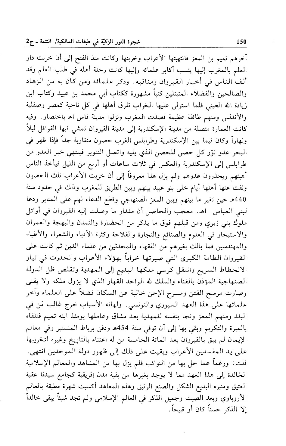 آخرهم تميم بن المعز فانتهبتها الأعراب وخربتها وكانت منذ الفتح إلى أن خربت دار العلم بالمغرب إليها ينسب أكابر علمائه وإليها كانت رحلة أهله في طلب العلم وقد ألف الناس في أخبار القيروان ومناقبه. وذكر علمائه ومن كان به من الزهاد والصالحين والفضلاء المتبتلين كتباً مشهورة ككتاب أبي محمَّد بن عبيد وكتاب ابن زيادة الله الطبني فلما استولى عليها الخراب تفرق أهلها في كل ناحية كمصر وصقلية والأندلس ومنهم طائفة عظيمة قصدت المغرب ونزلوا مدينة فاس اهـ باختصار. وفيه كانت العمارة متصلة من مدينة الإسكندرية إلى مدينة القيروان تمشي فيها القوافل ليلاً ونهاراً وكان فيما بين الإسكندرية وطرابلس الغرب حصون متقاربة جداً فإذا ظهر في البحر عدو نوّر كل حصن للحصن الذي يليه واتصل التنوير فينتهي خبر العدو من طرابلس إلى الإسكندرية والعكس في ثلاث ساعات أو أربع من الليل فيأخذ الناس أهبتهم ويحذرون عدوهم ولم يزل هذا معروفاً إلى أن خربت الأعراب تلك الحصون ونفت عنها أهلها أيام خلى بنو عبيد بينهم وبين الطريق للمغرب وذلك في حدود سنة 440 هـ حين تغير ما بينهم وبين المعز الصنهاجي وقطع الدعاء لهم على المنابر ودعا لبني العباس. اهـ. معجب والحاصل أن مقدار ما وصلت إليه القيروان في أوائل ملوك بني زيري ومن قبلهم فوق ما يذكر من الحضارة والتمدن والبهجة والعمران والاستبحار في العلوم والصنائع والتجارة والفلاحة وكثرة الأدباء والشعراء والأطباء والمهندسين فما بالك بغيرهم من الفقهاء والمحدثين من علماء الدين ثم كانت على القيروان الطامة الكبرى التي صيرتها خراباً بهؤلاء الأعراب وانحدرت في تيار الانحطاط السريع وانتقل كرسي ملكها البديع إلى المهدية وتقلص ظل الدولة الصنهاجية المؤذن بالفناء والملك لله الواحد القهار الذي لا يزول ملكه ولا يفنى وصارت مرسح الفتن ومسرح الإحن خالية عن السكان فضلاً على العلماء وآخر علمائها على هذا العهد السيوري والتونسي. ولهاته الأسباب خرج غالب مَن في البلد ومنهم المعز ونجا بنفسه للمهدية بعد مشاق وعاملها يومئذ ابنه تميم فتلقاه بالمبرة والتكريم وبقي بها إلى أن توفي سنة 454 هـ ودفن برباط المنستير وفي معالم الإيمان لم يبق بالقيروان بعد المائة الخامسة من له اعتناء بالتاريخ وغيره لتخريبها على يد المفسدين الأعراب وبقيت على ذلك إلى ظهور دولة الموحدين انتهى. قلت: ورغماً عما حل بها من النوائب فلم يزل بها من المشاهد والمعالم الإِسلامية الخالدة إلى هذا العهد مما لا يوجد بغيرها من بقية مدن إفريقية كجامع سيدنا عقبة العتيق ومنبره البديع الشكل والصنع الوثيق وهذه المعاهد أكسبت شهرة مطبقة بالعالم الأروباوي وبعد الصيت وجميل الذكر في العالم الإِسلامي ولم تجد شيئاً يبقى خالداً إلا الذكر حسناً كان أو قبيحاً.